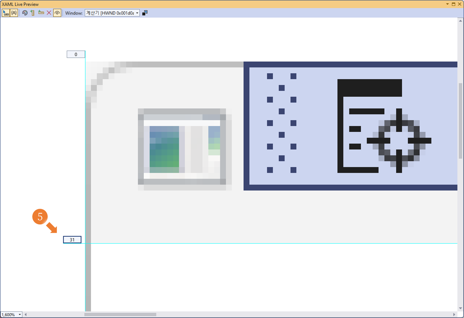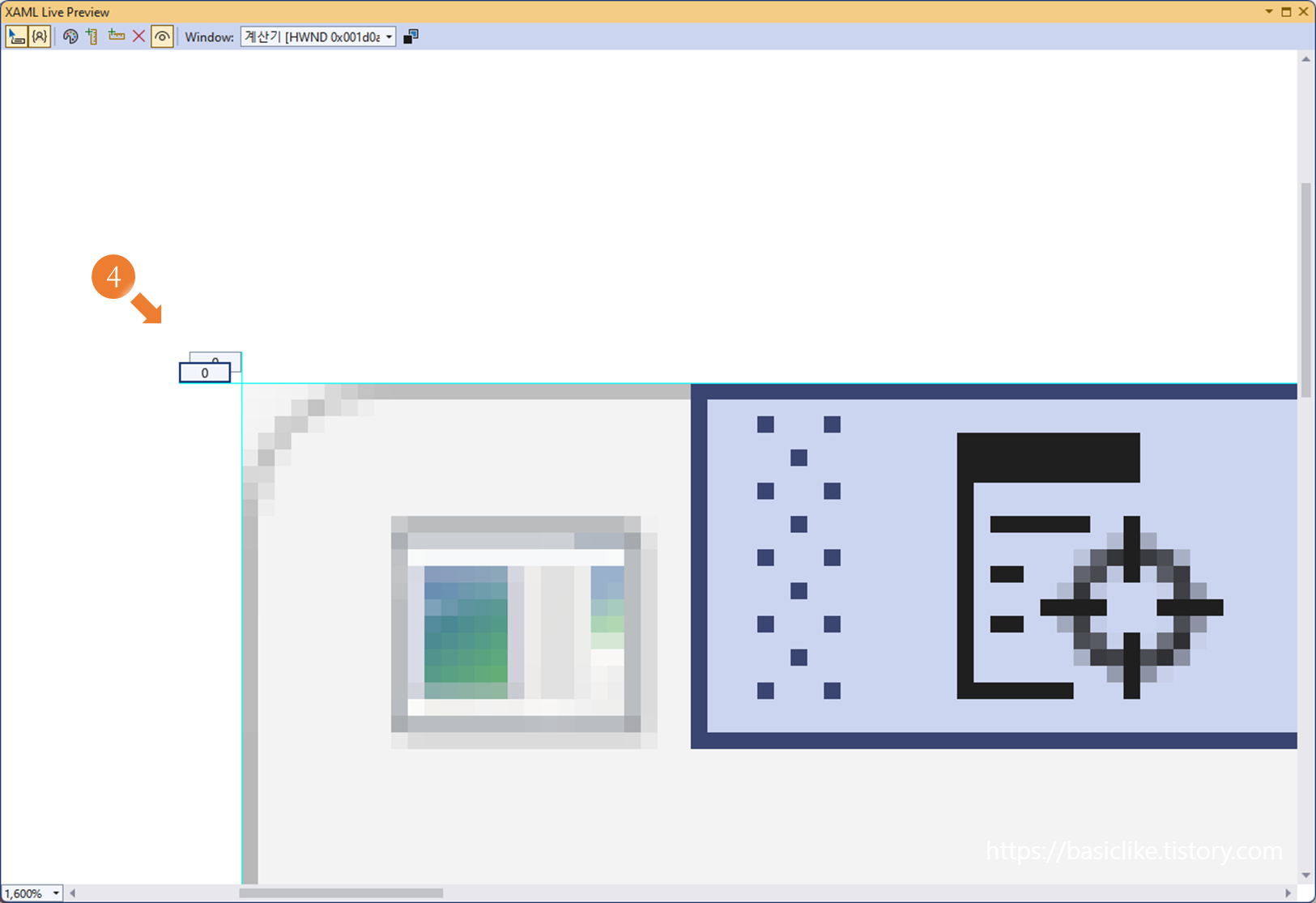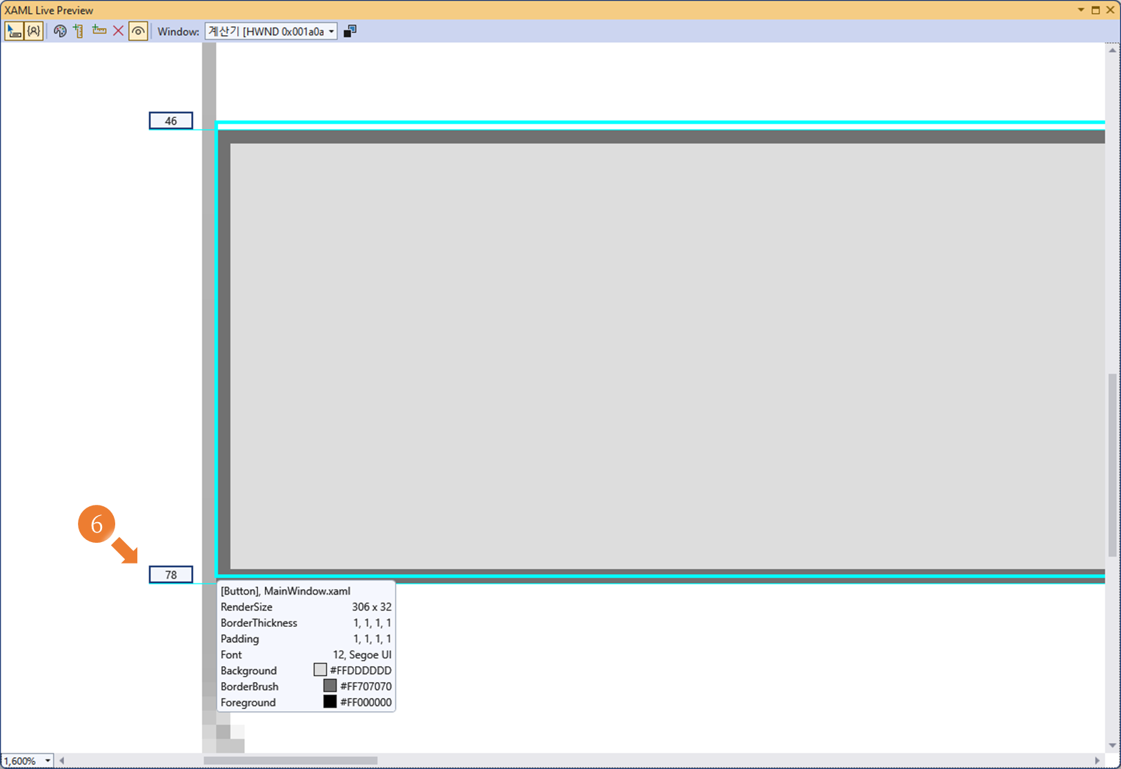 디버깅 모드에서, XAML Live Preview에서 값을 확인하며 높이와 너비를 조정한다.
