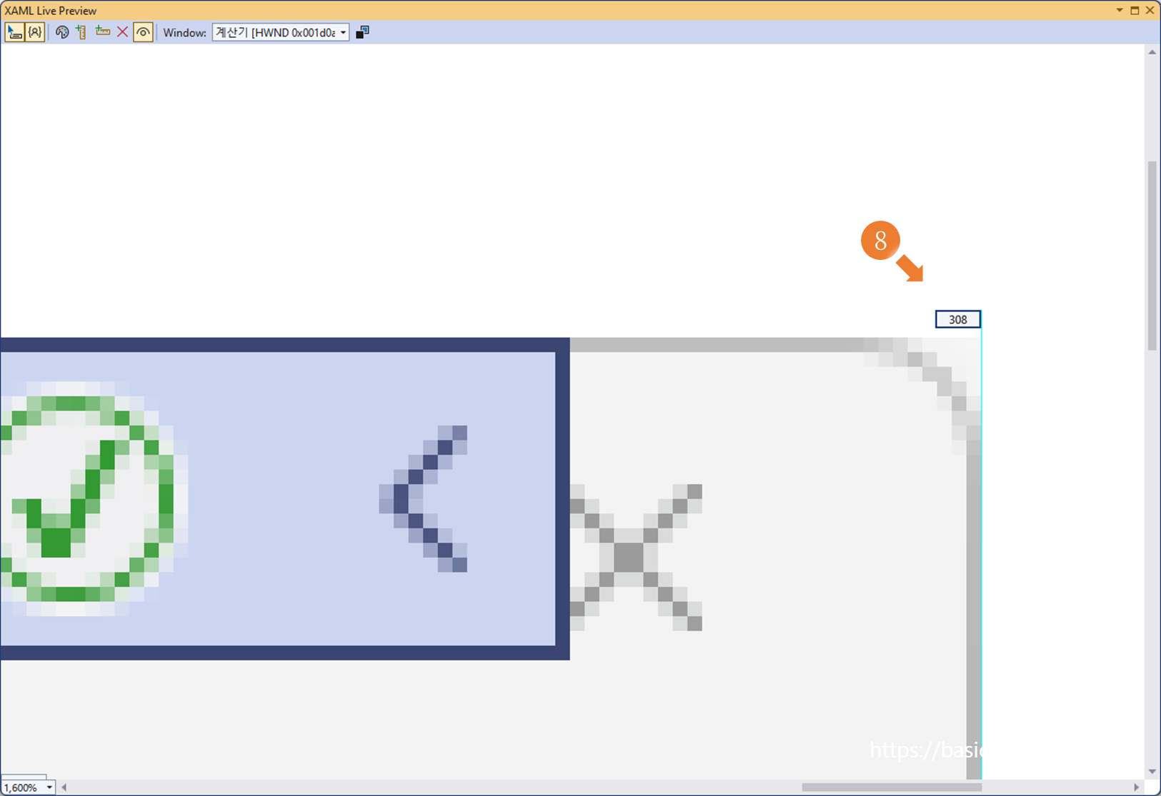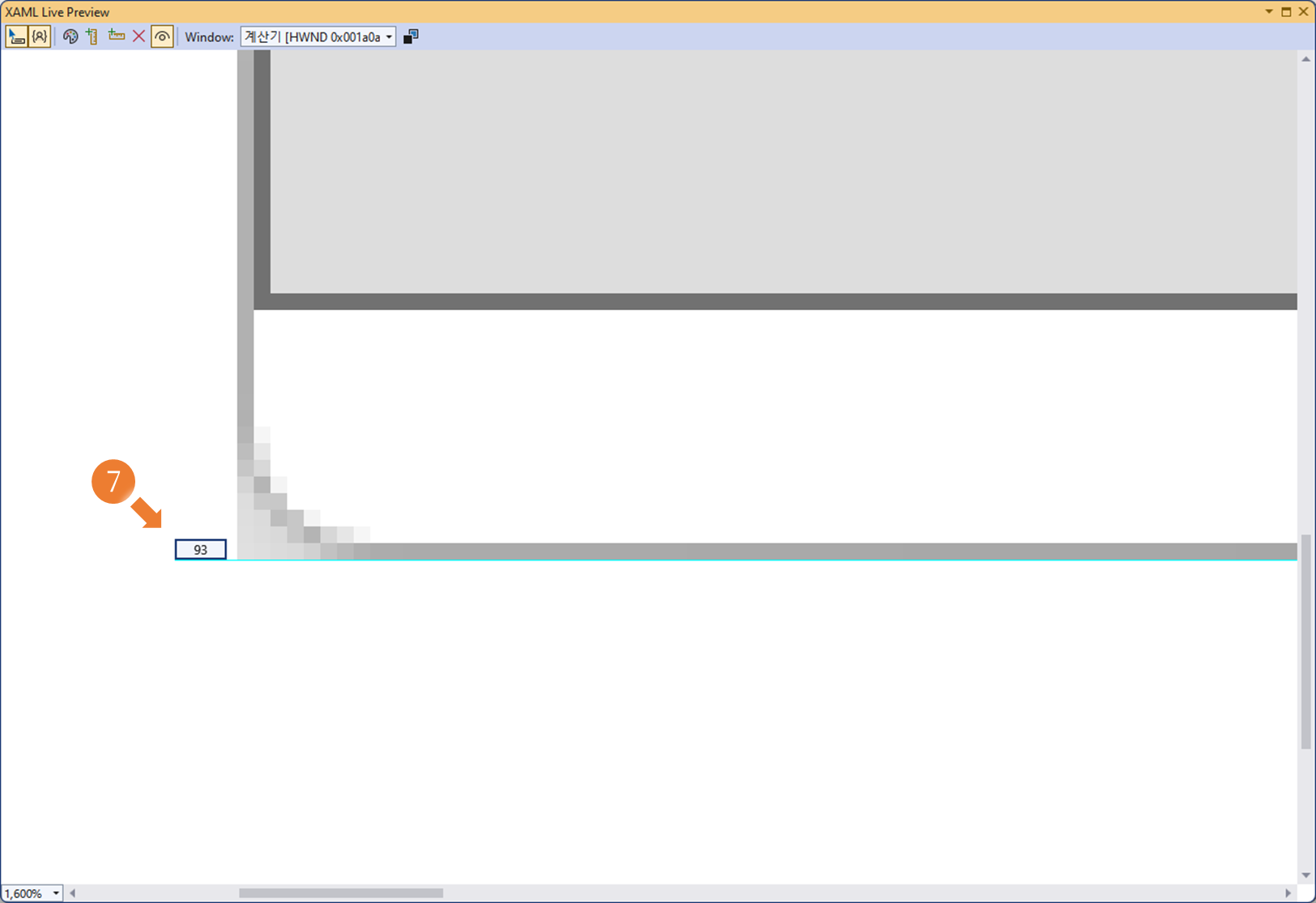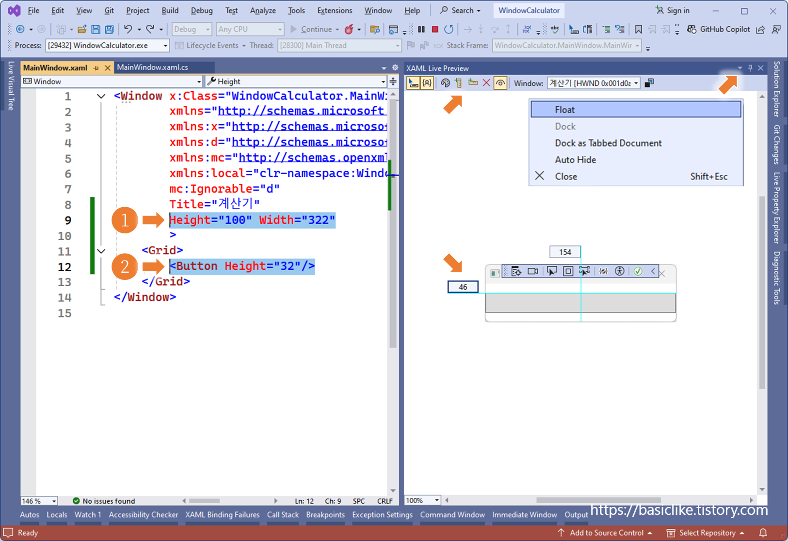디버깅 모드에서, XAML Live Preview에서 값을 확인하며 높이와 너비를 조정한다.