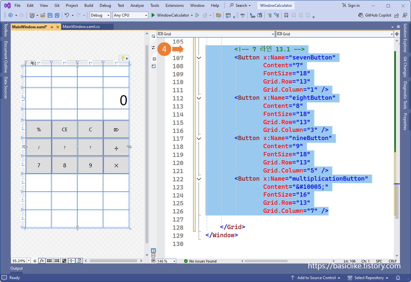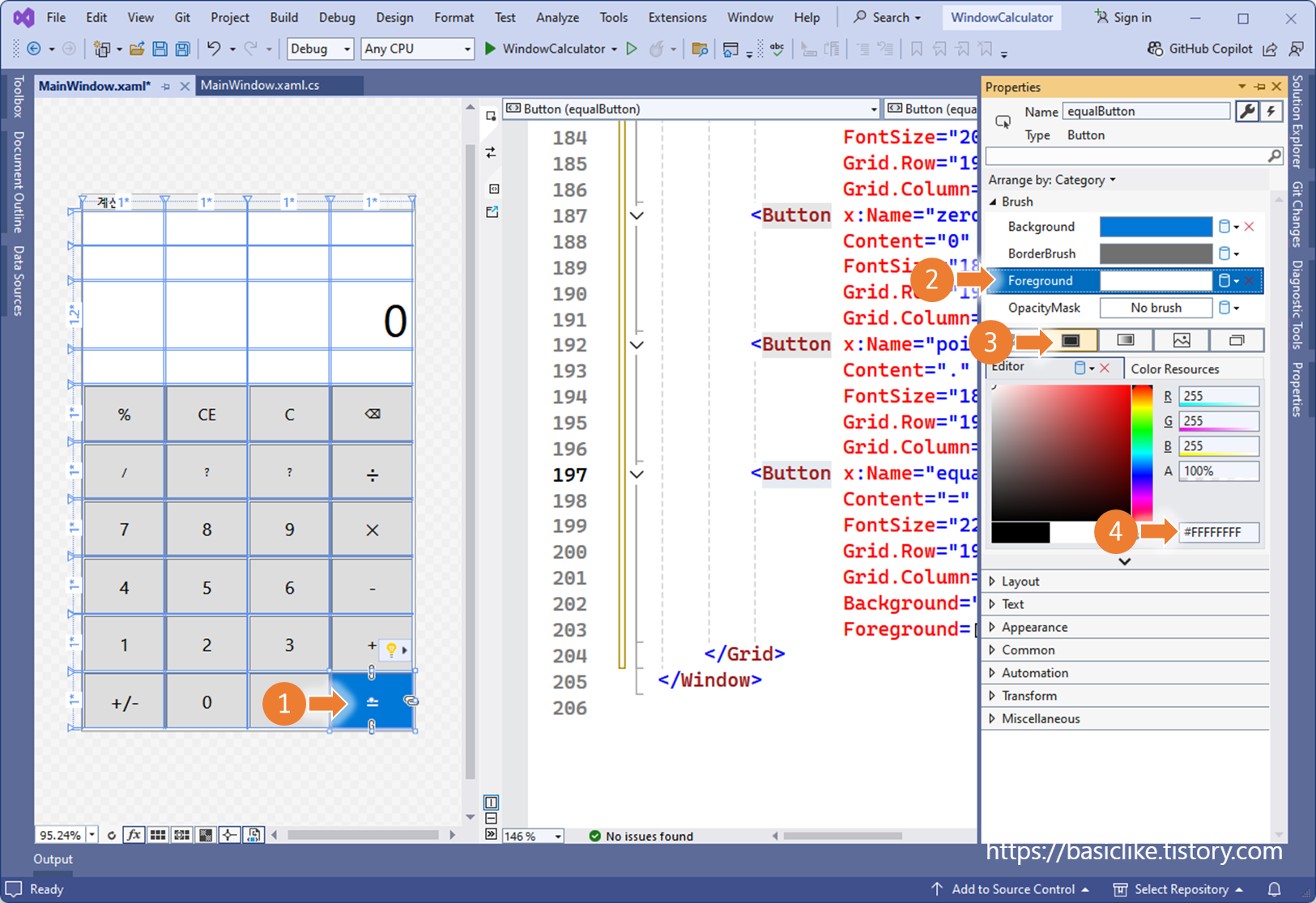 ❹ 하얀색(#FFFFFFFF) 색상코드를 입력하고 저장하면, 자동으로 XAML에 반영된다.