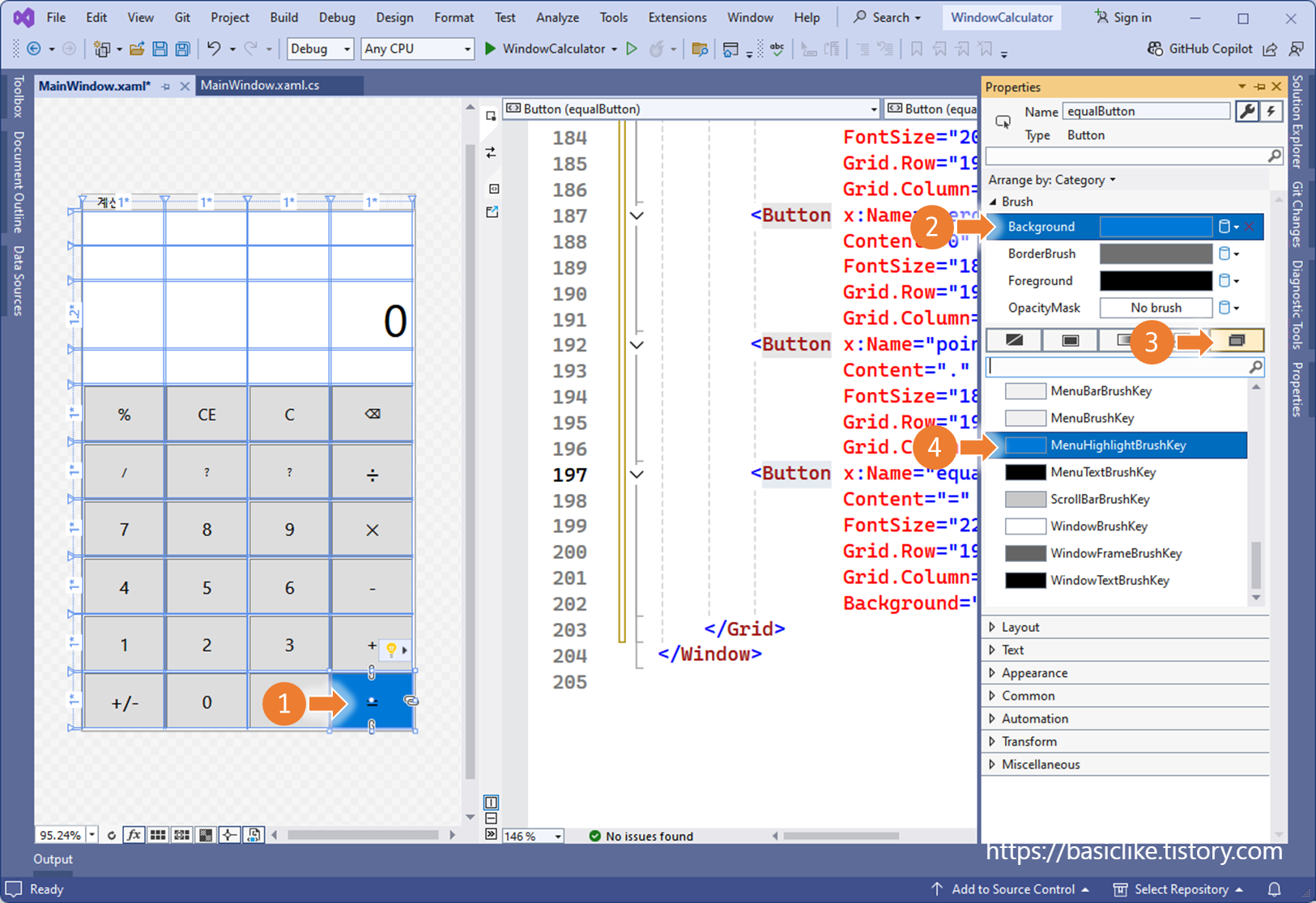 ❹ MenuHighlightBrushKey 색을 고르고 저장하면, 자동으로 XAML에 반영된다.