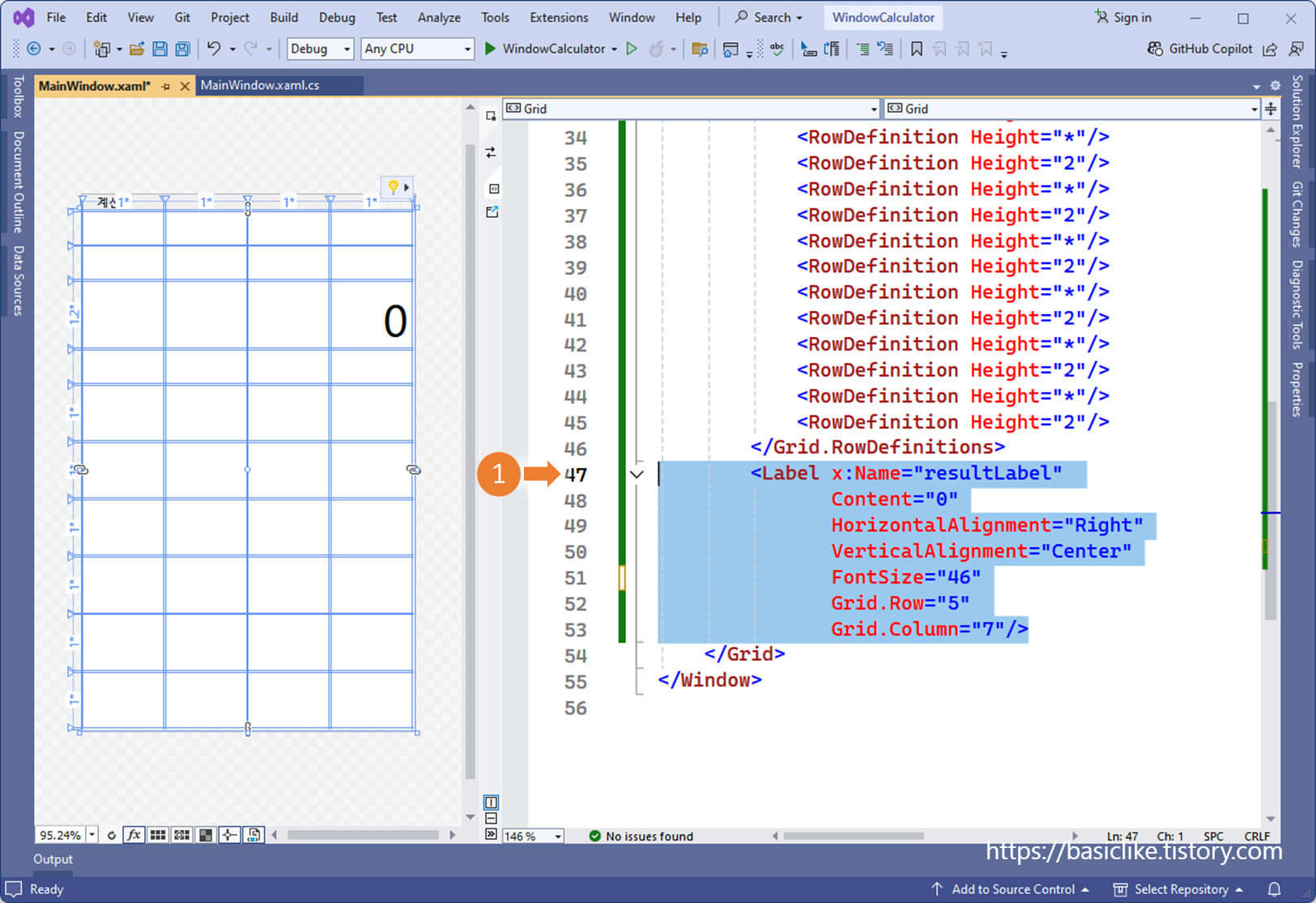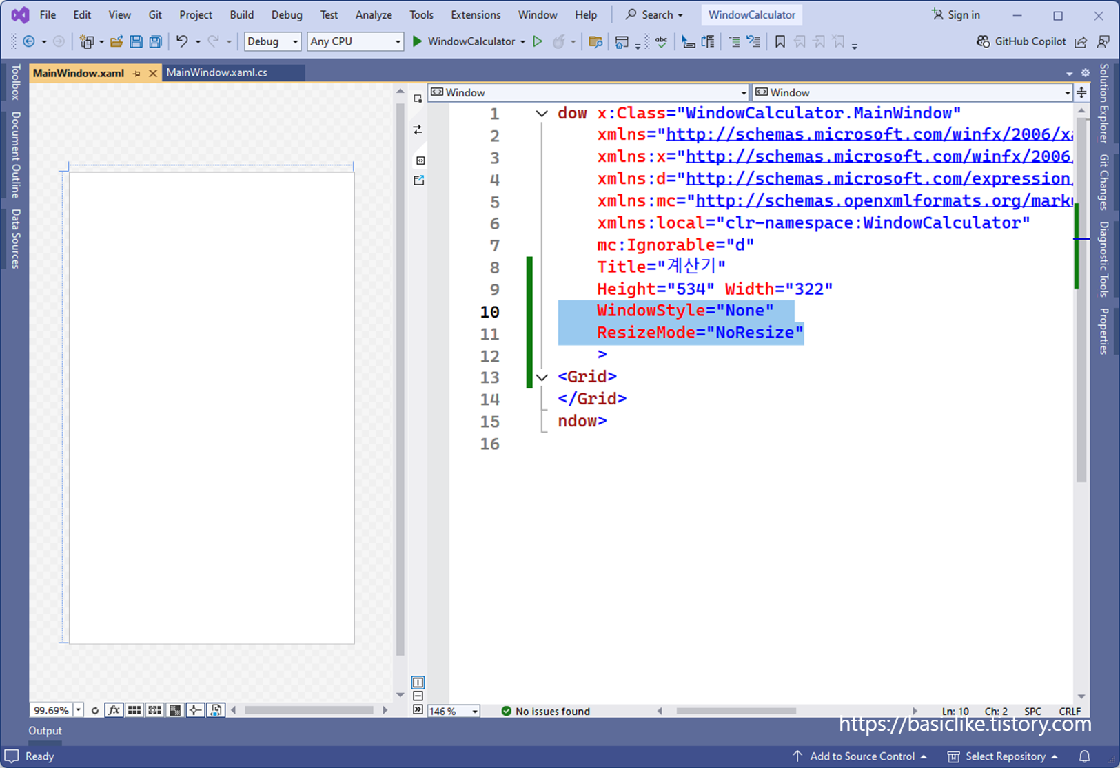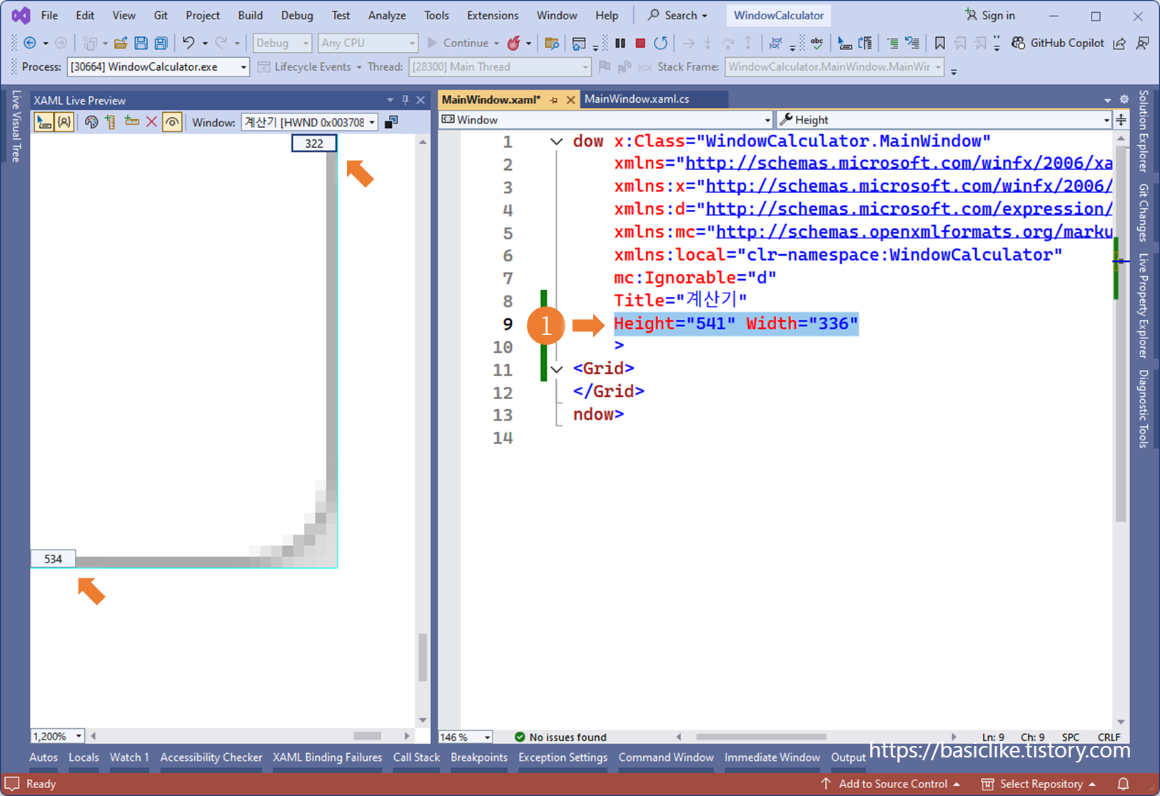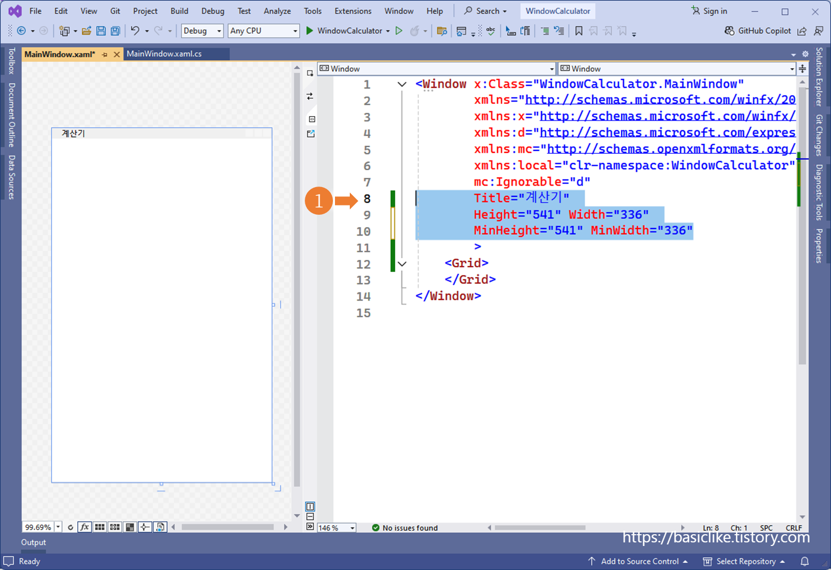 ① XAML 소스코드에서 타이틀, 높이, 너비 속성값 변경