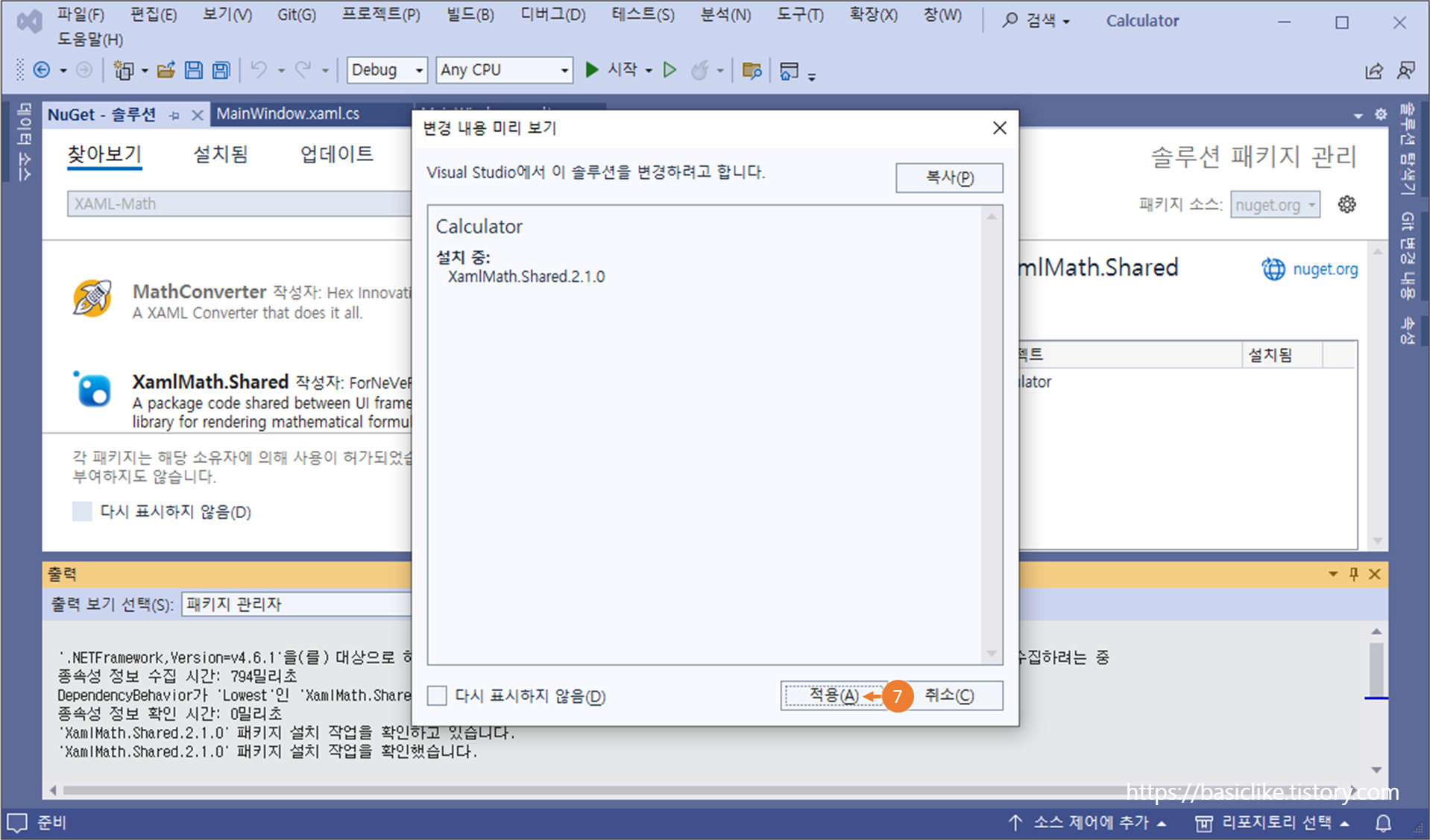 ⑦ 변경 내용 미리보기 알림에서, 설치 할 패키지와 버전을 확인 후 "적용"을 눌러 설치를 진행합니다.