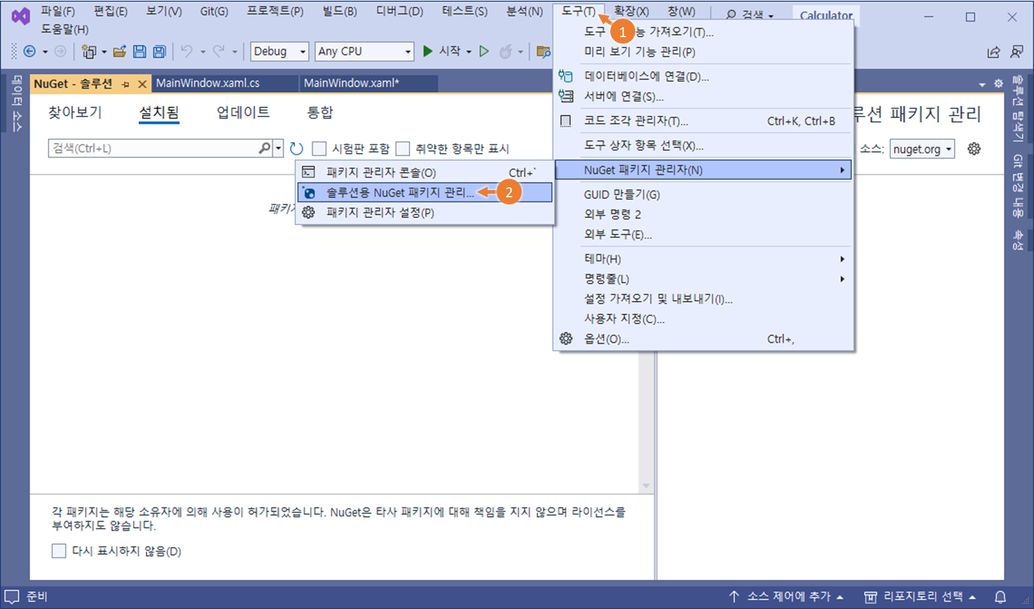 ② "NuGet 패키지 관리자(N)" ⏩ "솔루션용 NuGet 패키지 관리"를 실행합니다.