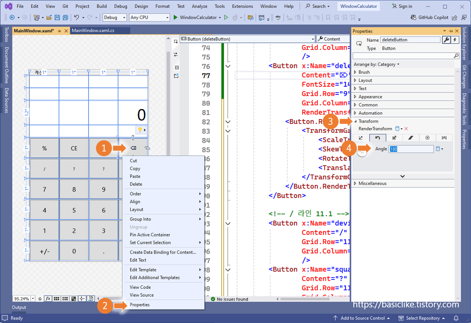 ❸ 버튼 속성의 Transform의 두번째 탭에 Angle 속성을 180으로 설정후 저장하면, ❹ <Button.RenderTransform>에 해당하는 태그가 자동으로 추가된다. Content 속성값 출력이 방향이 180도 바뀐다.