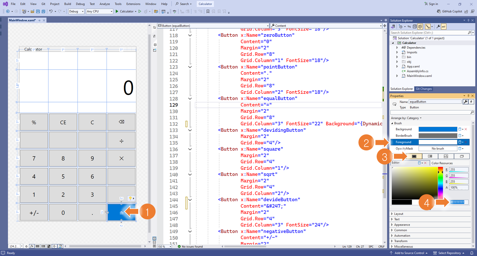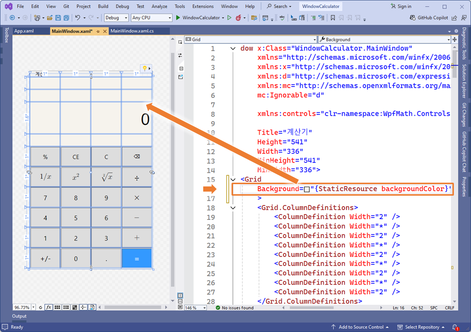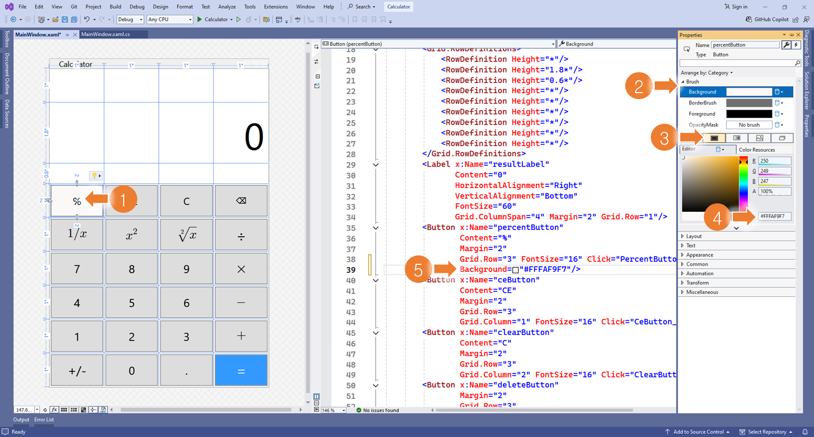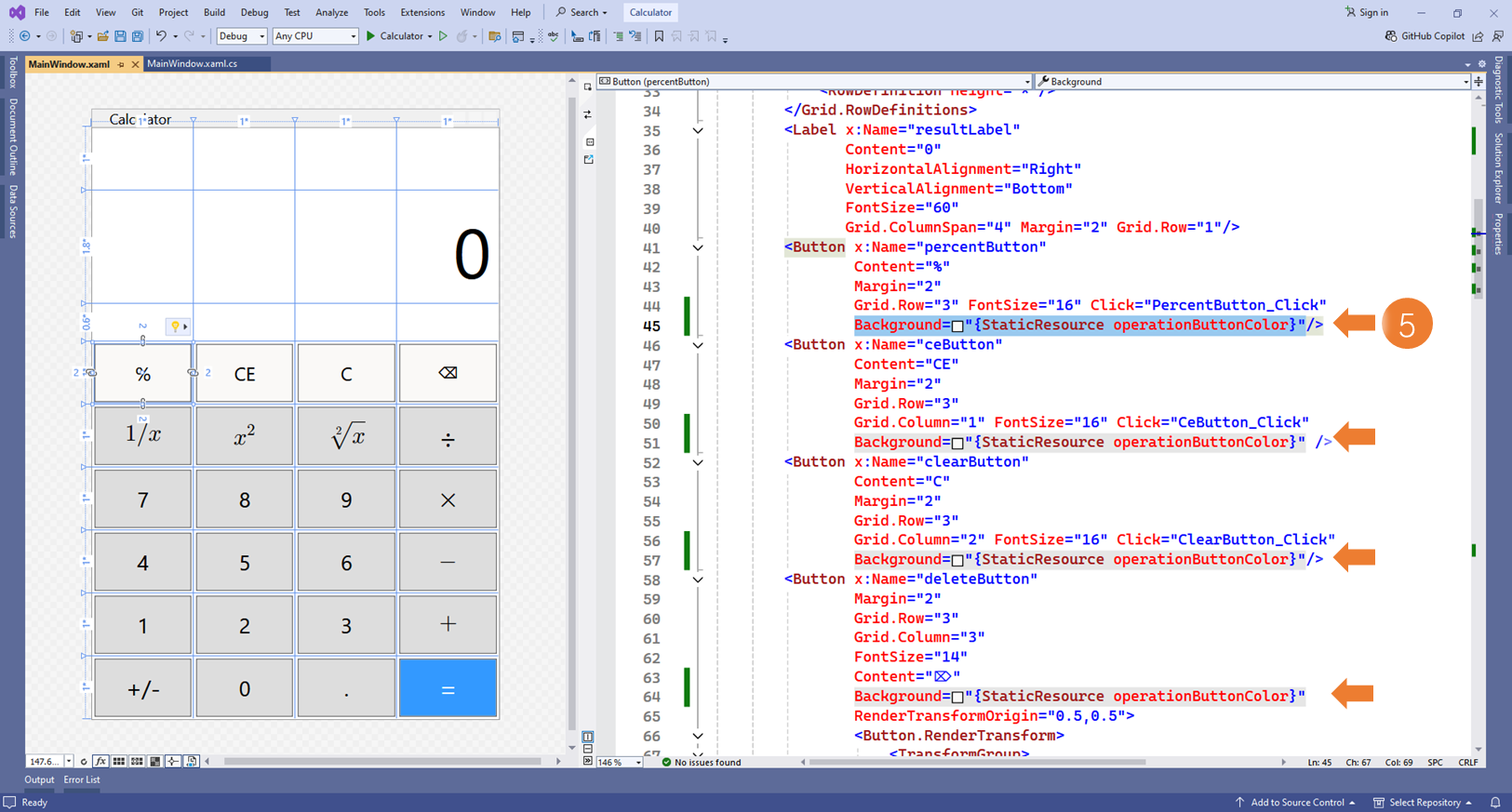 ❺ 자동으로 XAML에 버튼 컨트롤의 Backgroud 속성에 반영된다.