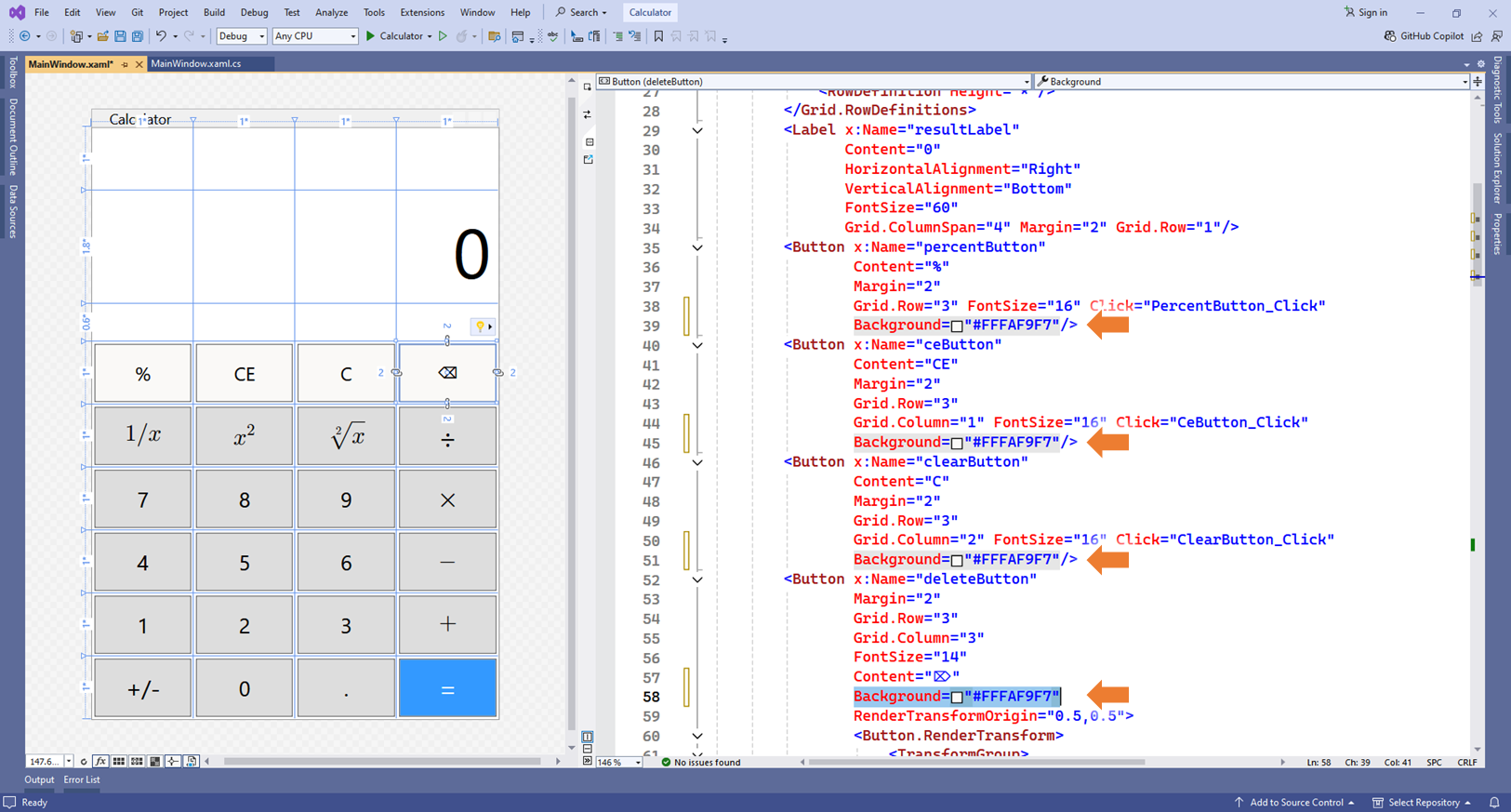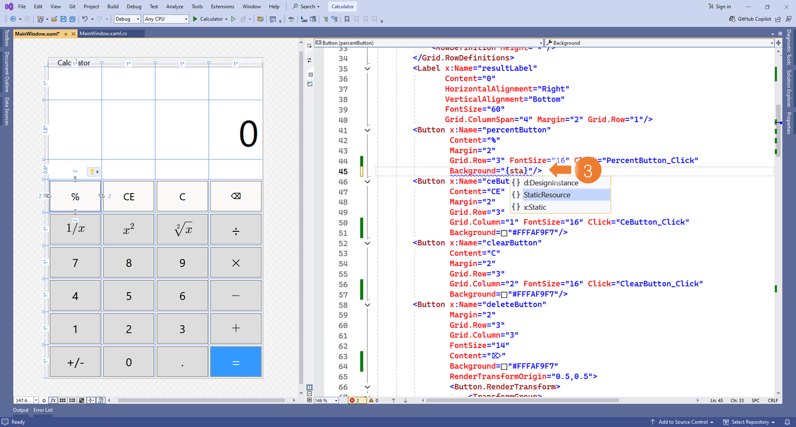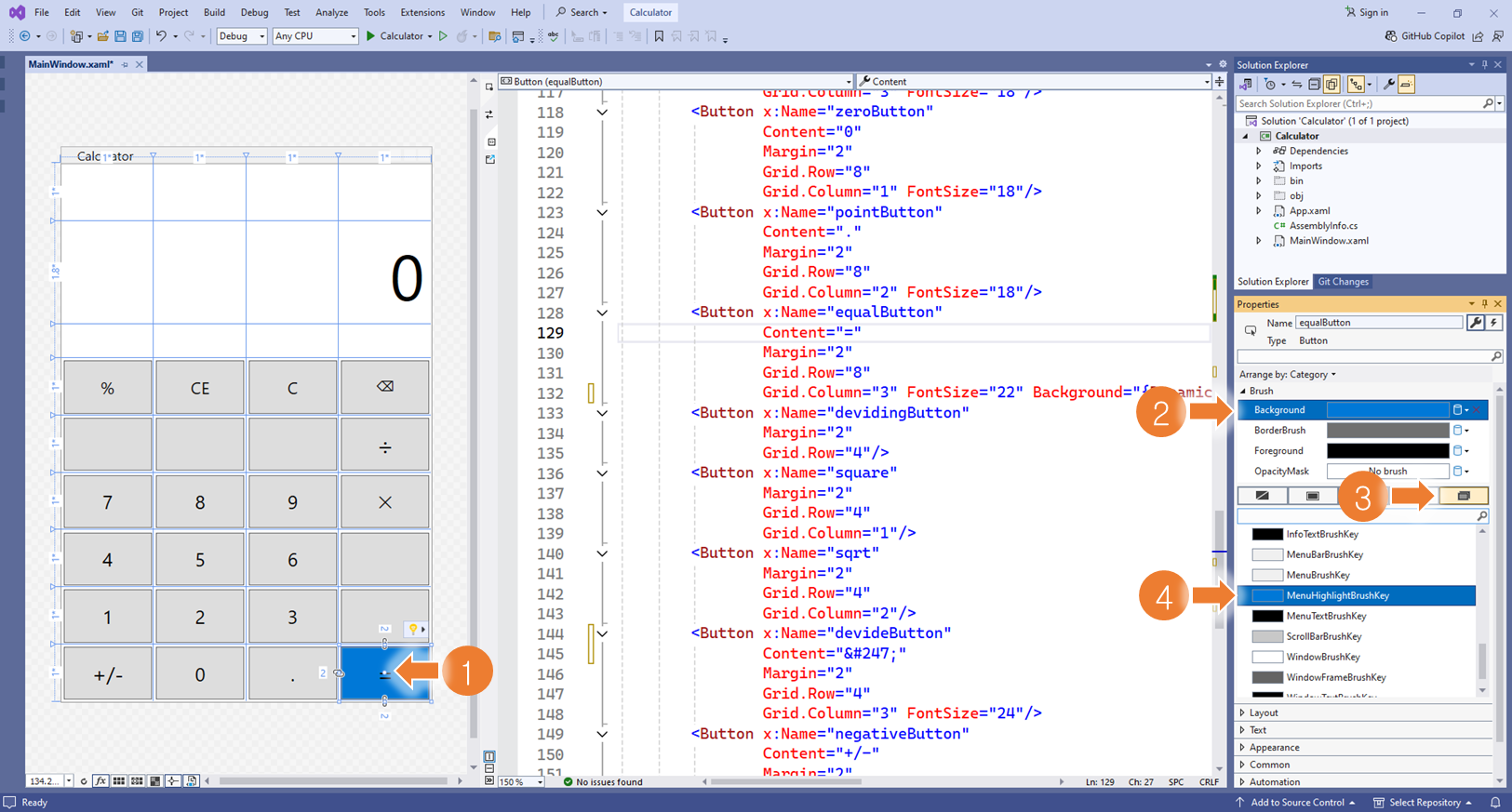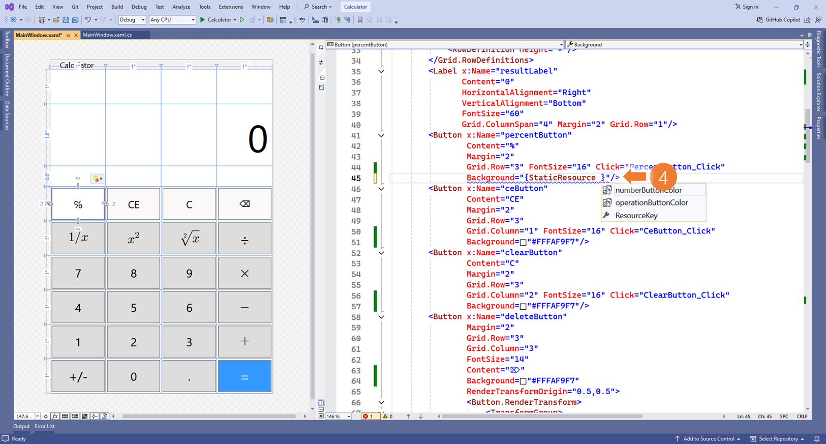 ❺ 자동으로 XAML에 버튼 컨트롤의 Backgroud 속성에 반영된다.
