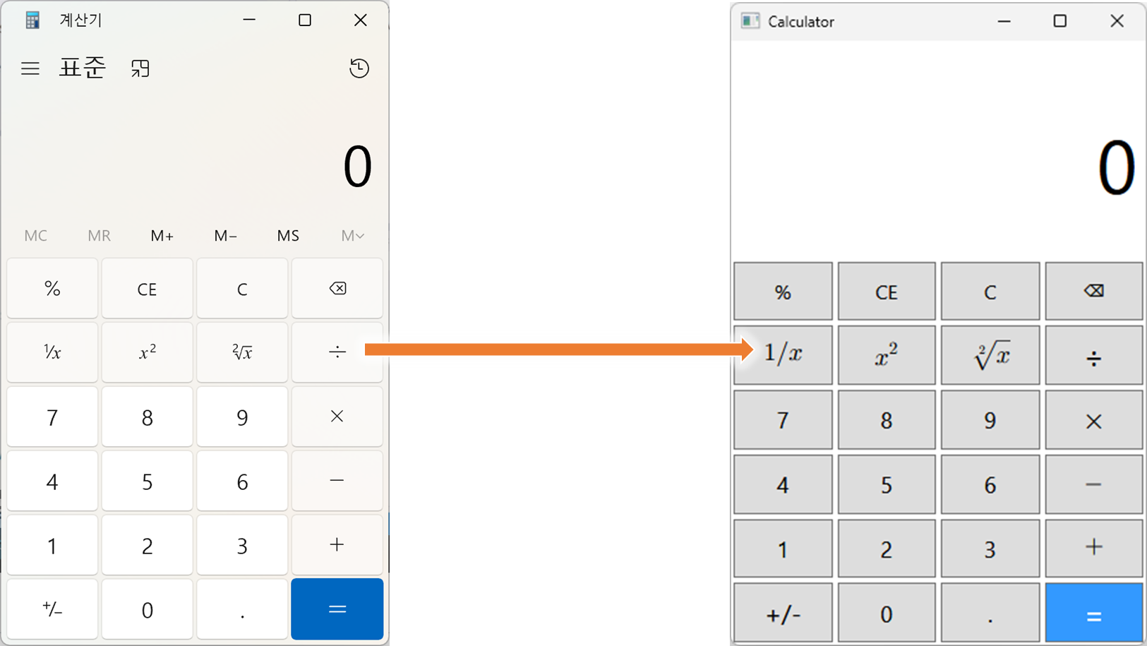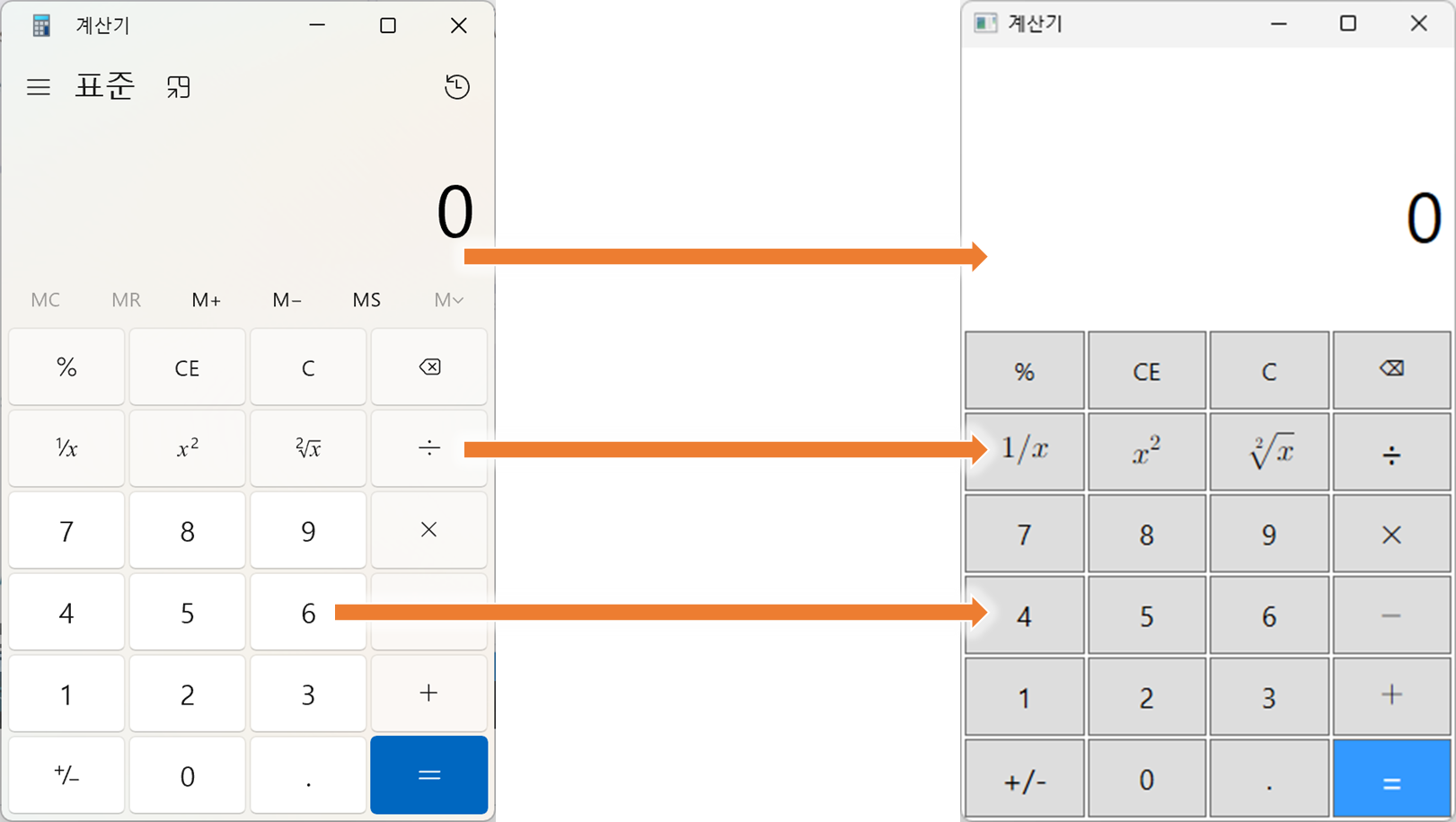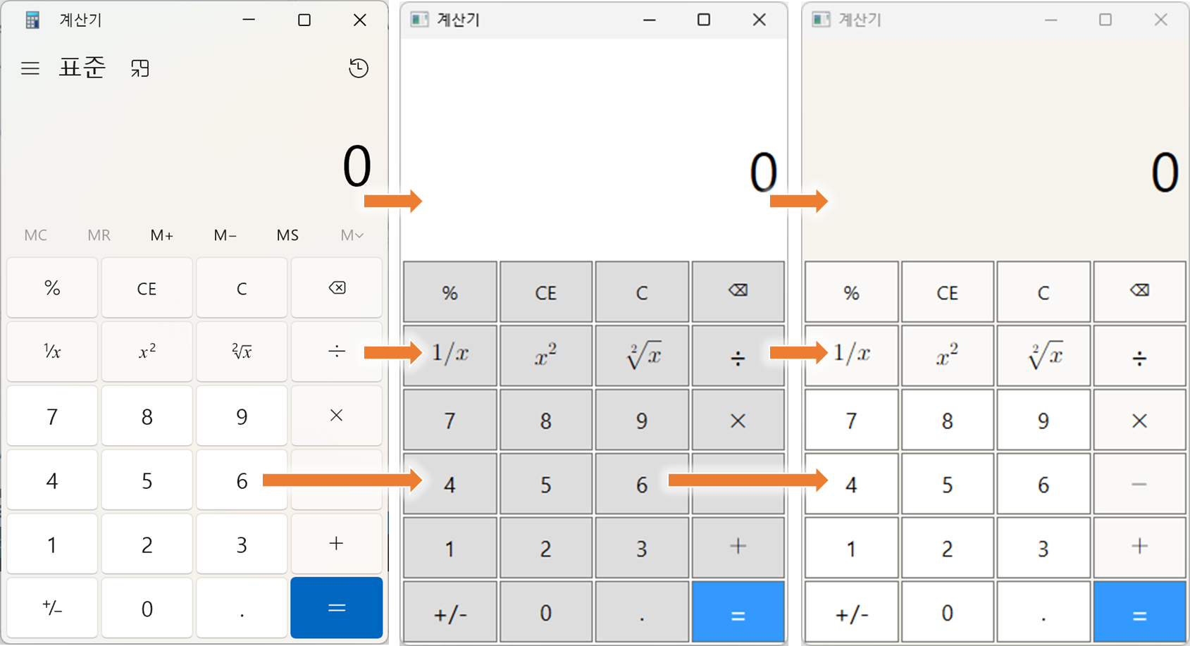 01.1 윈도우 계산기와, 진행중인 예제의 디자인 비교
