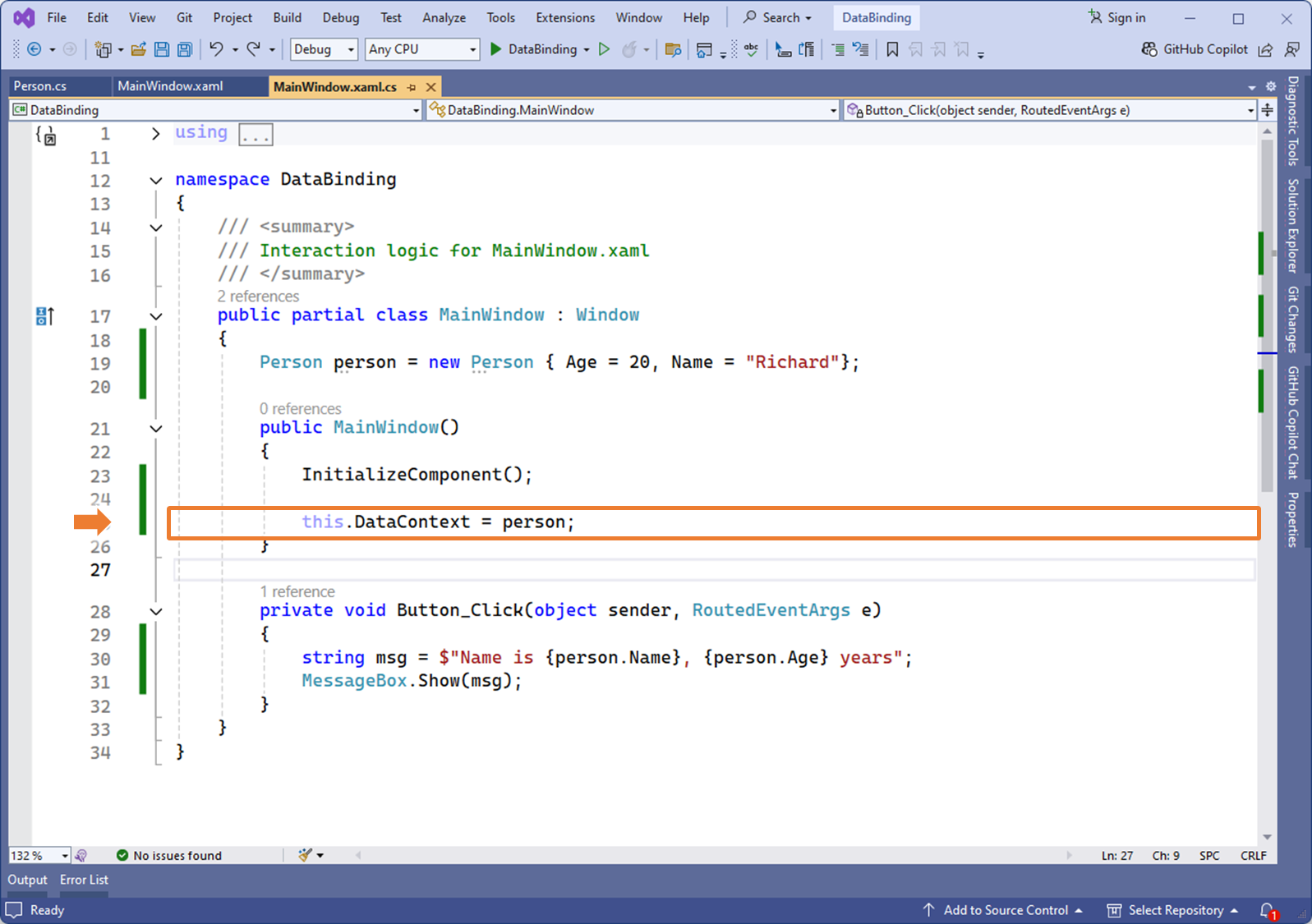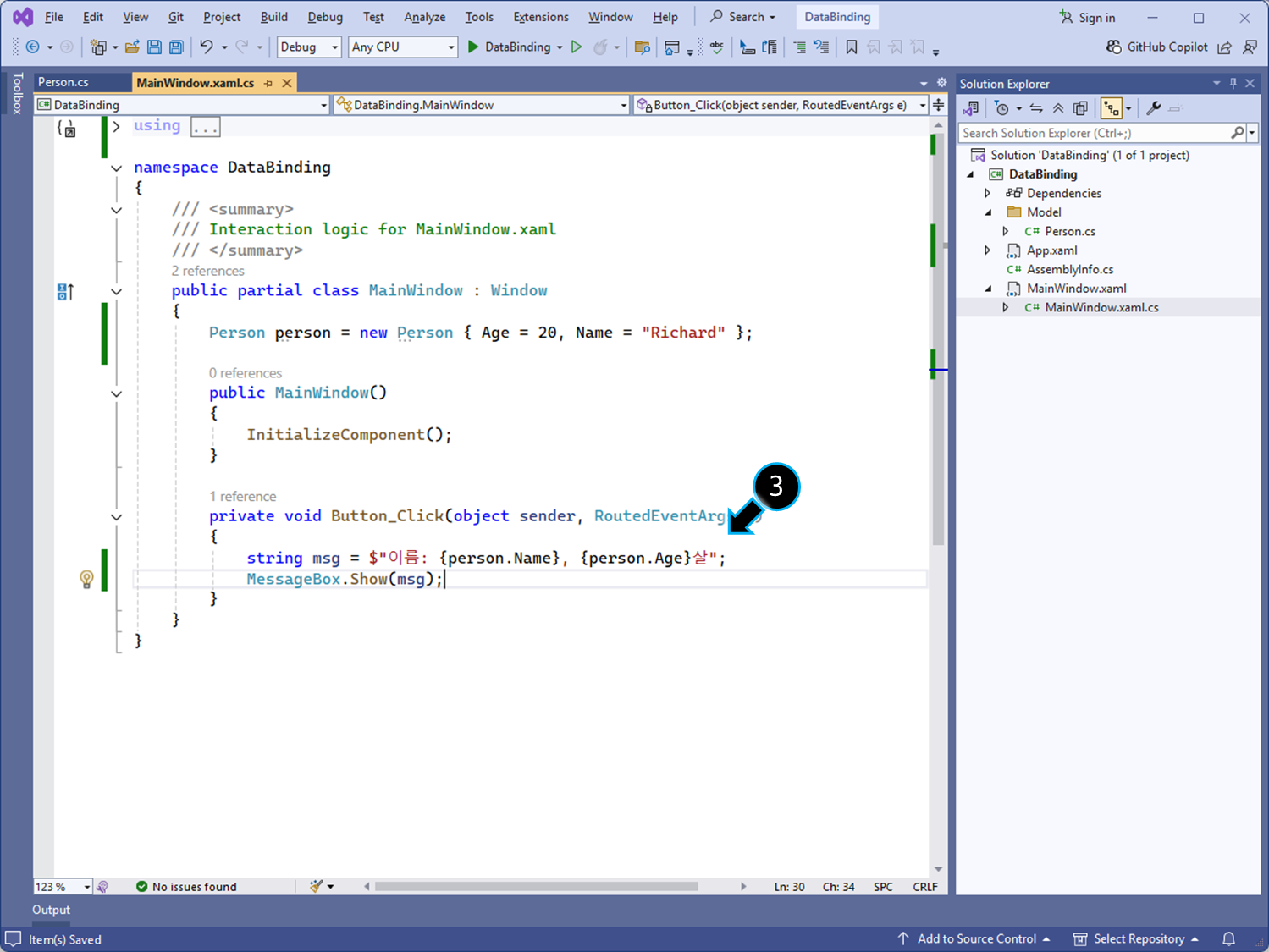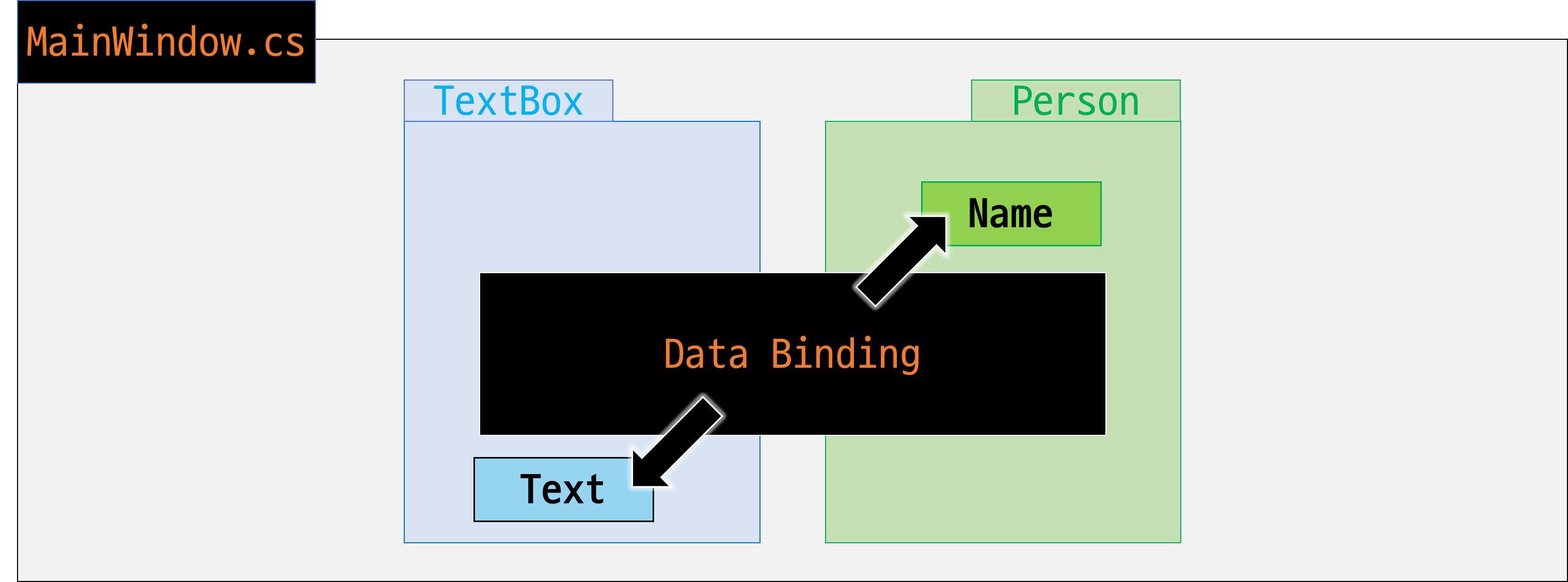 데이터 바인딩은, TextBlock 객체의 Text 속성값과 person객체의 Name 속성값을 하나처럼 연동시키는 작업입니다.
