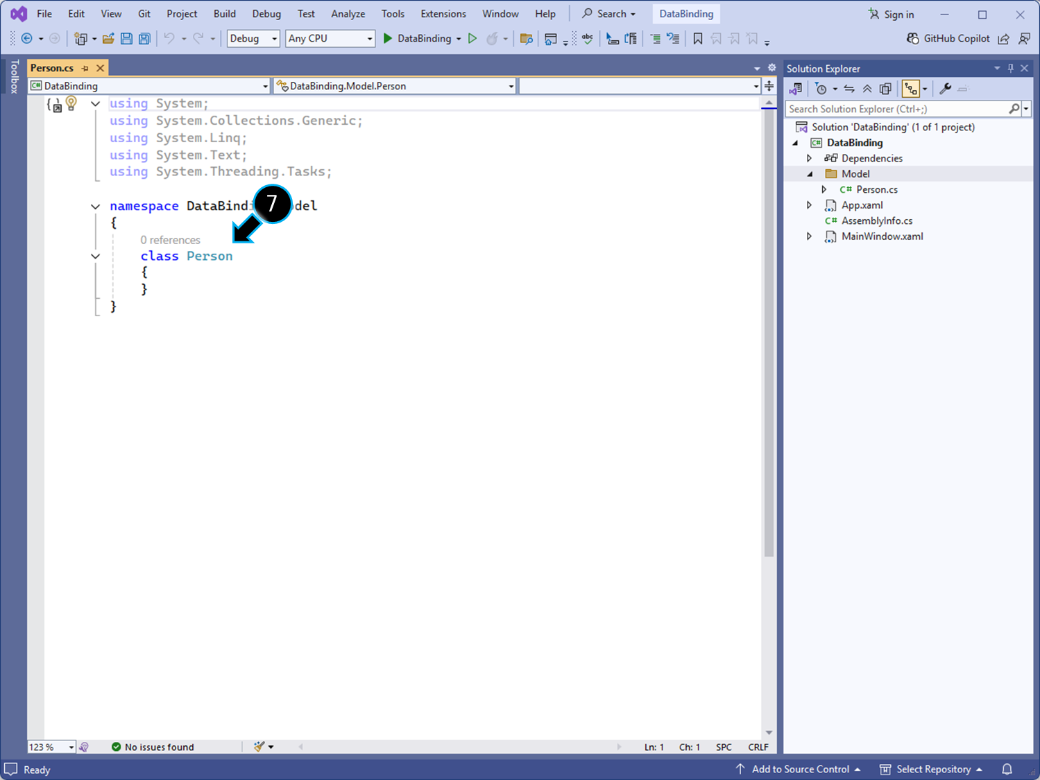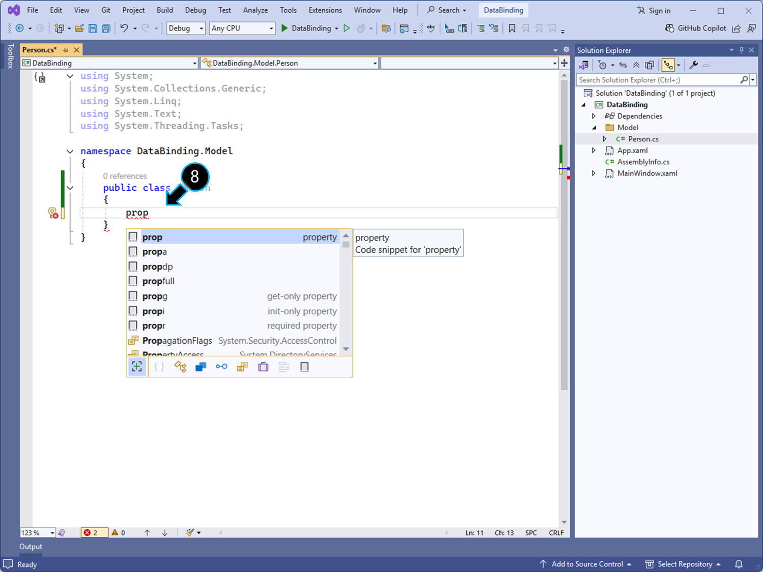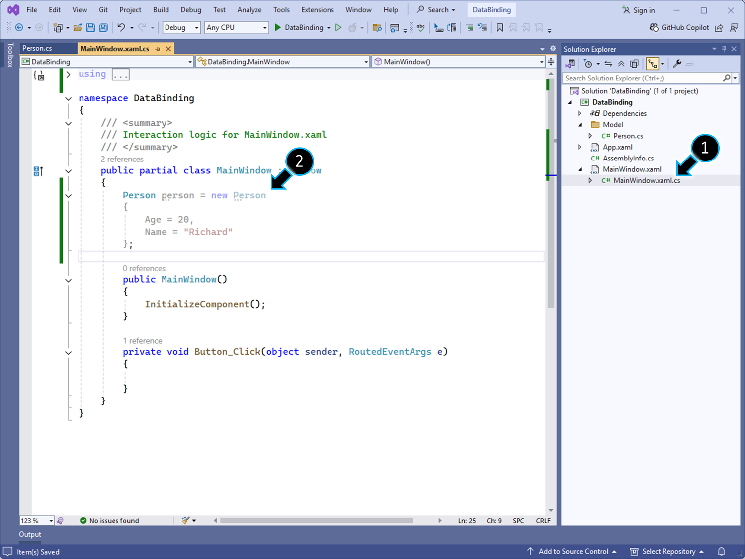 데이터 바인딩은, TextBlock 객체의 Text 속성값과 person객체의 Name 속성값을 하나처럼 연동시키는 작업입니다.