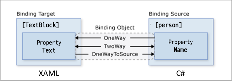 | Data Binding | C# 소스코드 → XAML UI (원본 → 복사본) |