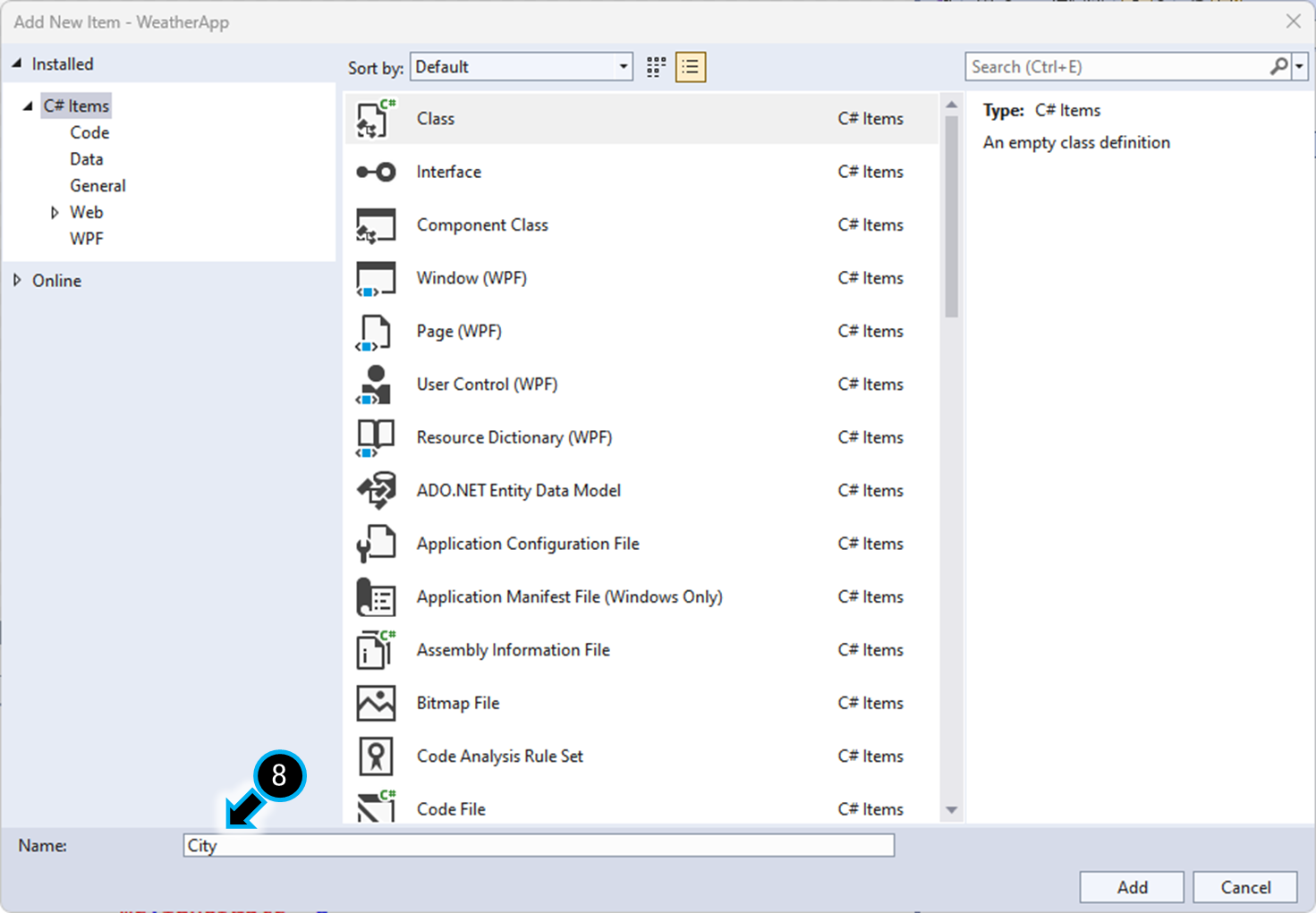 "Weather.cs 클래스" 클래스 파일을, 위와 동일한 과정으로 생성합니다.