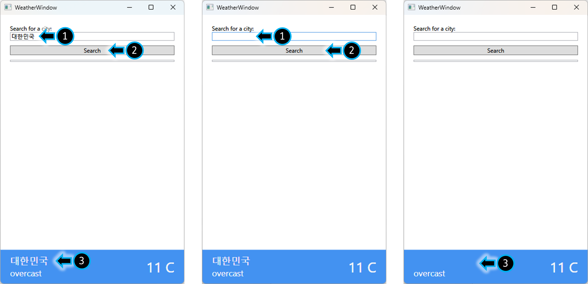 TextBox의 입력값은 날씨 검색에 사용할 도시명입니다.