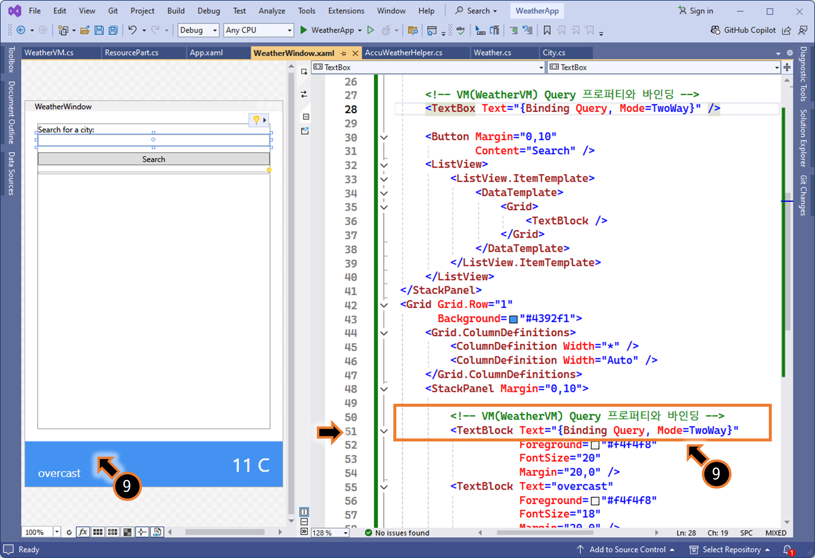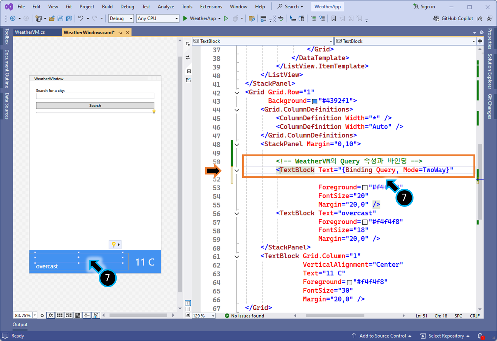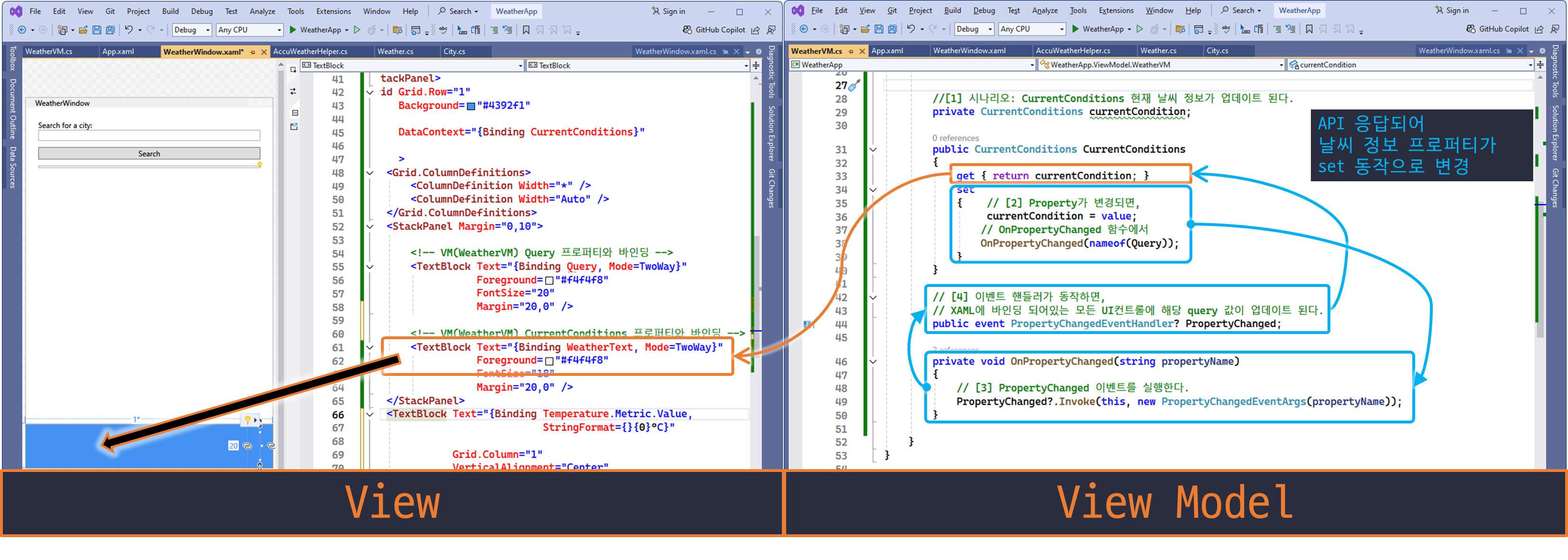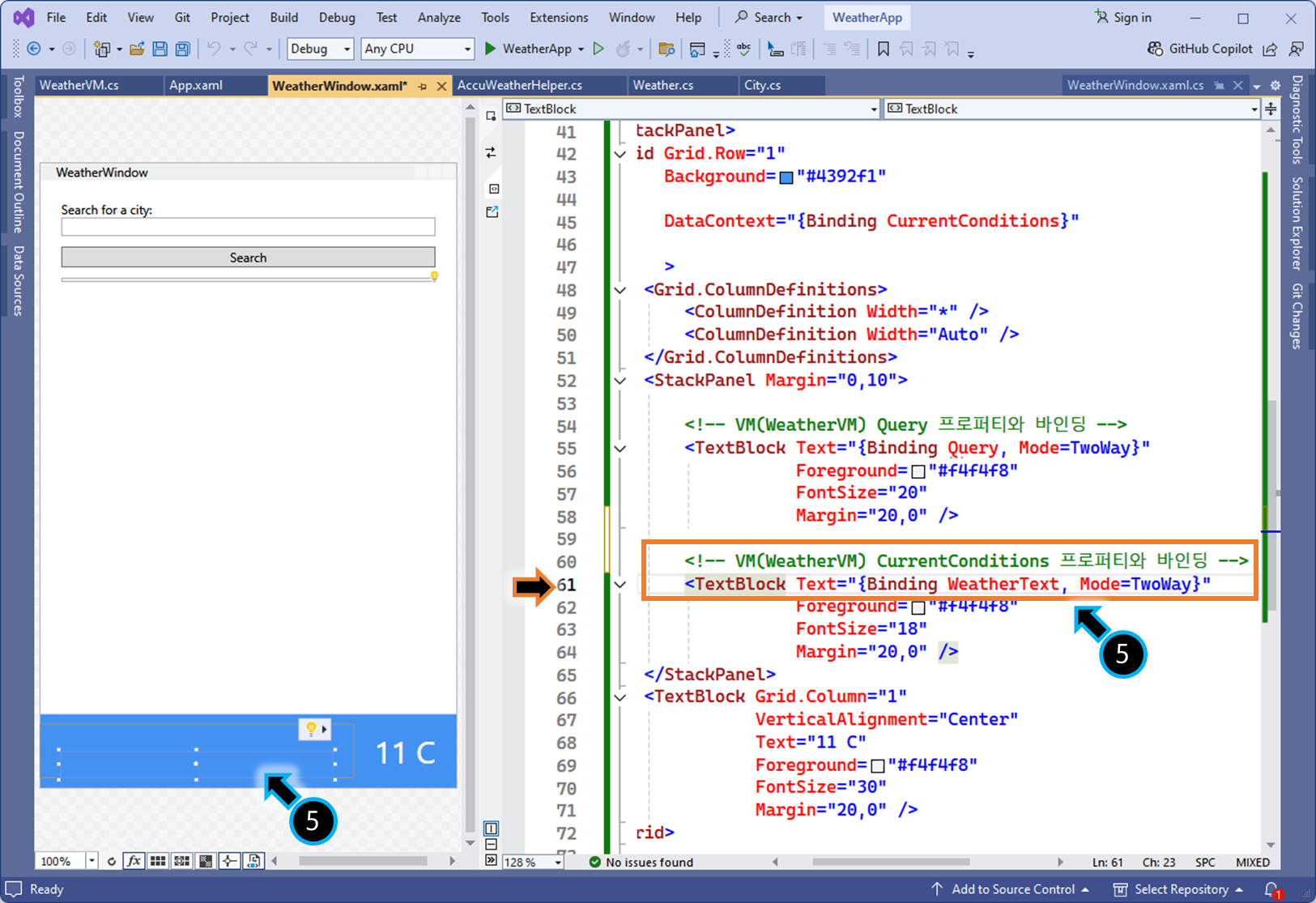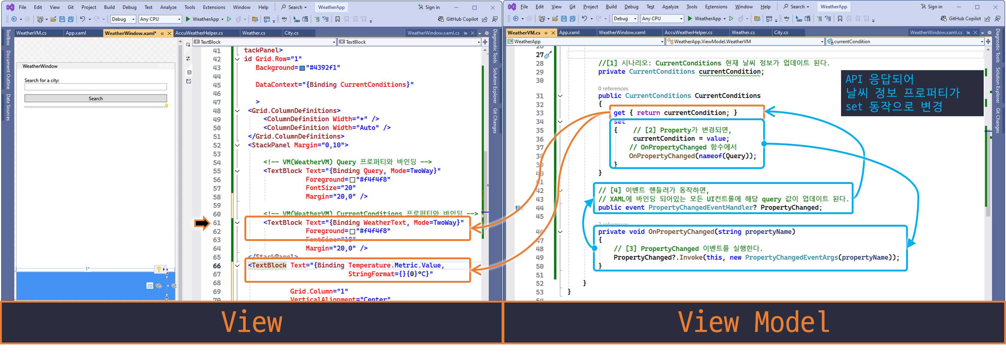 View의 TextBlock을 ViewModel의 currentCondition 객체의 WeatherText 프로퍼티와 바인딩합니다.