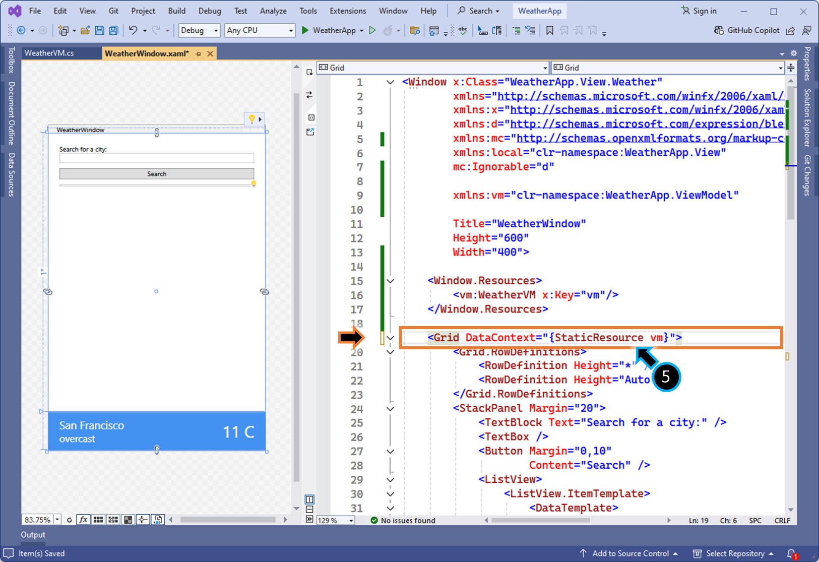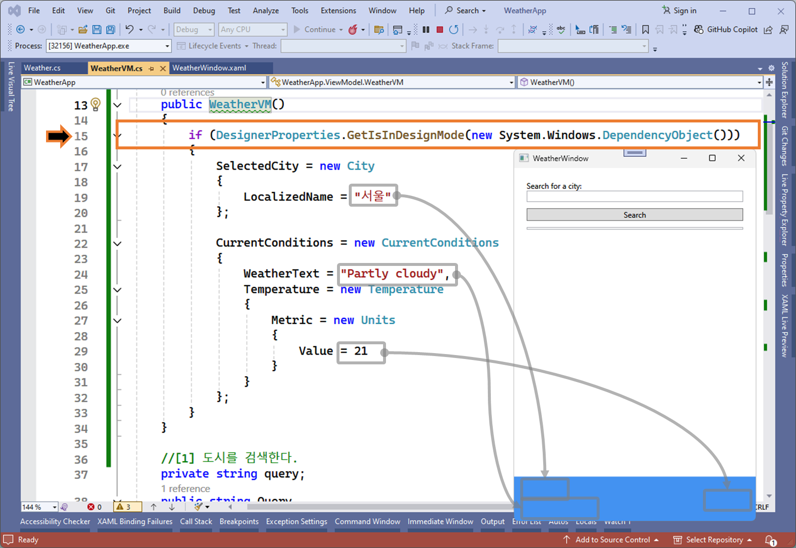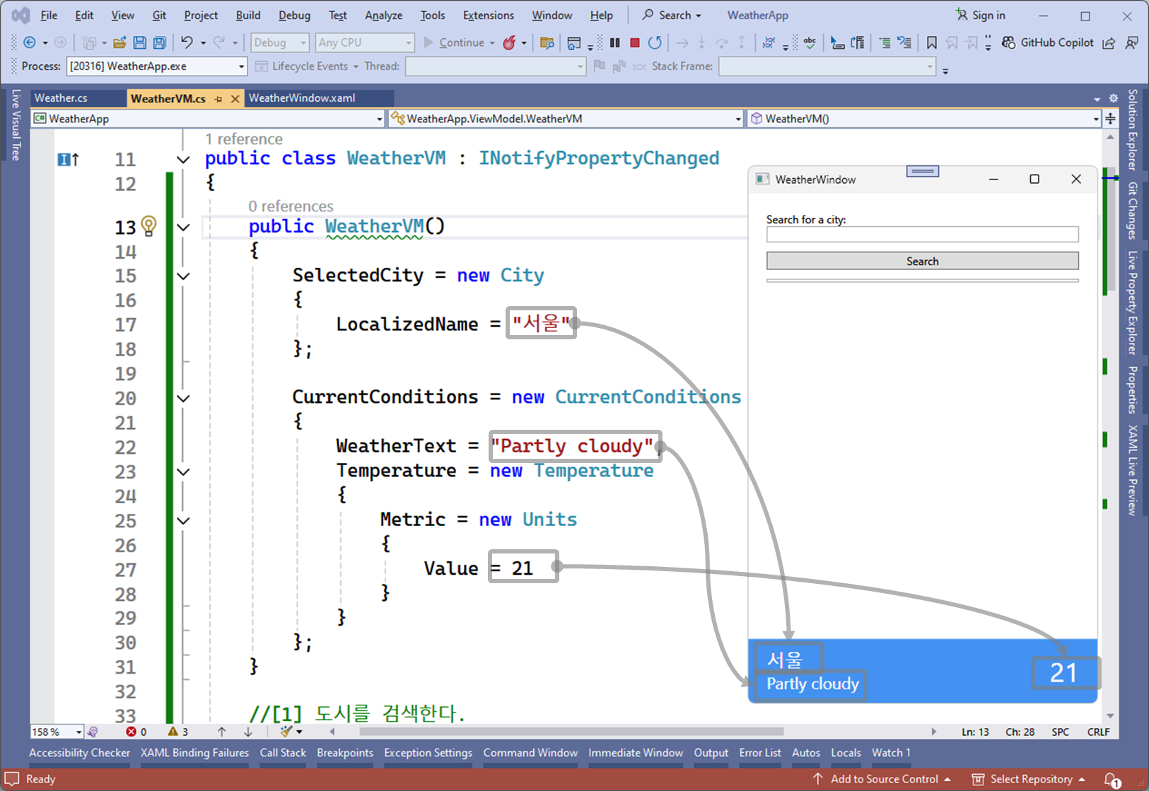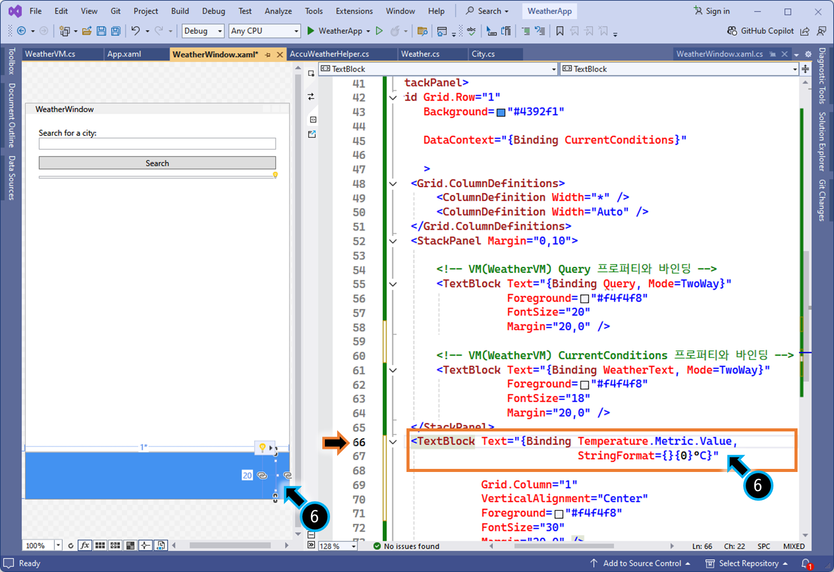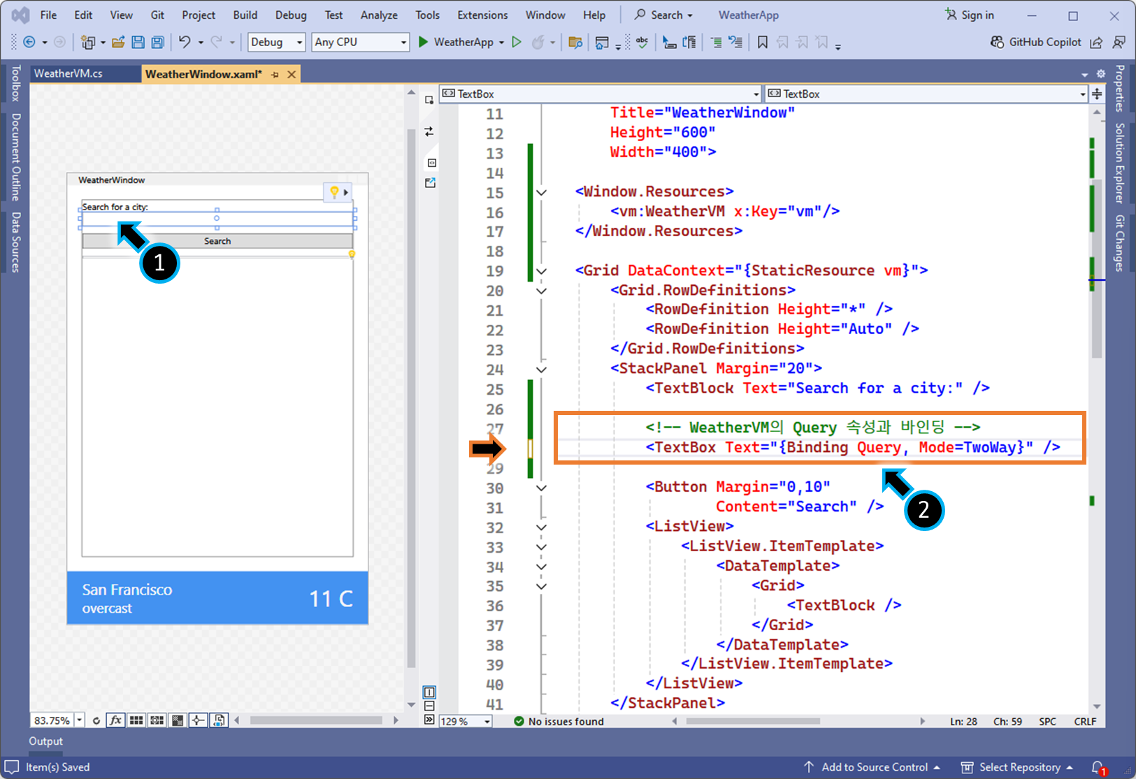 View의 TextBlock을 ViewModel의 currentCondition 객체의 WeatherText 프로퍼티와 바인딩합니다.