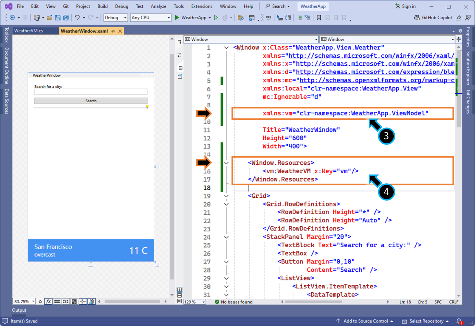 ④ Window 리소스에서 x:Key 값인, vm 으로 WeatherApp.ViewModel 객체를 접근하도록 등록합니다.