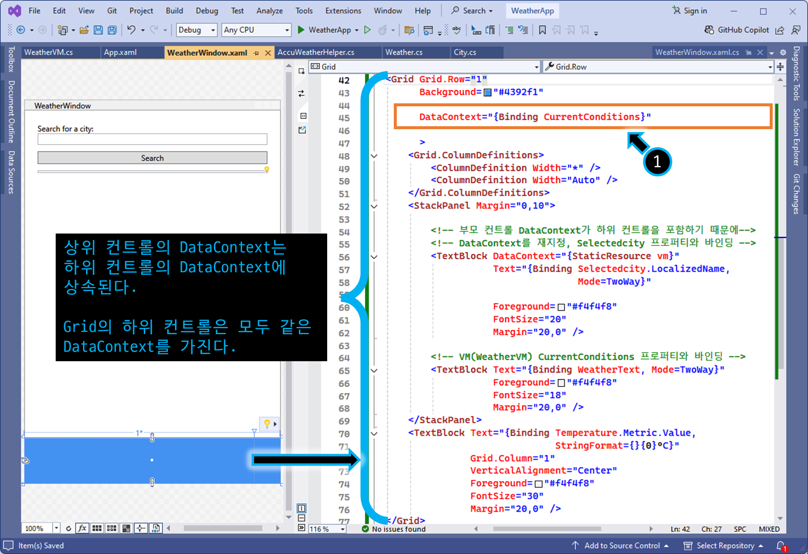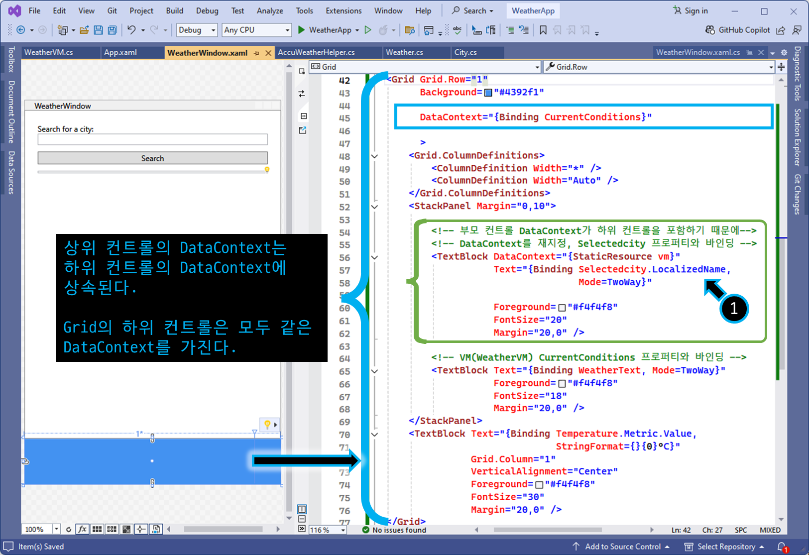 <WeatherVM 프로퍼티> 에 DataContext(호출, 응답 환경정보)를 지정해야 합니다.