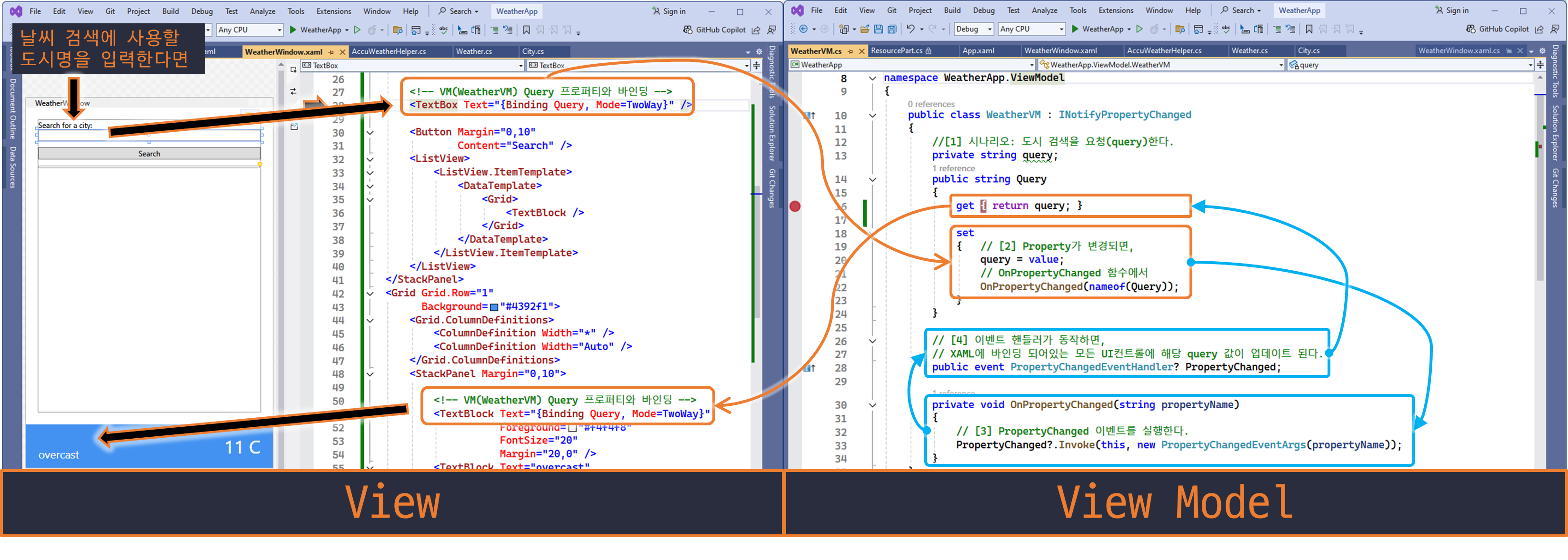 " XMAL 컨트롤 Class Property"에 "ViewModel 의 Class Property"를 바인딩합니다.