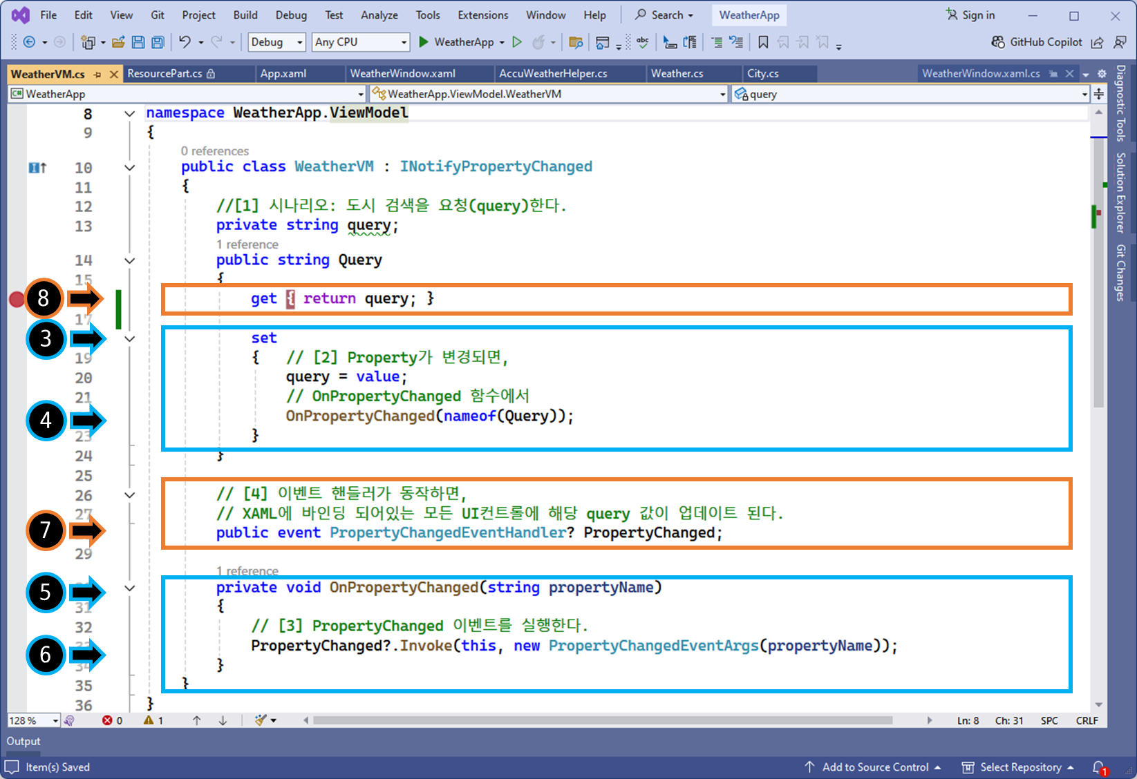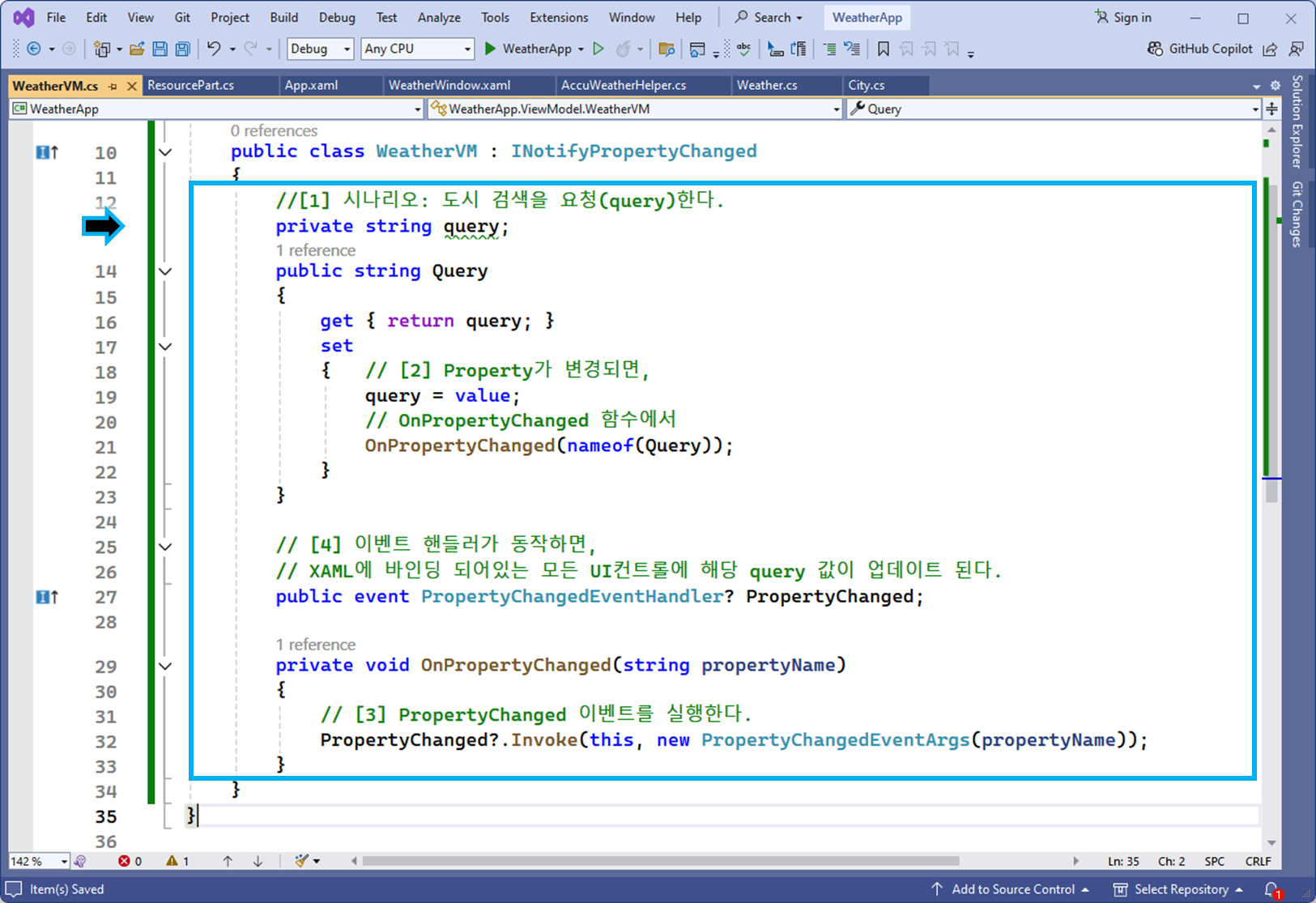 Query 프로퍼티가 업데이트가 되면, PropertyChanged 이벤트 핸들러가 동작하도록 로직을 구현합니다.