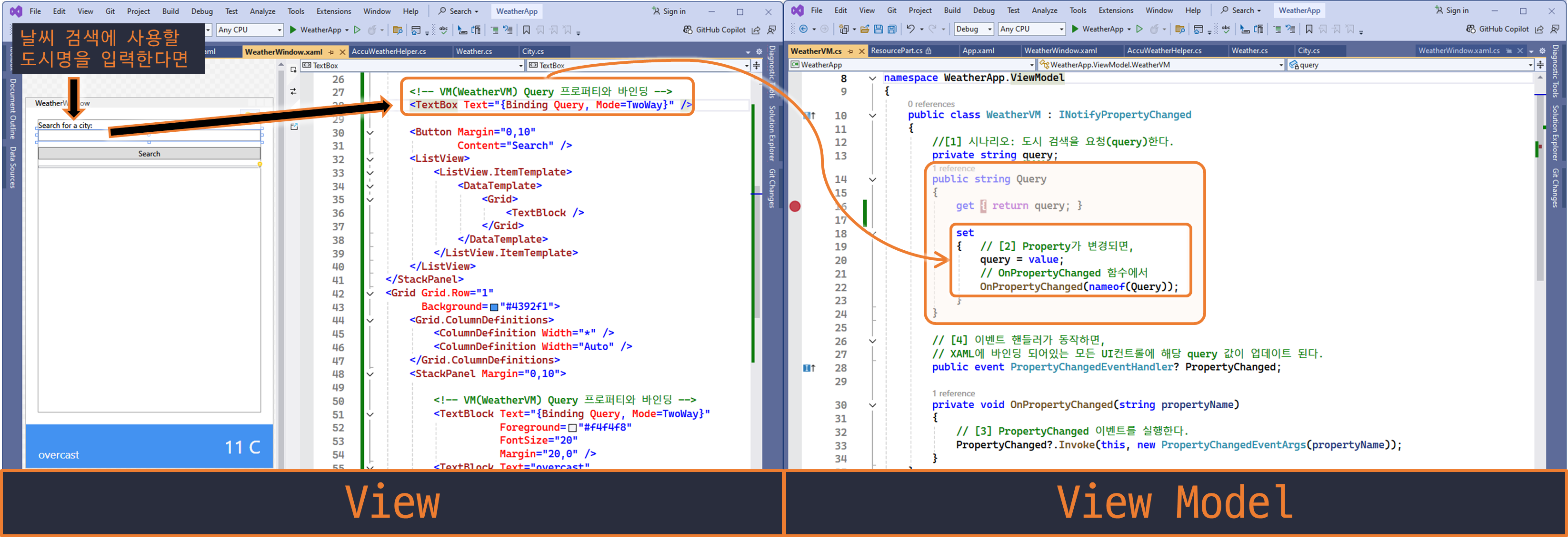 <WeatherVM 프로퍼티> 와 <XAML 컨트롤 요소> 을 Data Binding 하는데 사용하려면,
