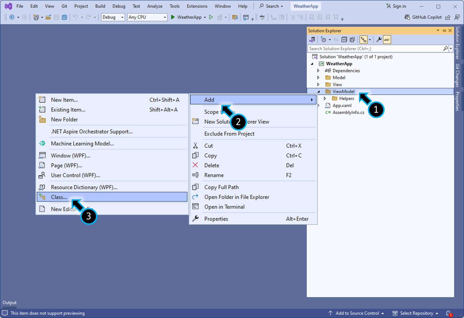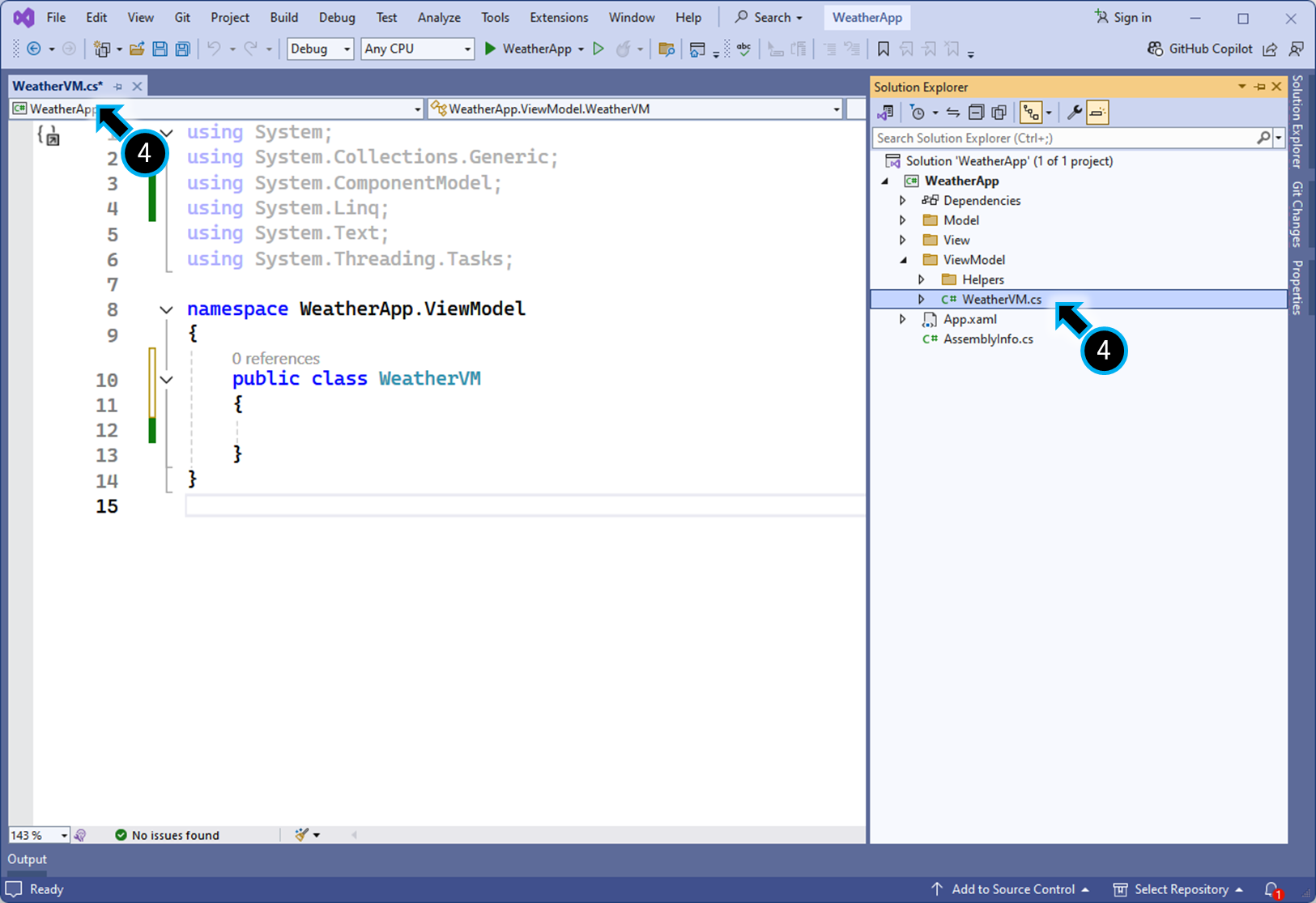 ViewModel 폴더에 WeatherVM.cs 파일을 생성합니다.