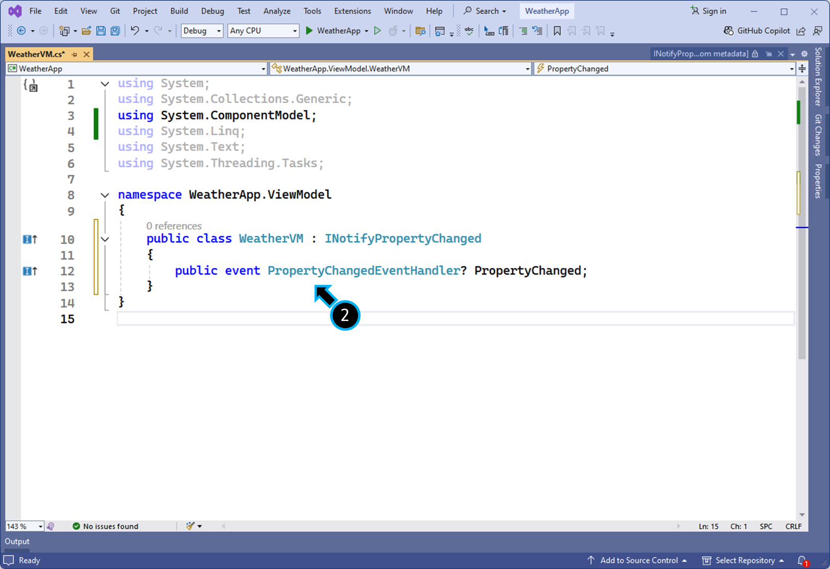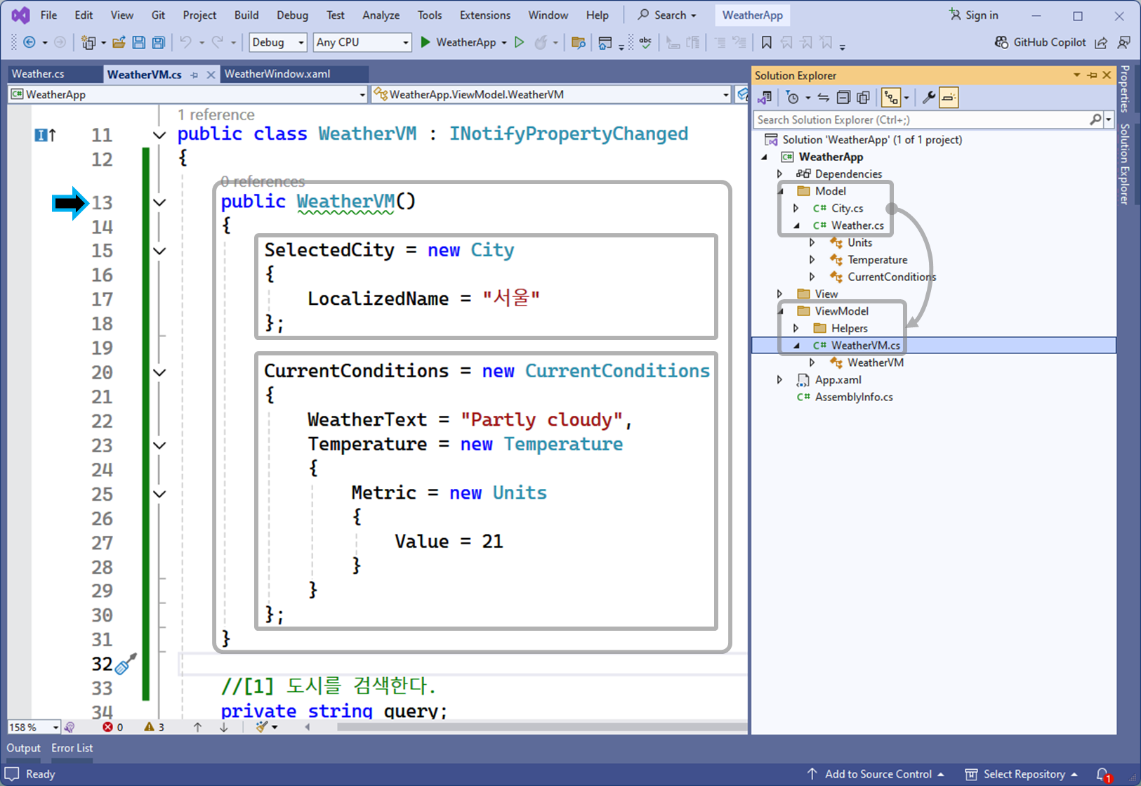 ViewModel, WeatherVM 클래스의 생성자에서, CurrentConditions, SelectedCity 프로퍼티를 초기화한다.