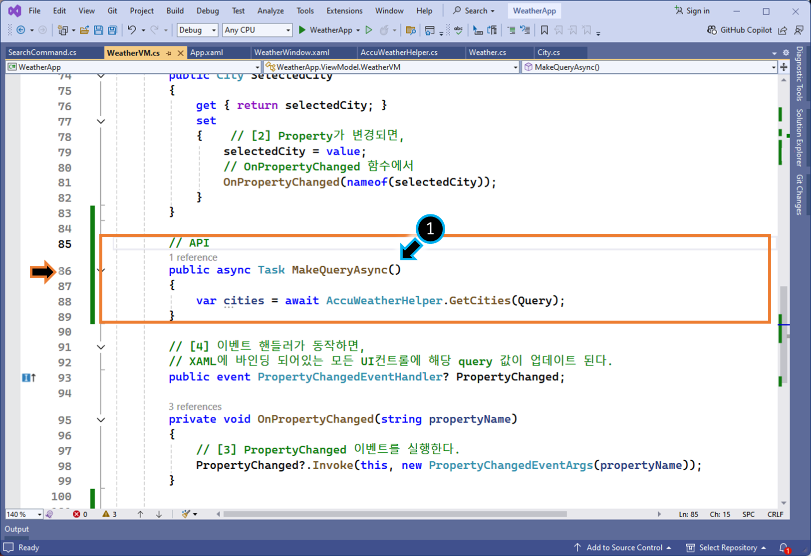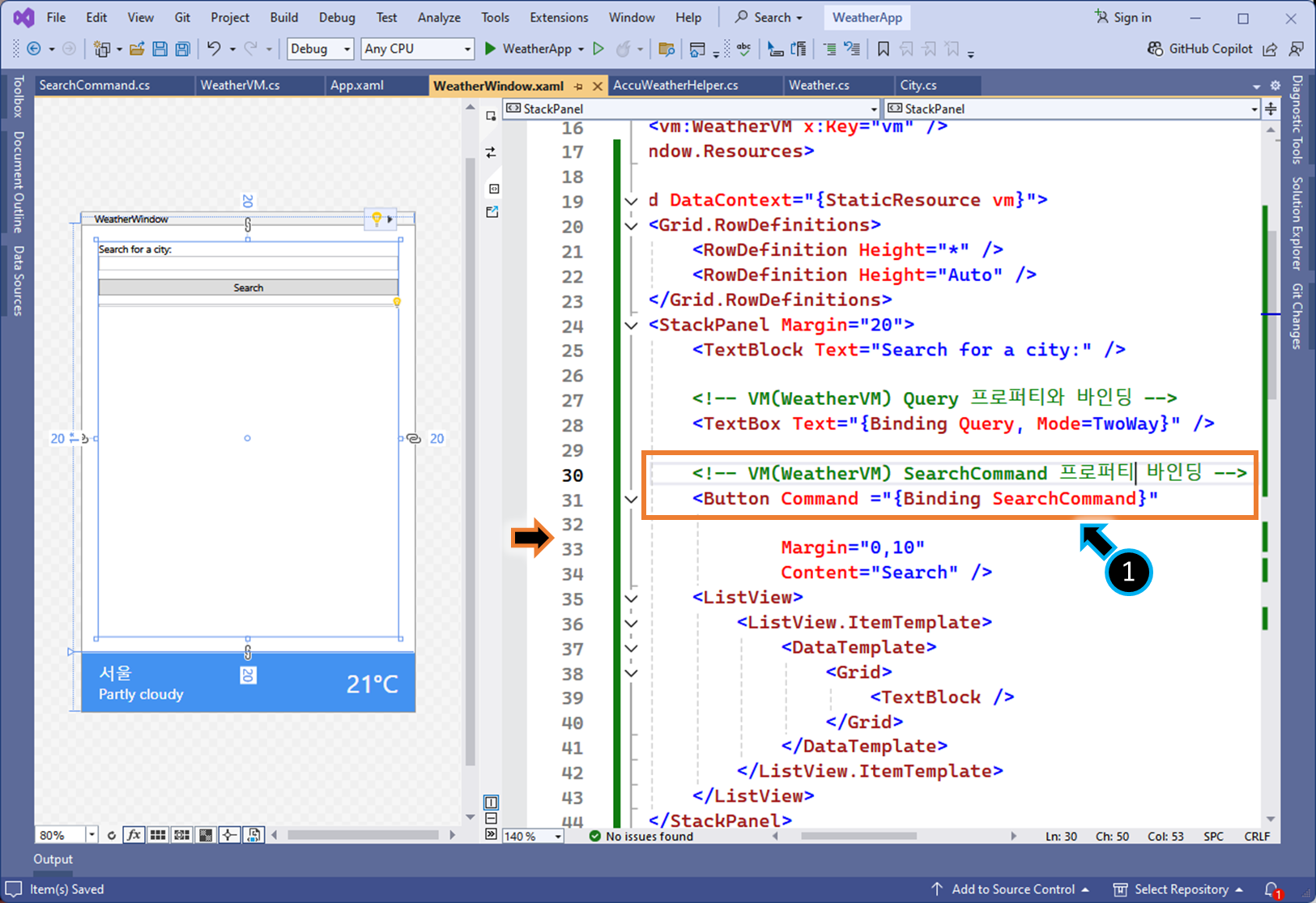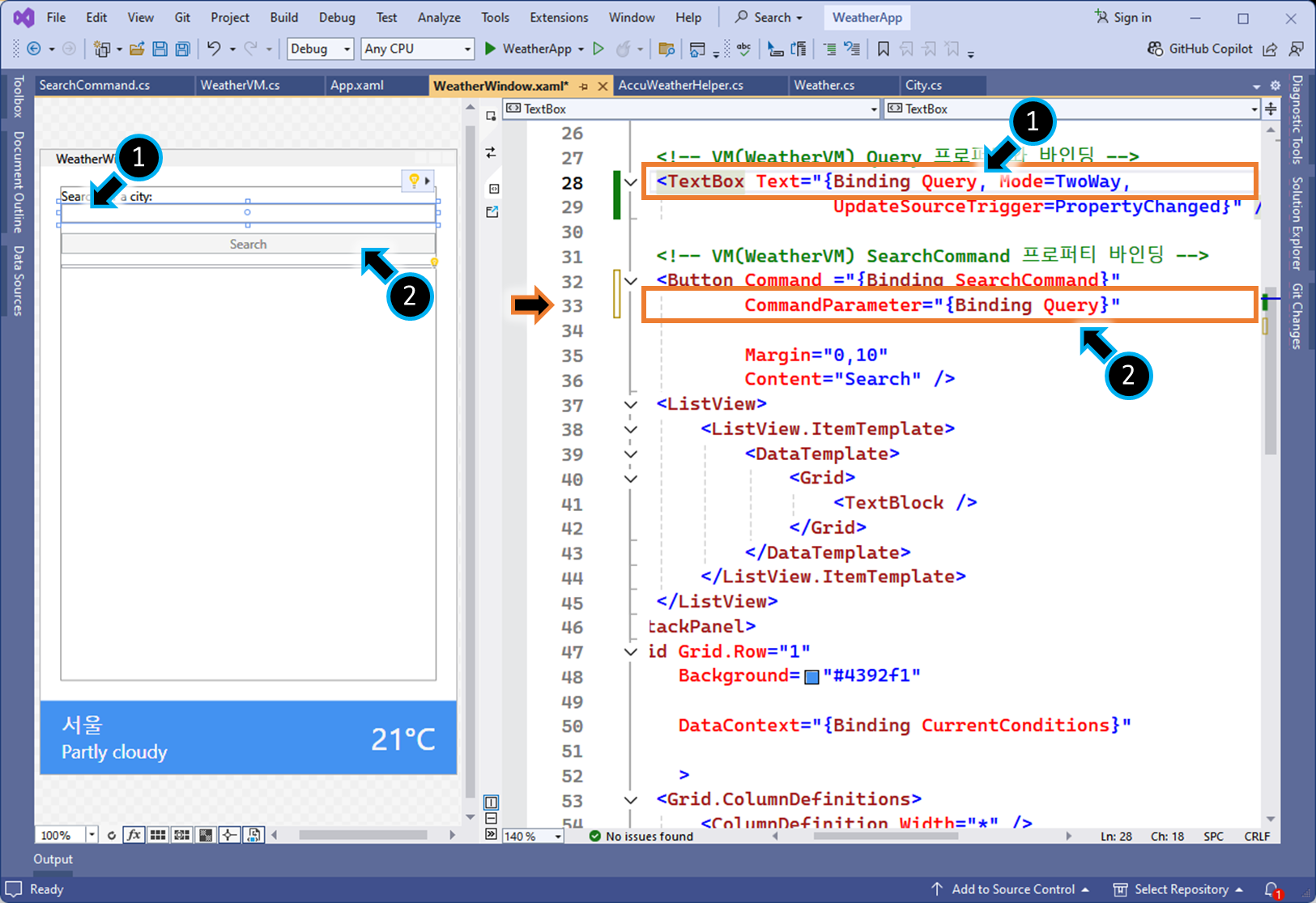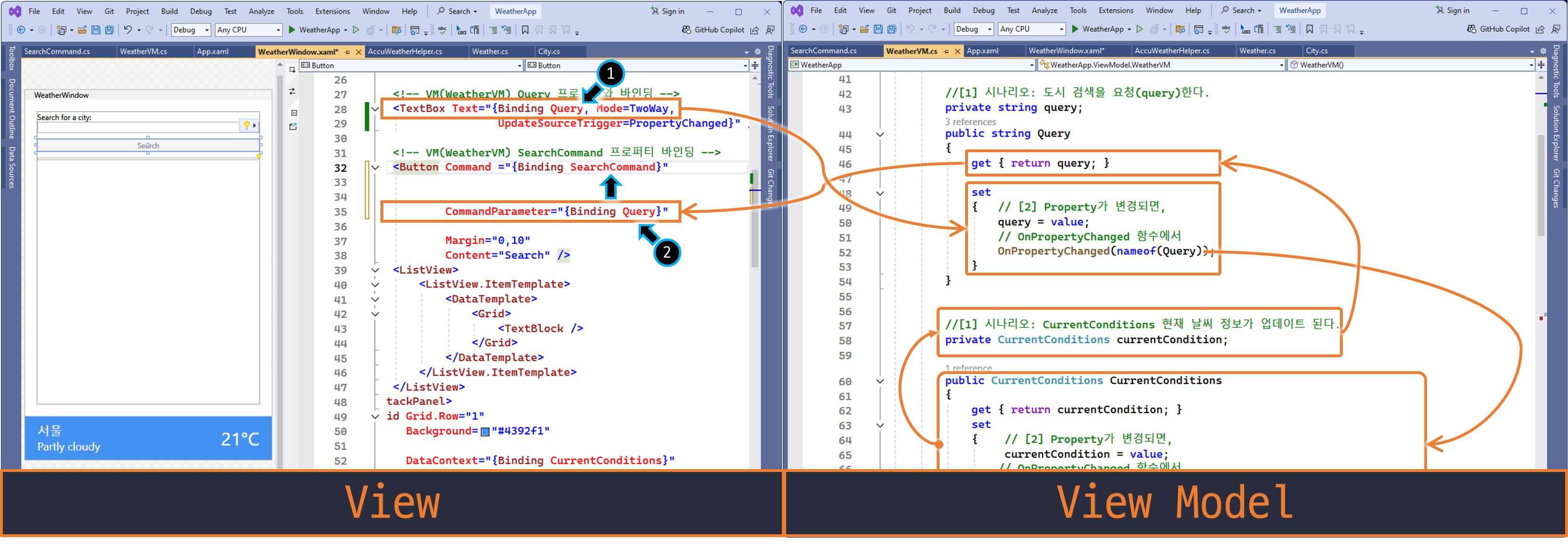 예) 코드 비하인드 버튼 클릭 이벤트 핸들러를, ViewModel 클래스 로직에서 구현 합니다.