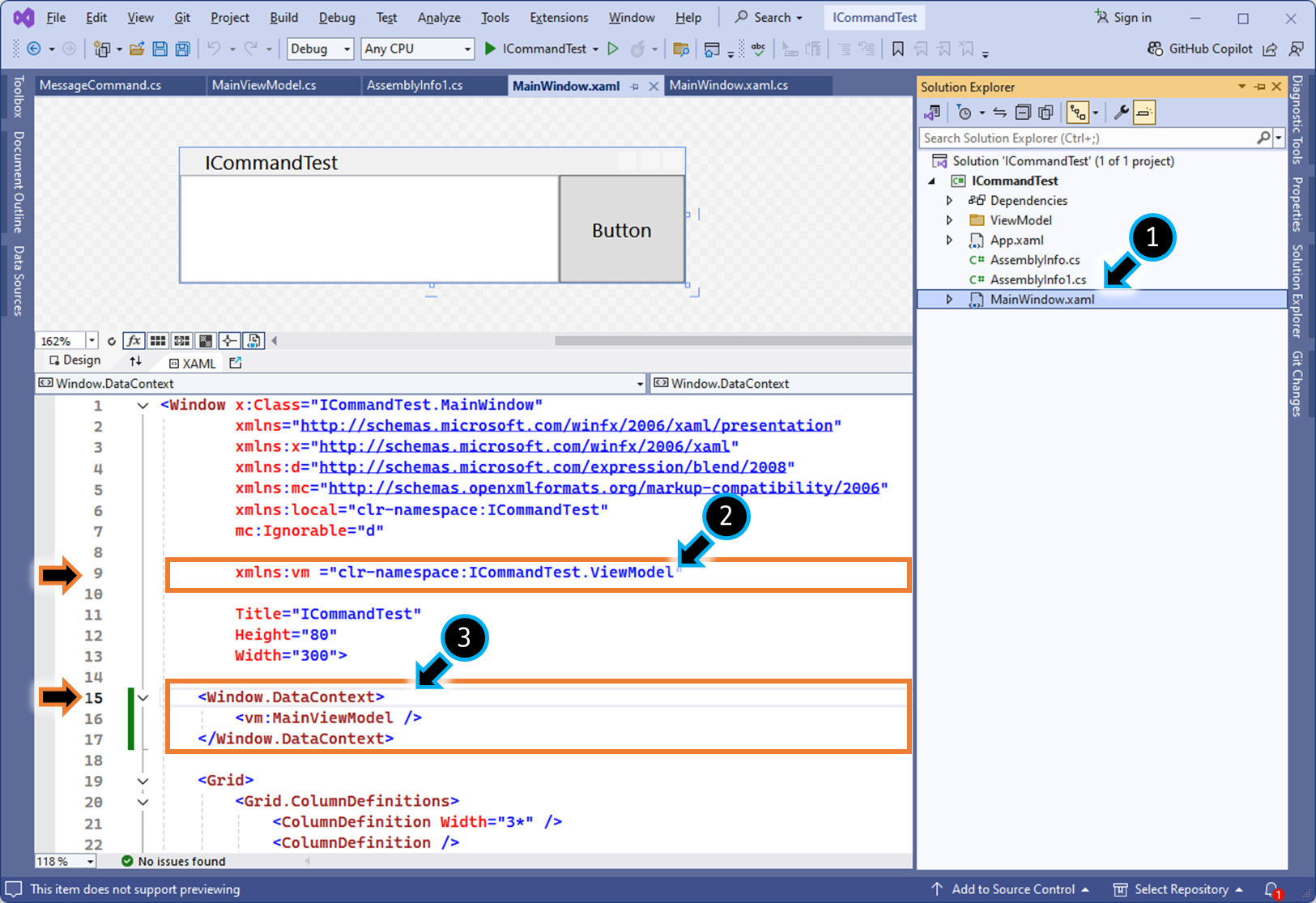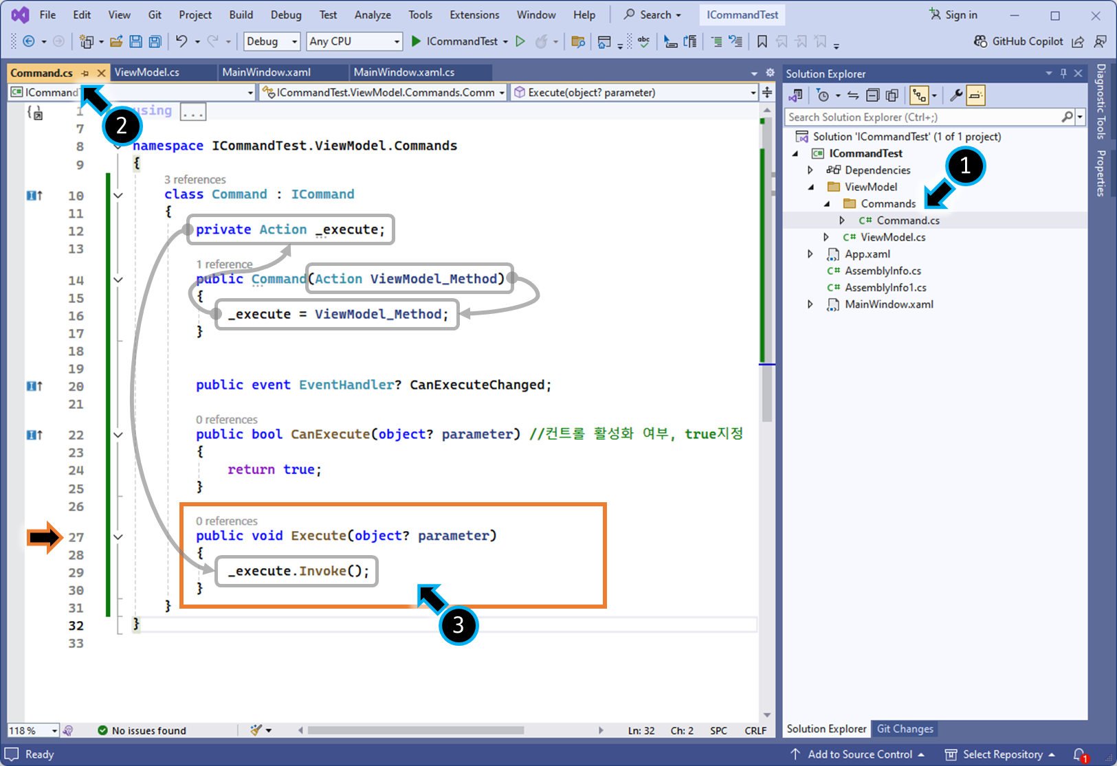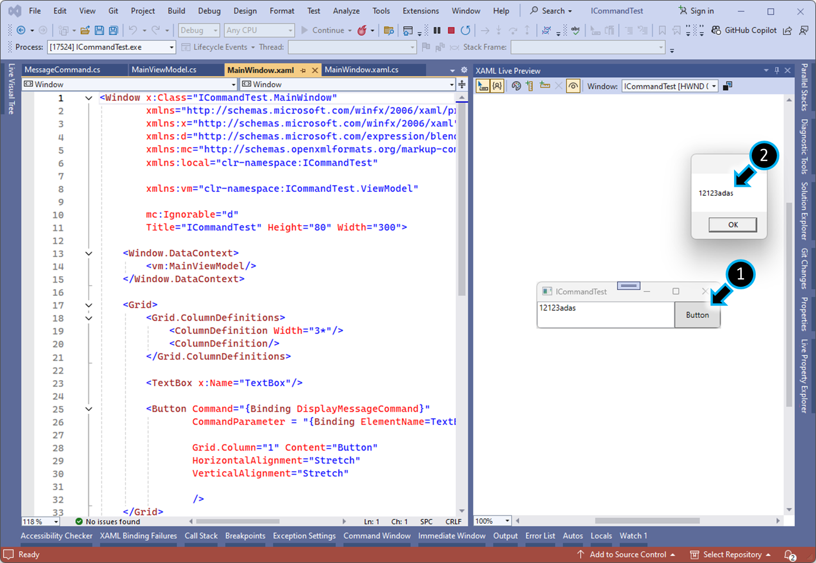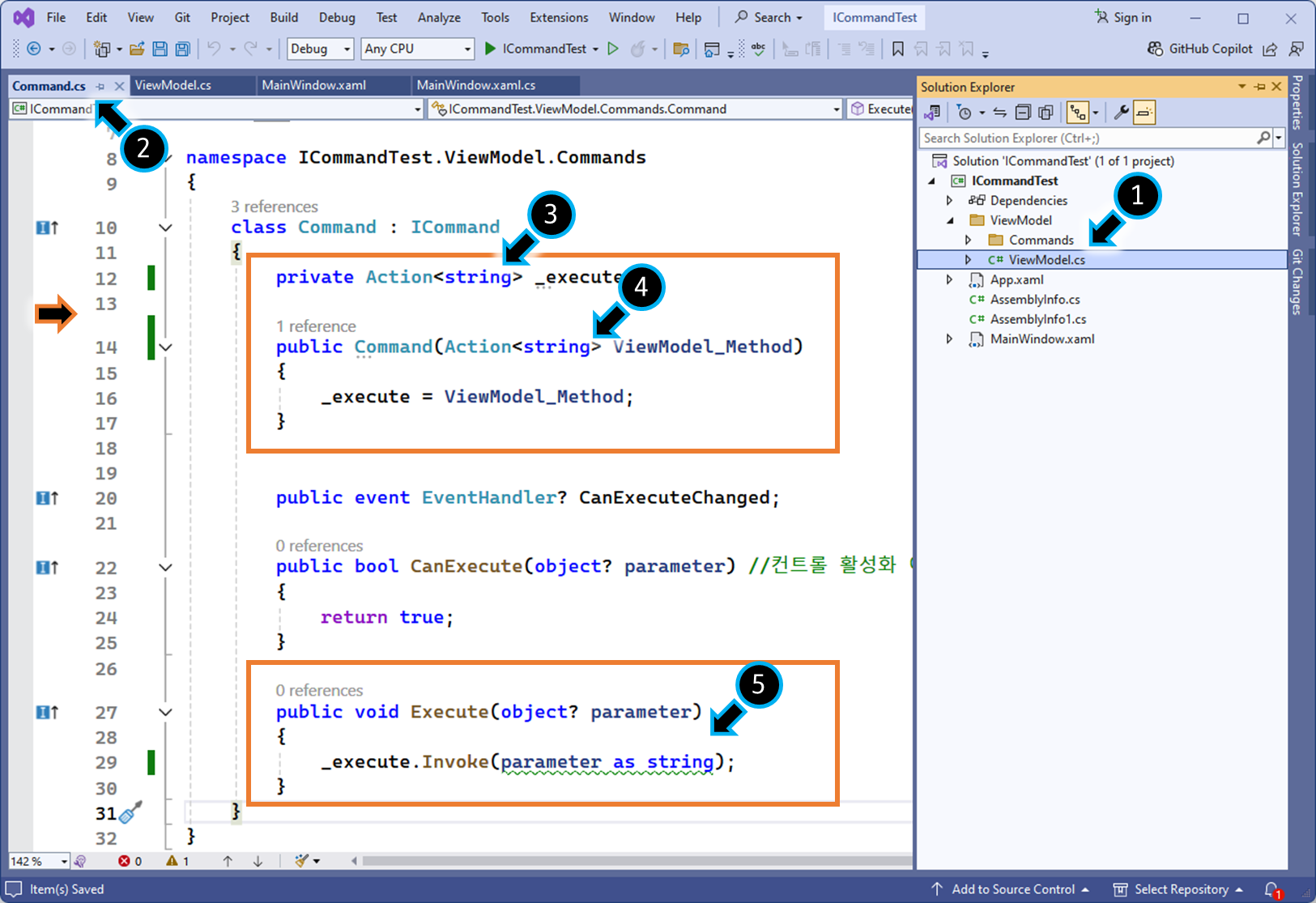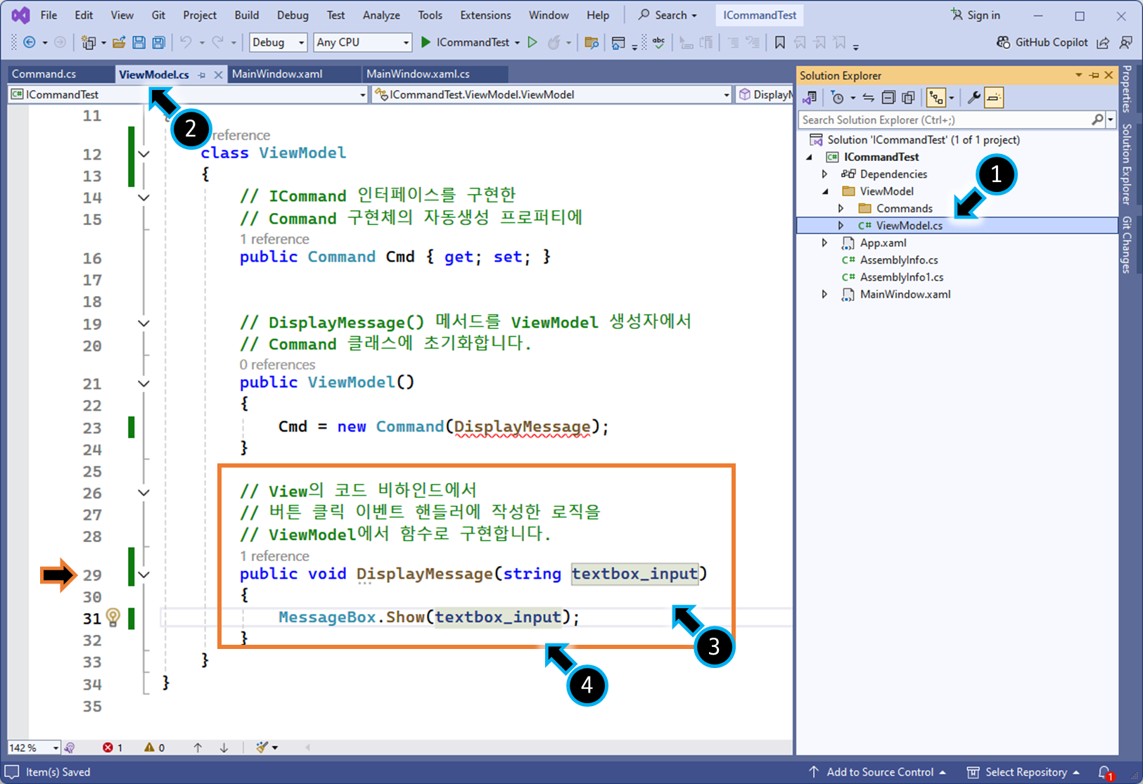 (1) ViewModel 로직에 ICommand 구현체를 만들고, 원하는 메서드를 등록합니다.