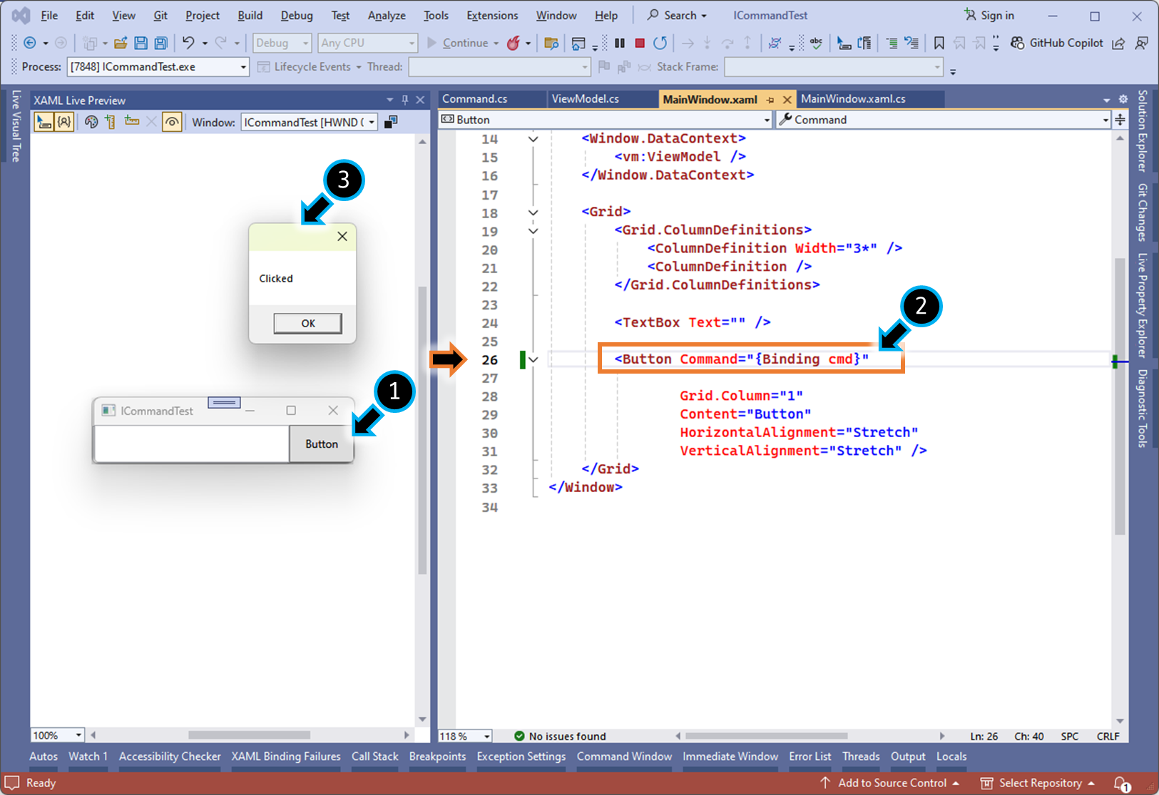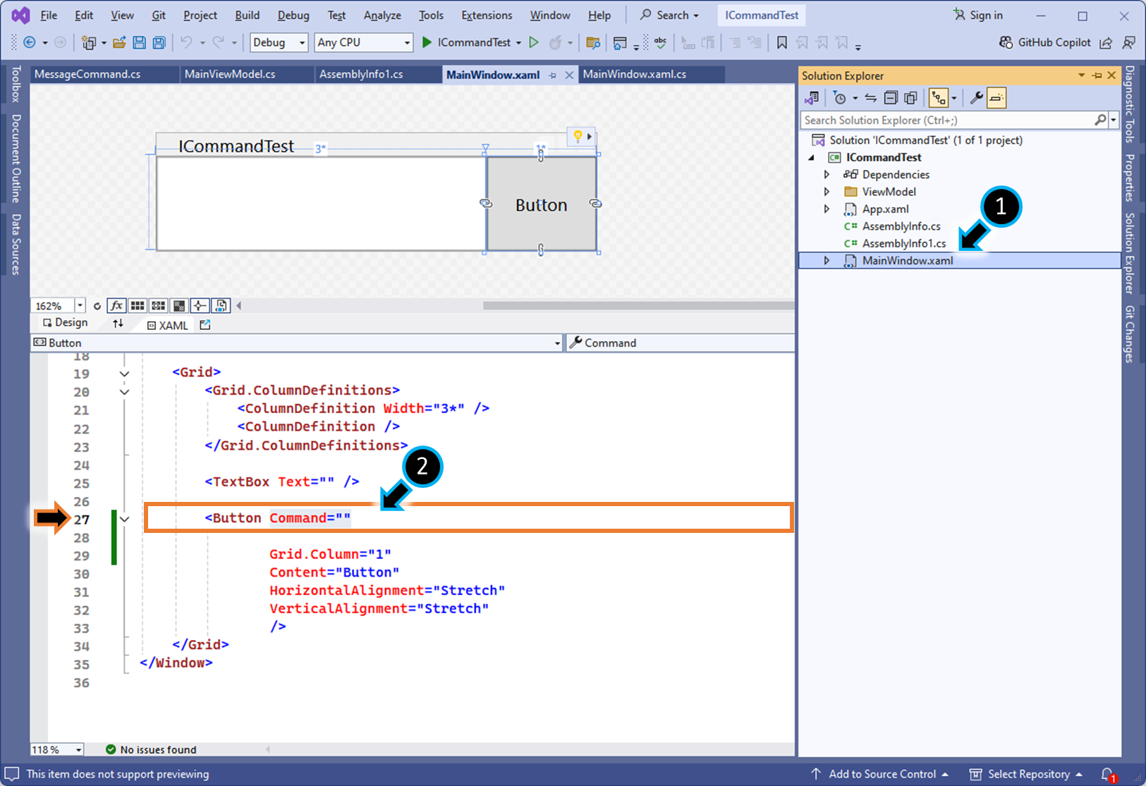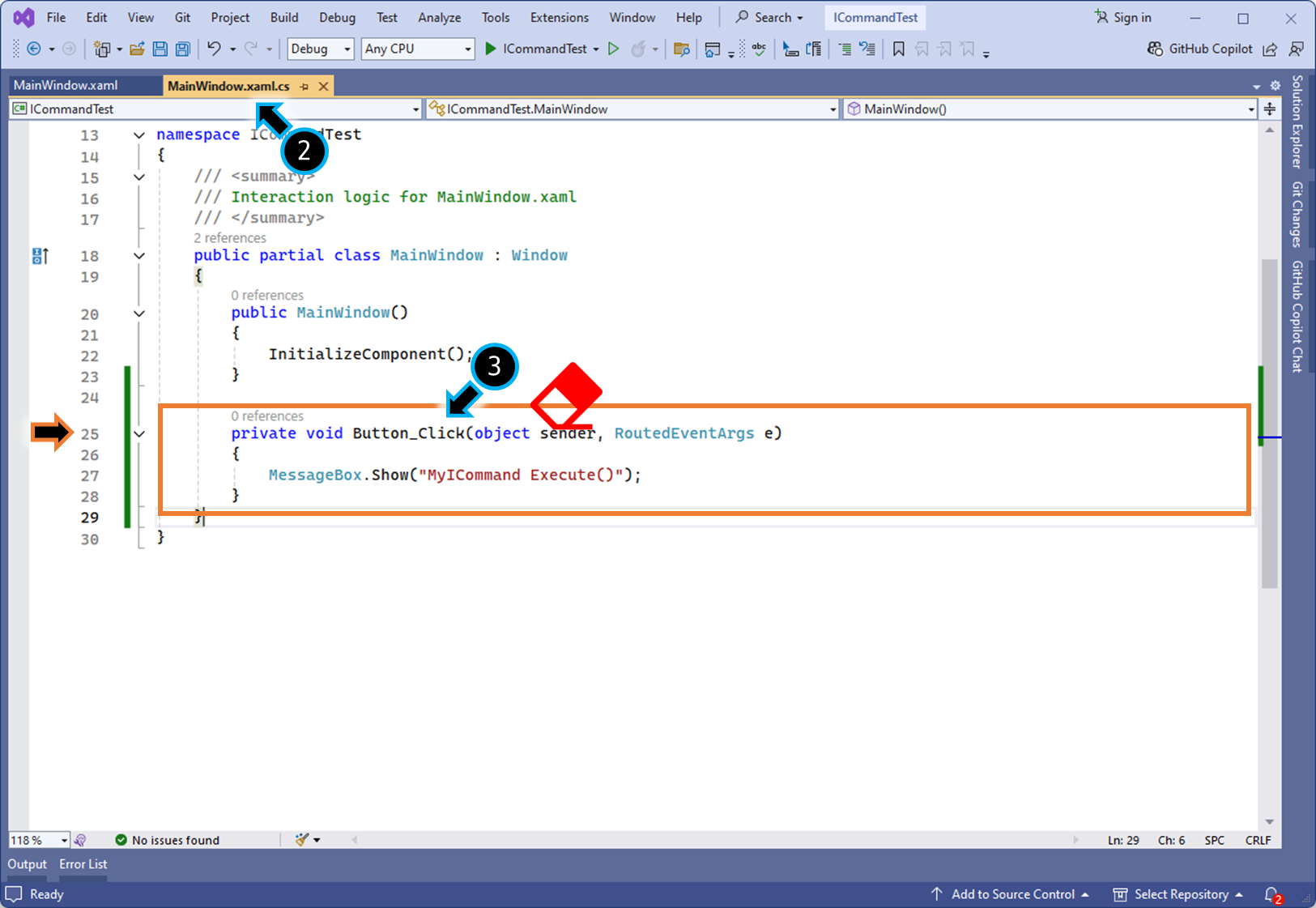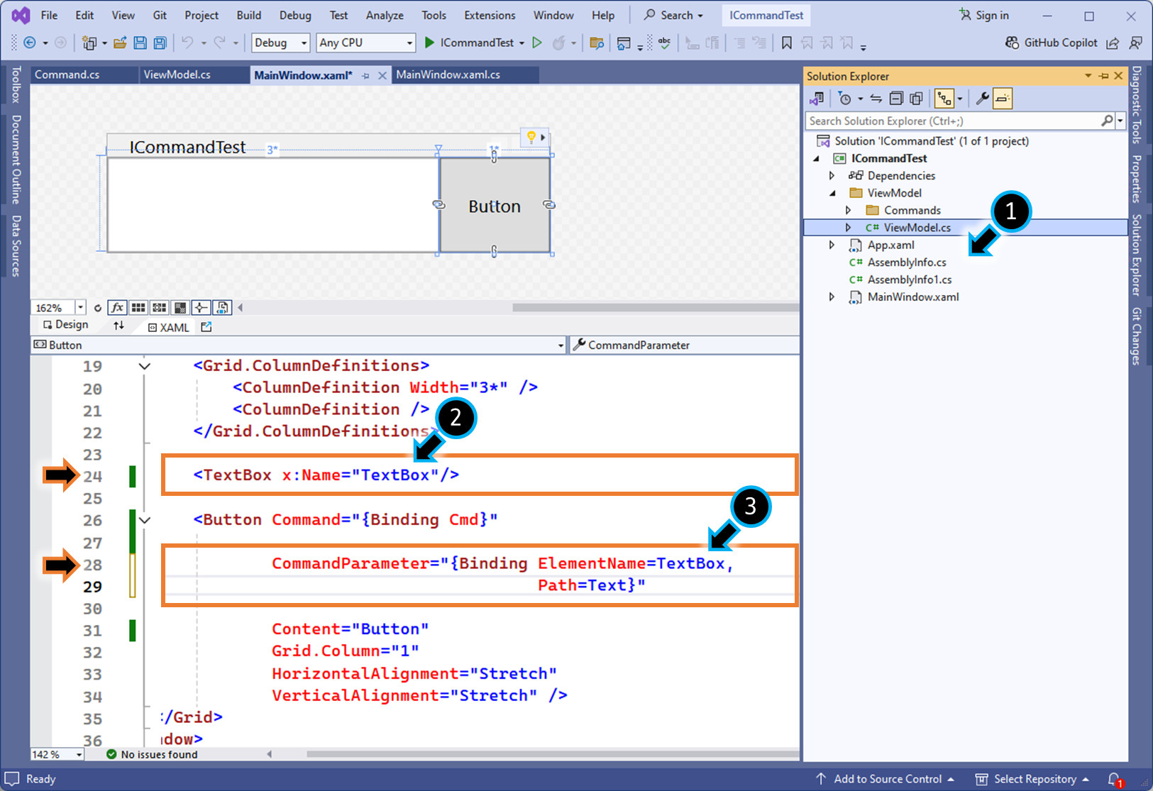 (1) ViewModel 로직에 ICommand 구현체를 만들고, 원하는 메서드를 등록합니다.
