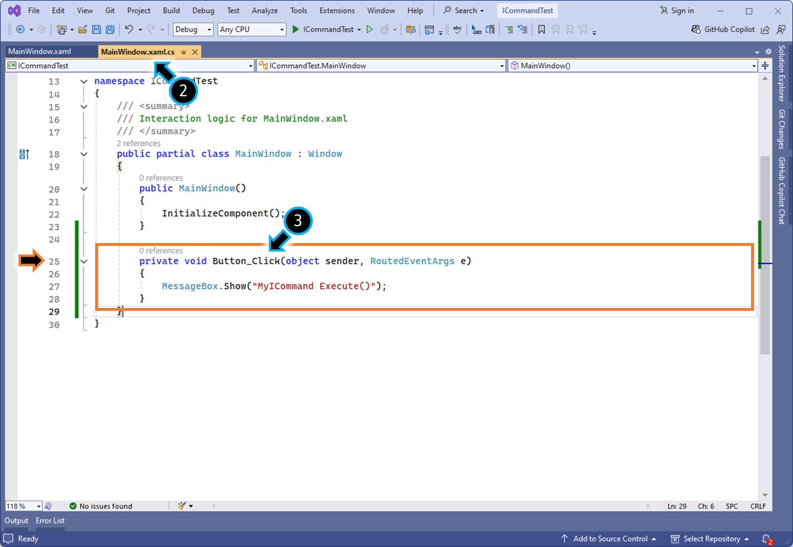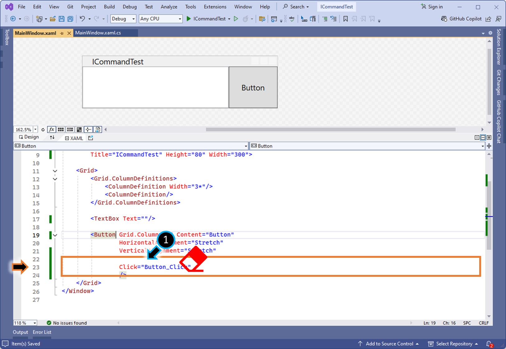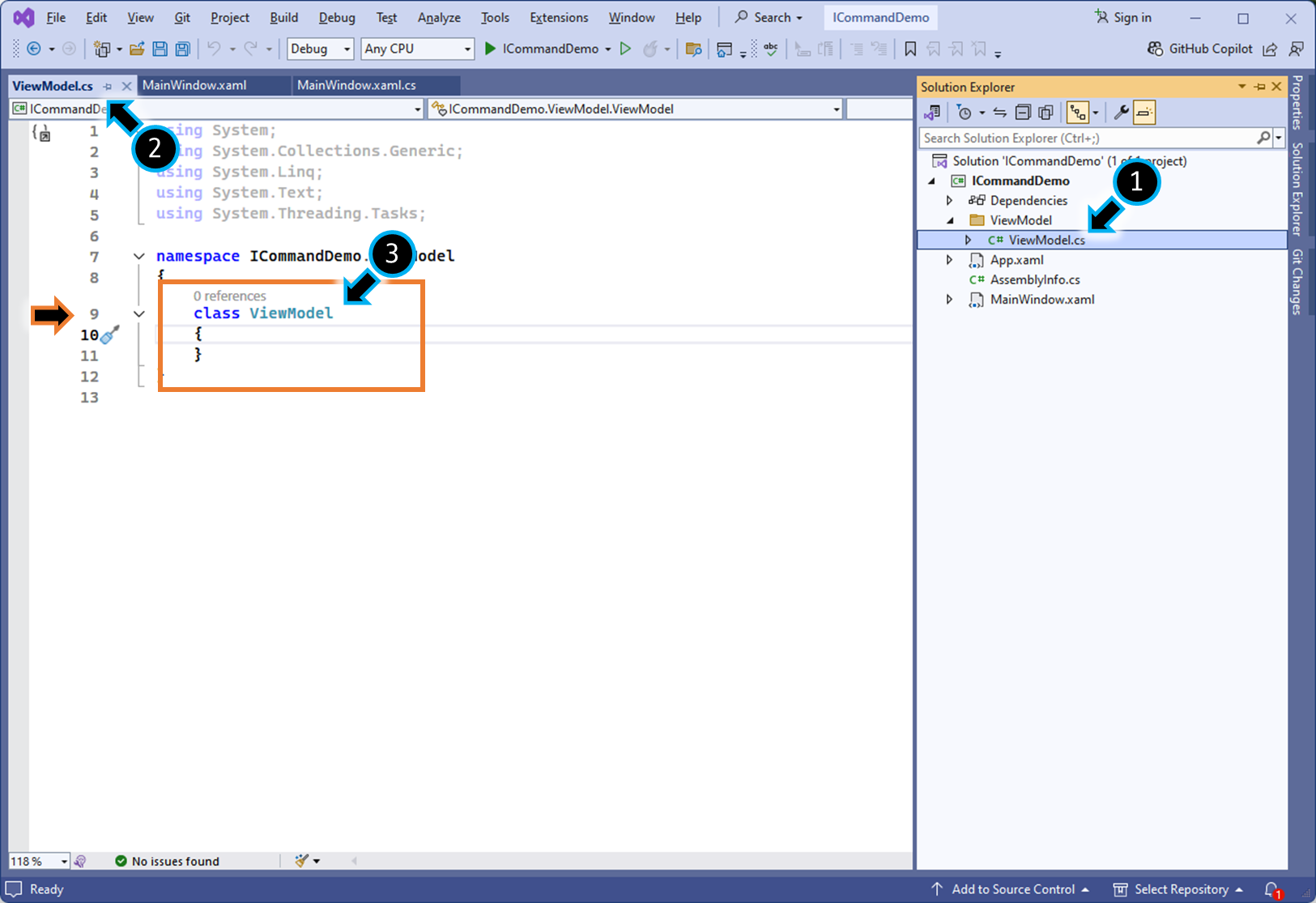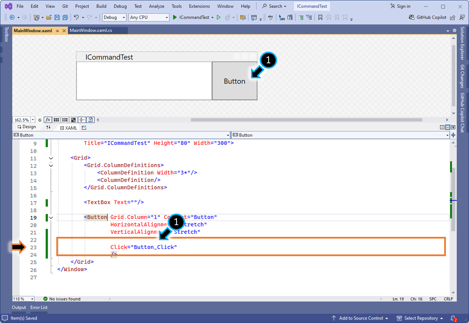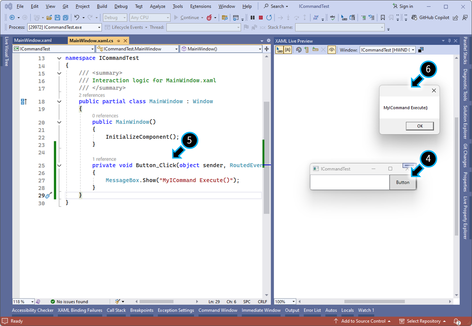 (1) ViewModel 로직에 ICommand 구현체를 만들고, 원하는 메서드를 등록합니다.