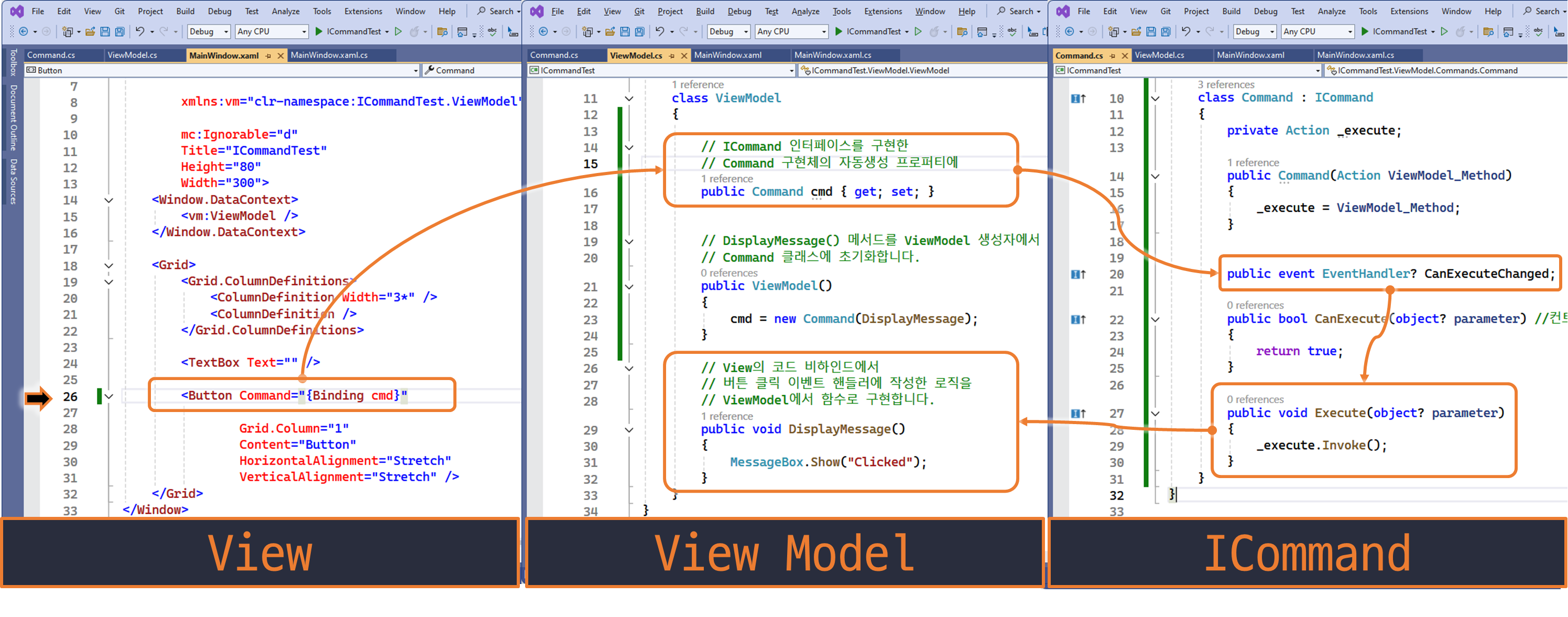 - 방법: ICommand 인터페이스의 Execute( ) 함수의 구현부에, 이벤트 핸들러 로직을 구현해 대신 사용할 수 있습니다.