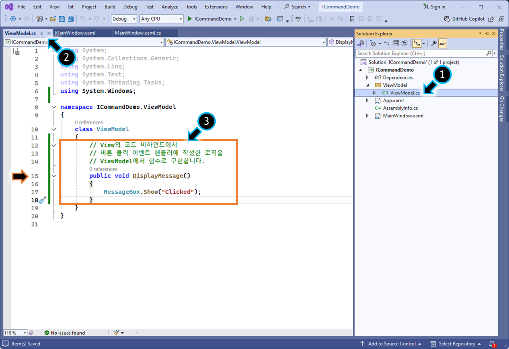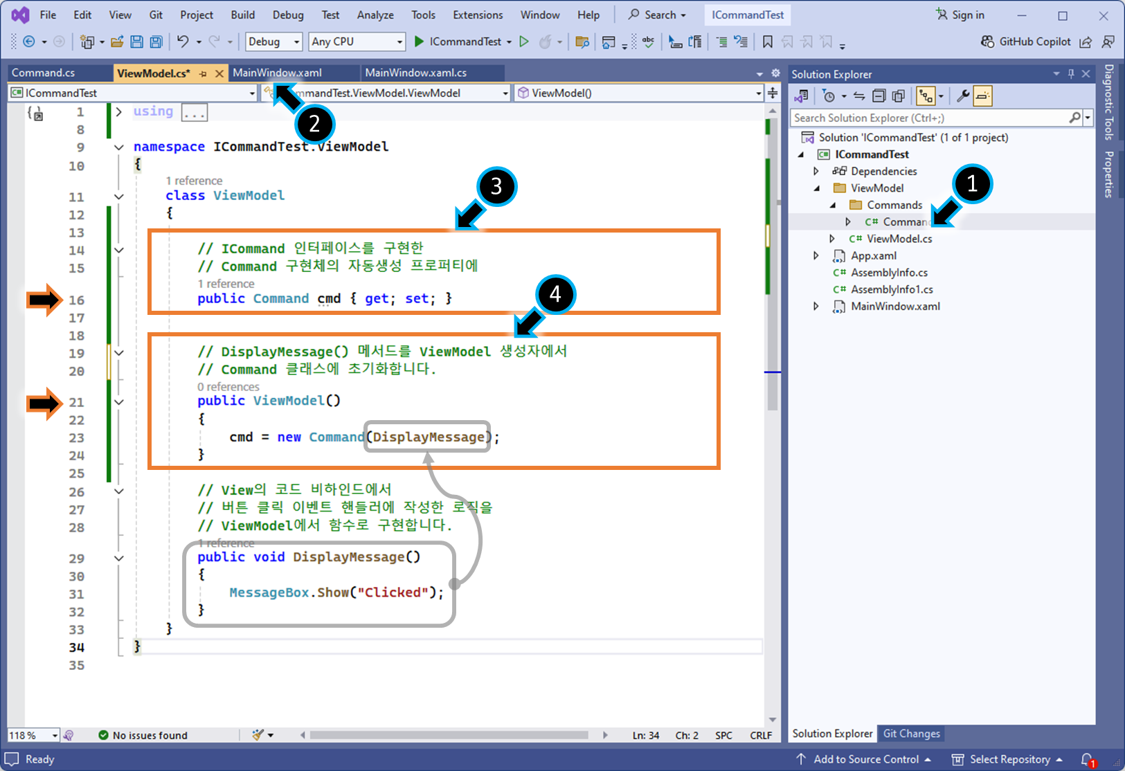 MainViewModel 생성자에, Command 클래스에 DisplayMessage( ) 메서드를 할당합니다.