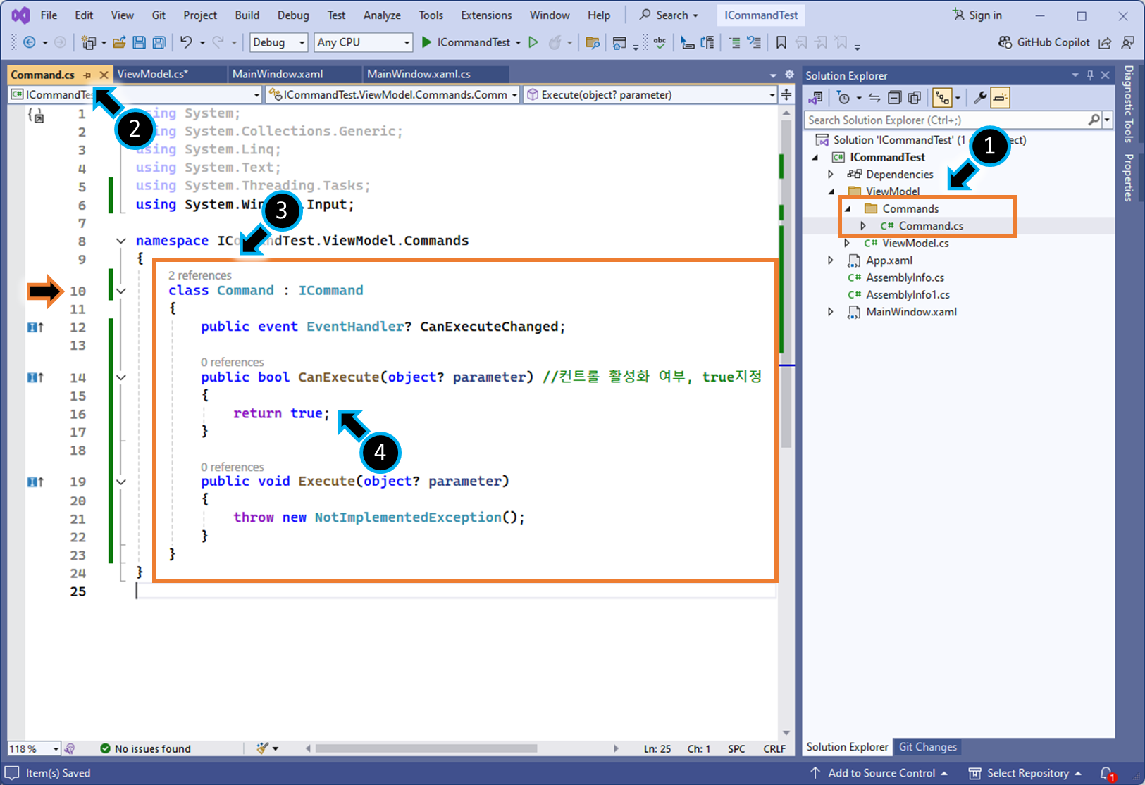 (4) CanExecute( ) 메서드의 반환값을 true로 지정합니다. (편의를 위해)