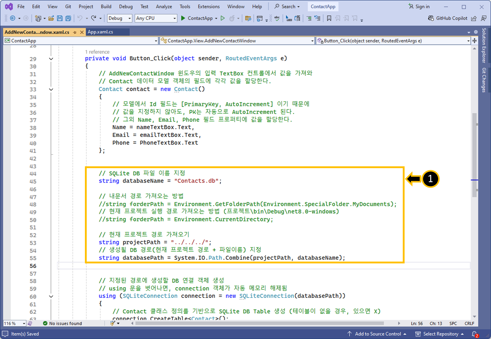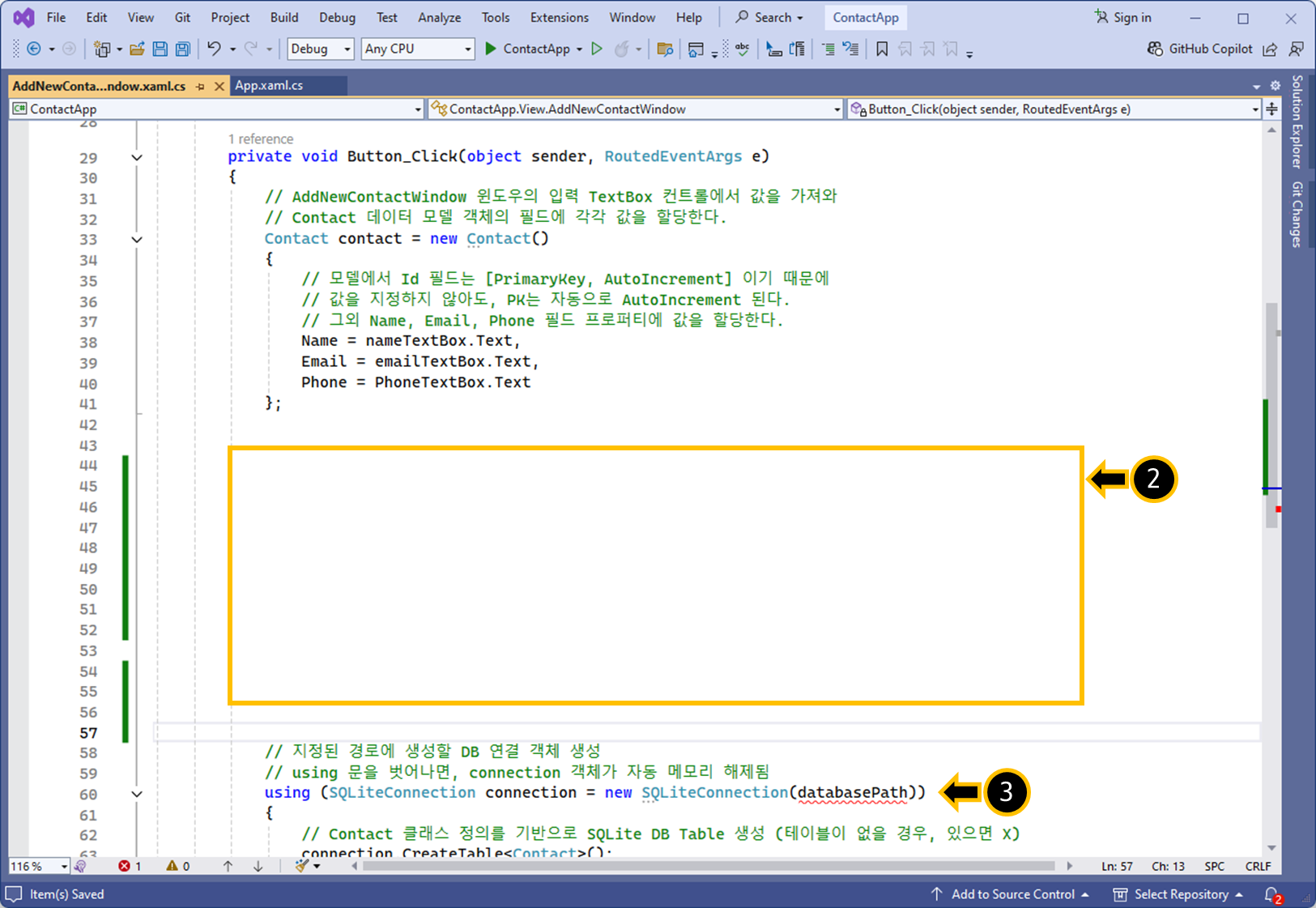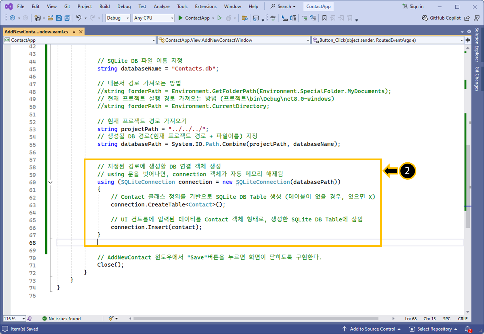 // UI 컨트롤에 입력된 데이터를 Contact 객체 형태로, 생성한 SQLite DB Table에 삽입