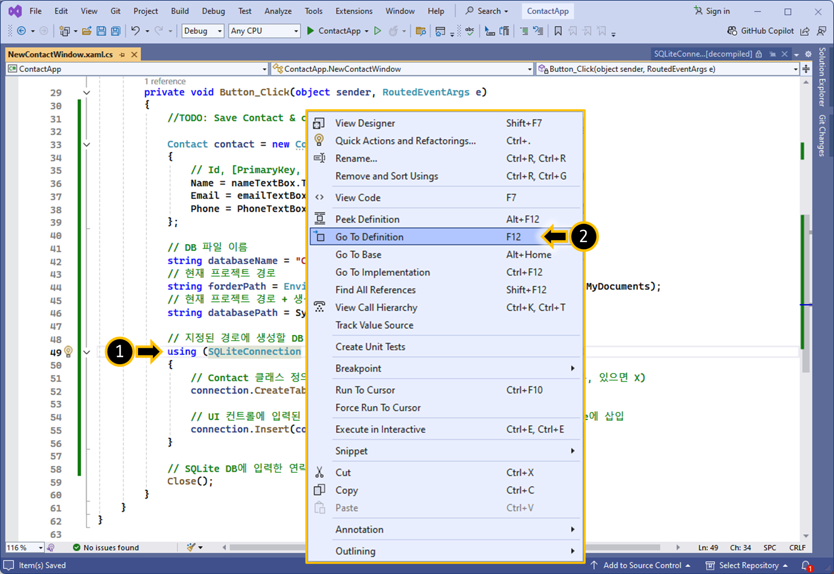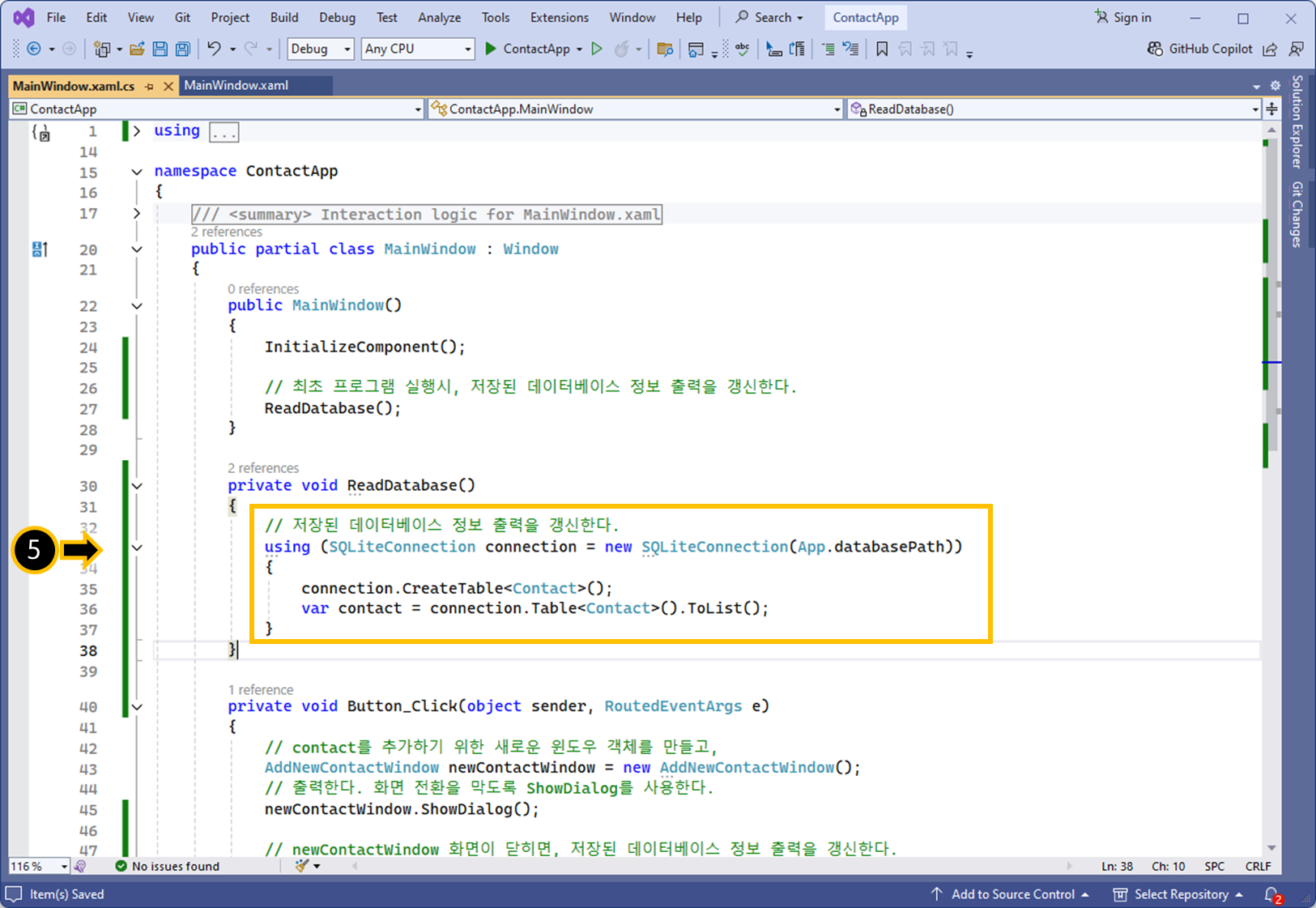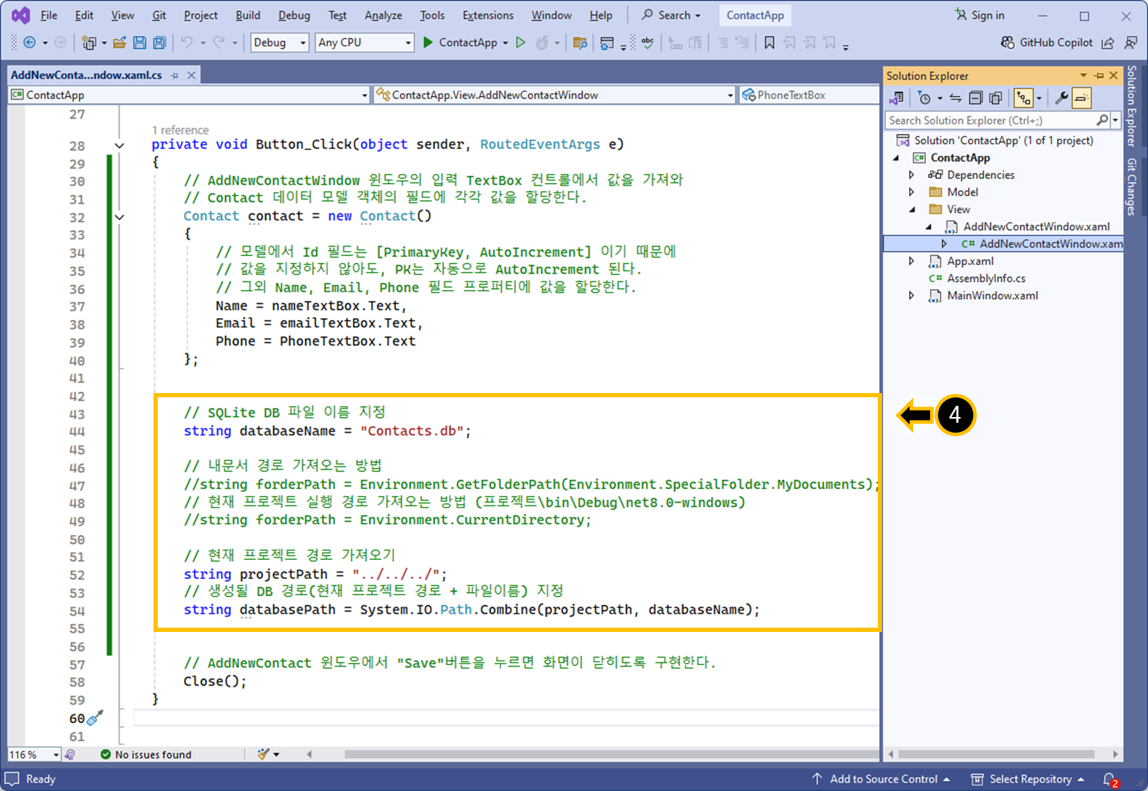 // UI 컨트롤에 입력된 데이터를 Contact 객체 형태로, 생성한 SQLite DB Table에 삽입