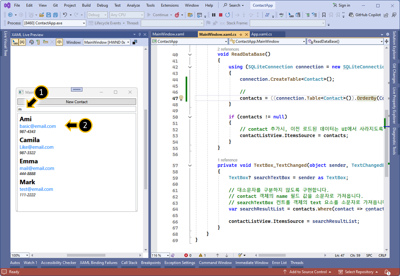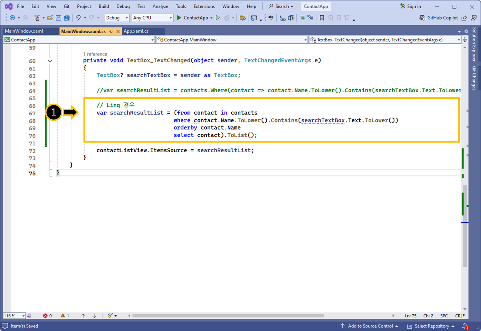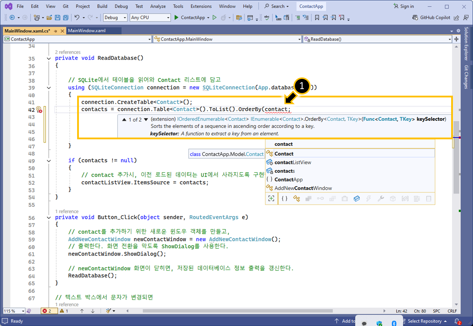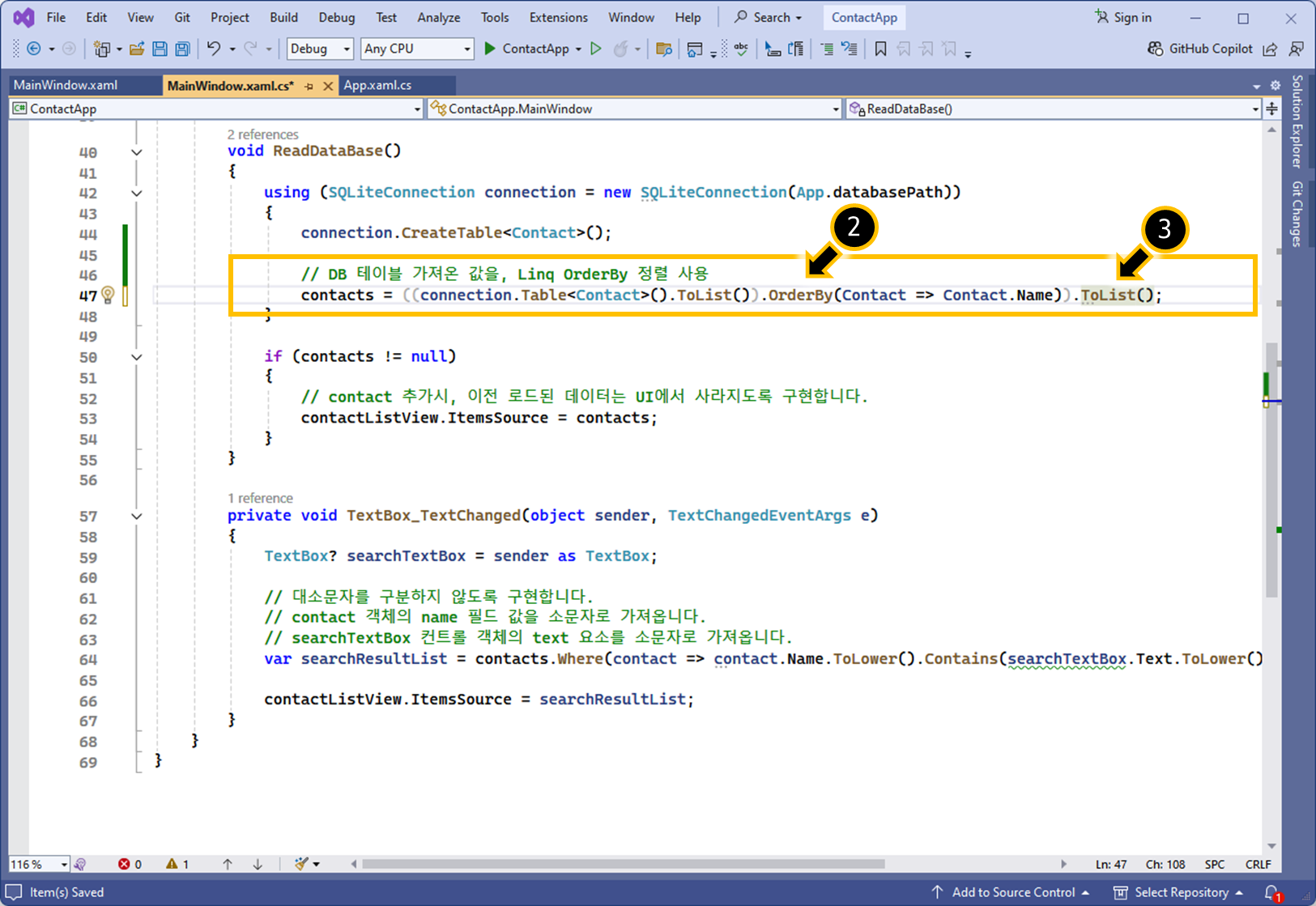 35. Linq 2024.12.11 01:19 C# - WPF/03 01. 더보기 1. contacts = (connection.Table<Contact>().ToList().OrderBy(contact => contact.Name)).ToList(); 2. 02. 더보기 1. // Linq 경우 var searchResultList = (from contact in contacts where contact.Name.ToLower().Contains(searchTextBox.Text.ToLower()) orderby contact.Name select contact).ToList(); 03. 더보기 15. ContactApp.zip 0.08MB 공유하기 게시글 관리 BasicLike 댓글 공유하기 다른 글 댓글 이 글 공유하기 구독하기 구독하기 카카오톡 카카오톡 라인 라인 트위터 트위터 Facebook Facebook 카카오스토리 카카오스토리 밴드 밴드 네이버 블로그 네이버 블로그 Pocket Pocket Evernote Evernote 다른 글 37. UserControl 37. UserControl 2024.12.11 36. SQLite Update, Delete 36. SQLite Update, Delete 2024.12.11 34. ListView - 2 34. ListView - 2 2024.12.11 33. ListView - 1 33. ListView - 1 2024.12.10 다른 글 더 둘러보기