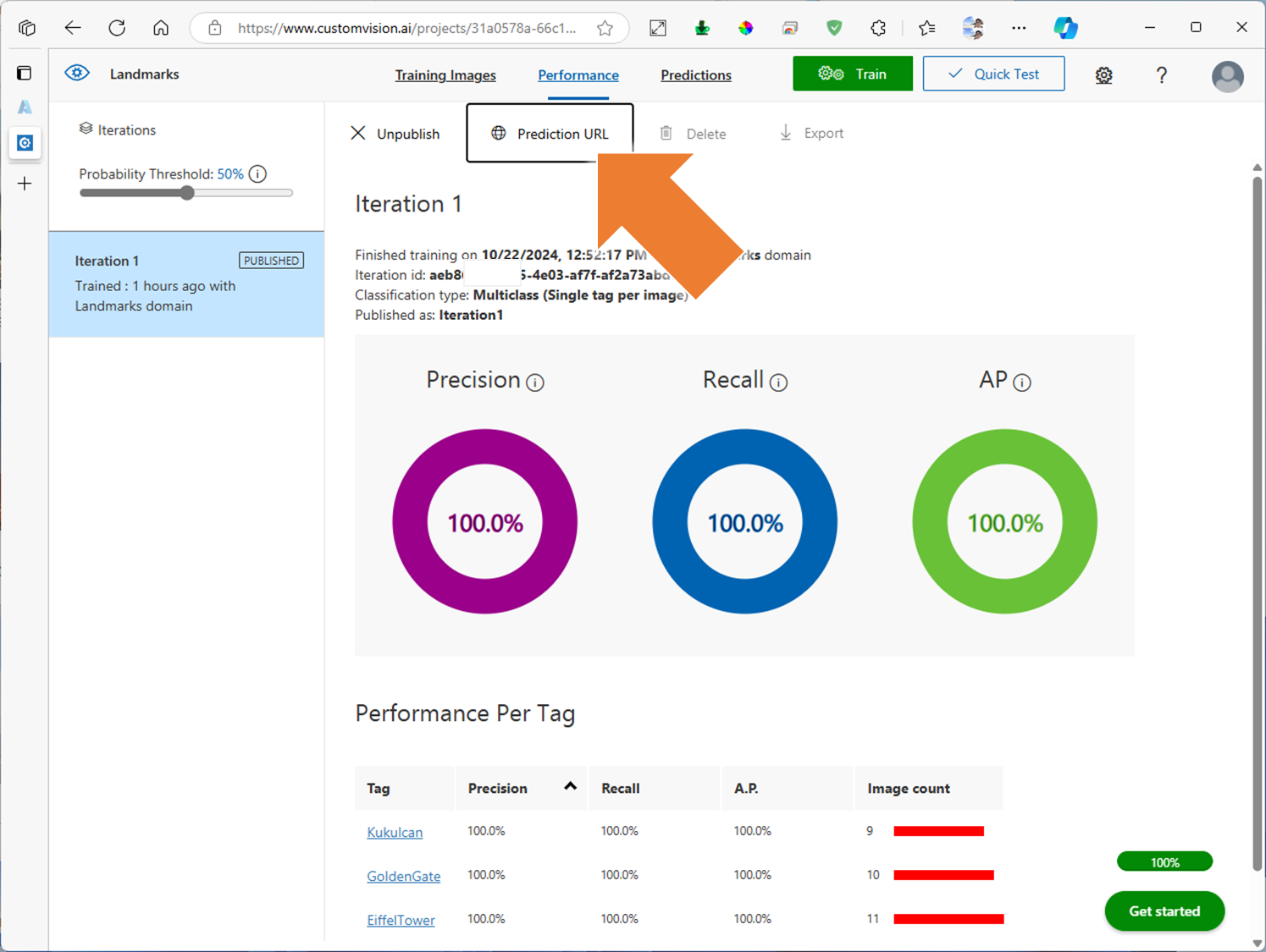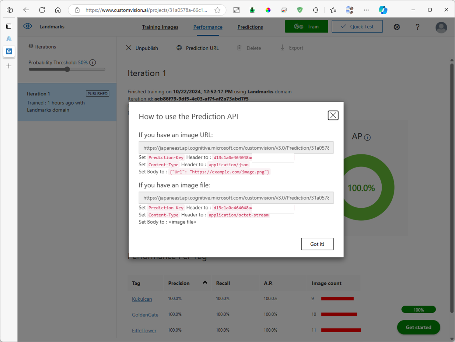 5. 학습한 Custom Vision 모델 API 링크 확인하기