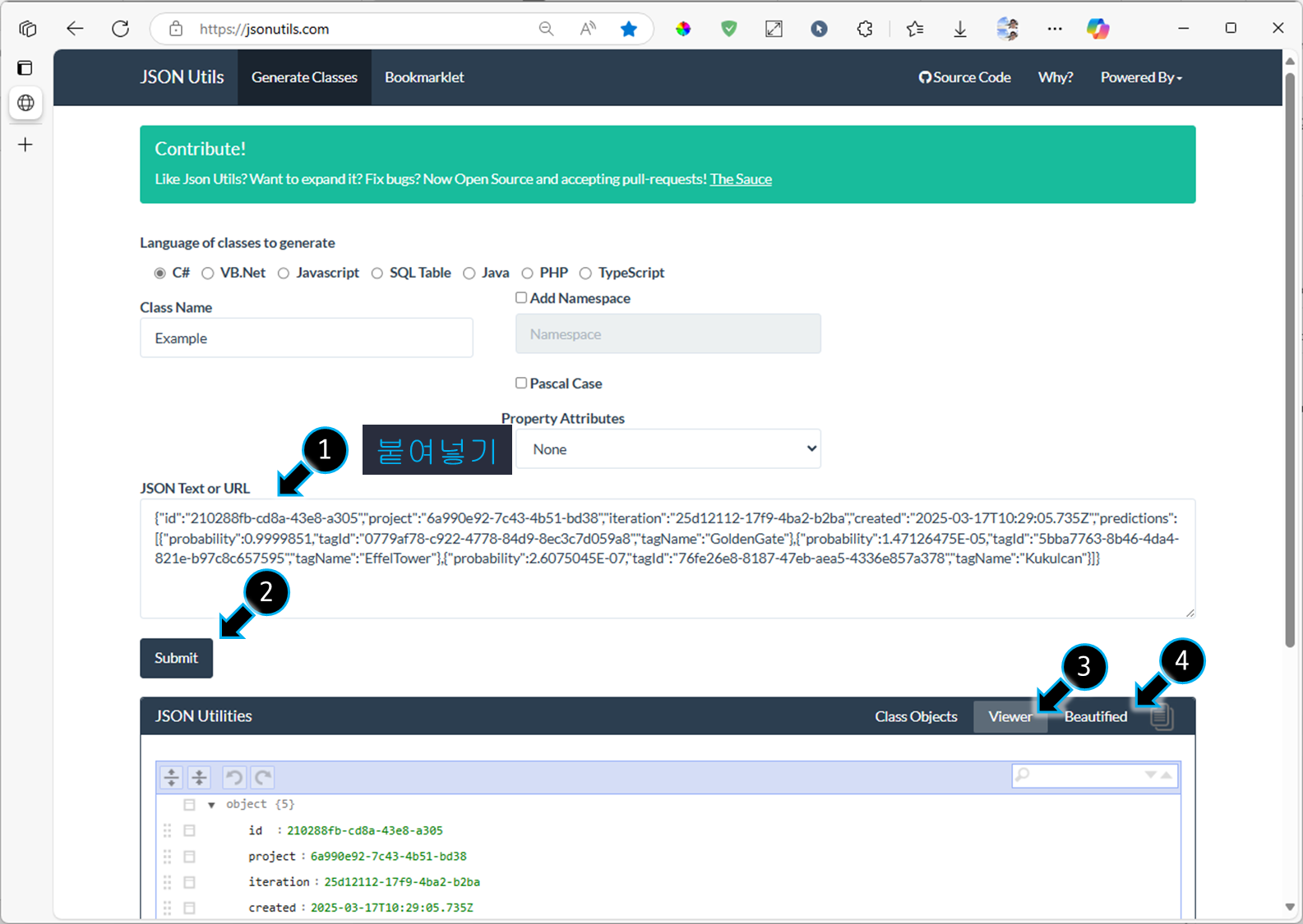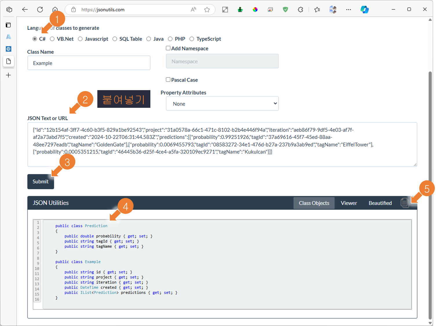 2. JSON Utils: Generate C#, VB.Net, SQL TAble and Java from JSON(새창) 접속