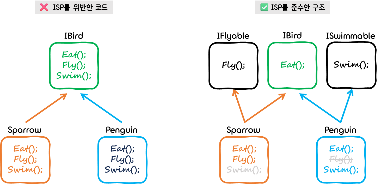 Console.WriteLine("참새는 수영할 수 없다."); // ❌ 잘못된 구현 → ISP 위반