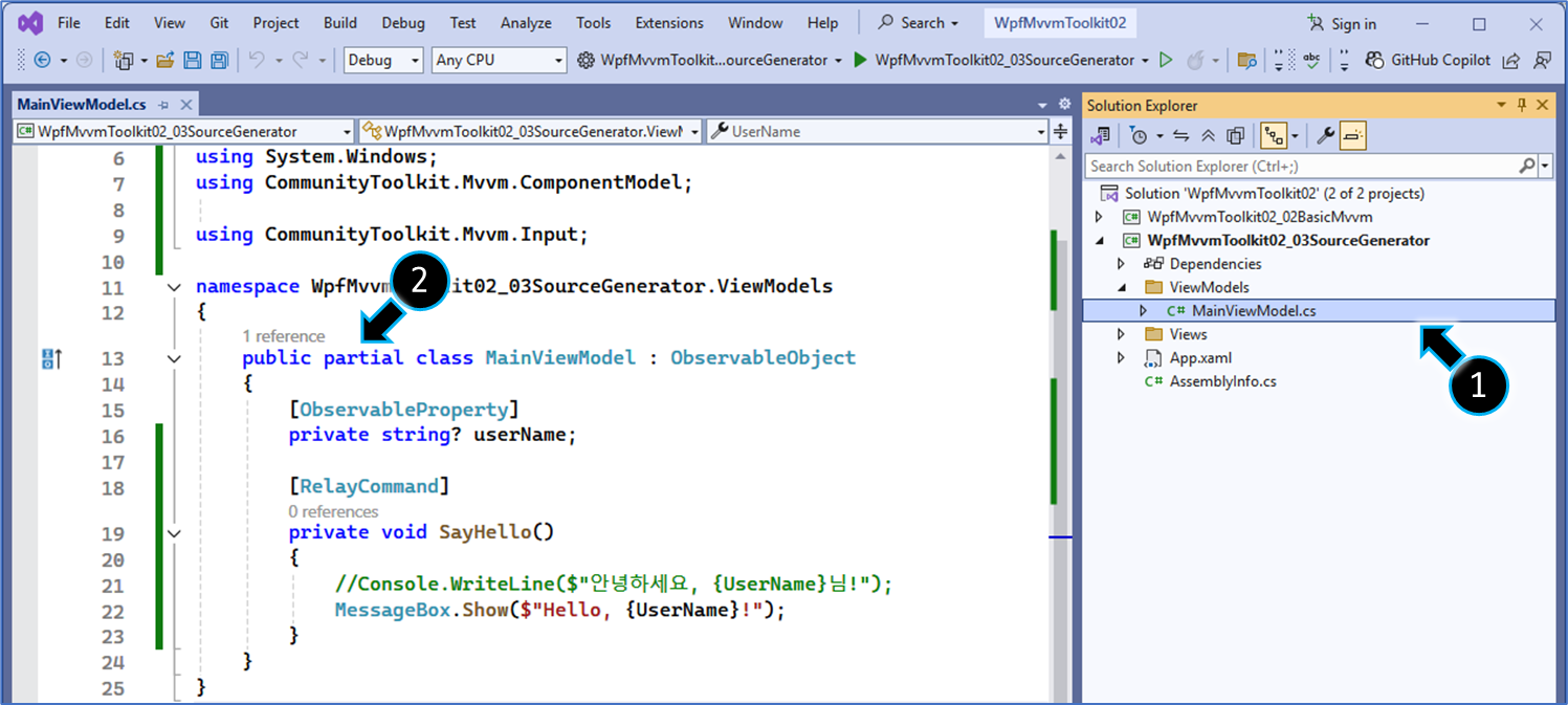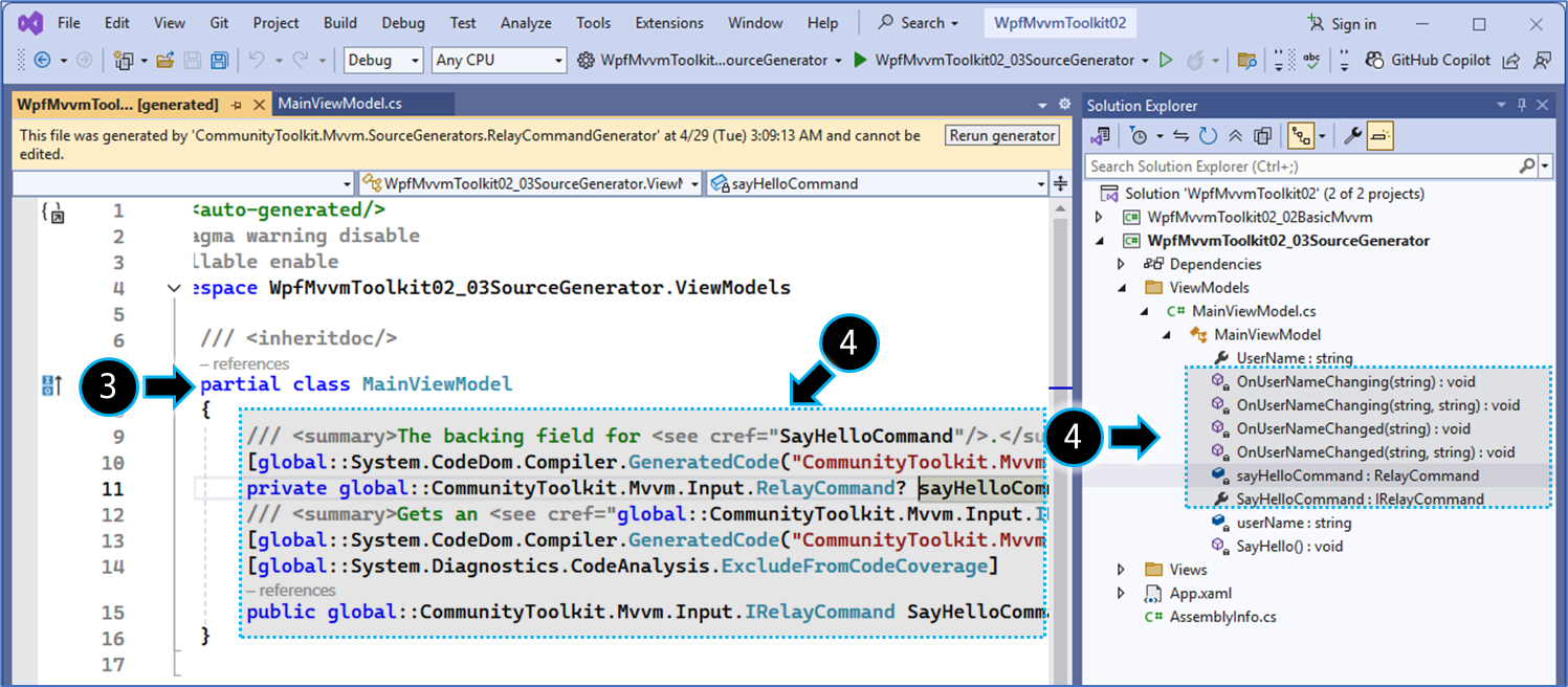 // Source Generator가 자동으로 생성하는 코드(예: UserName 속성, ShowGreetingCommand 명령)를