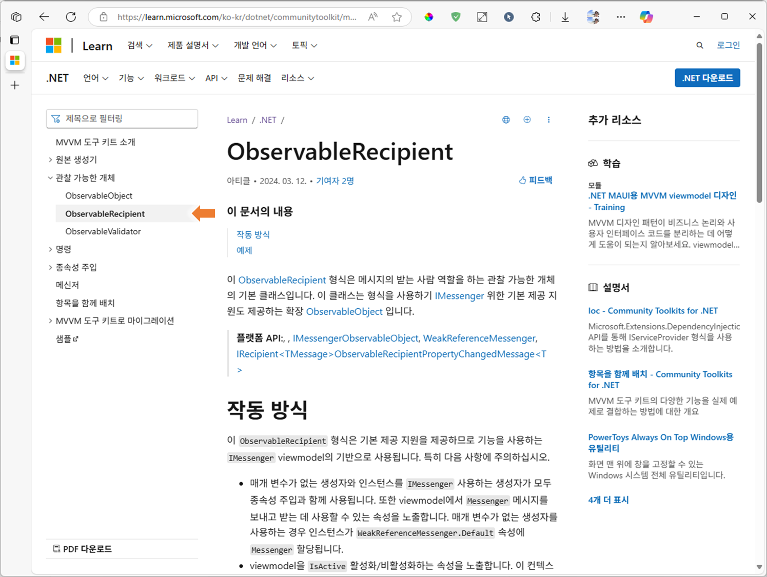 공유한 링크는 .NET Community Toolkit의 ObservableRecipient 클래스에 대한 문서입니다.