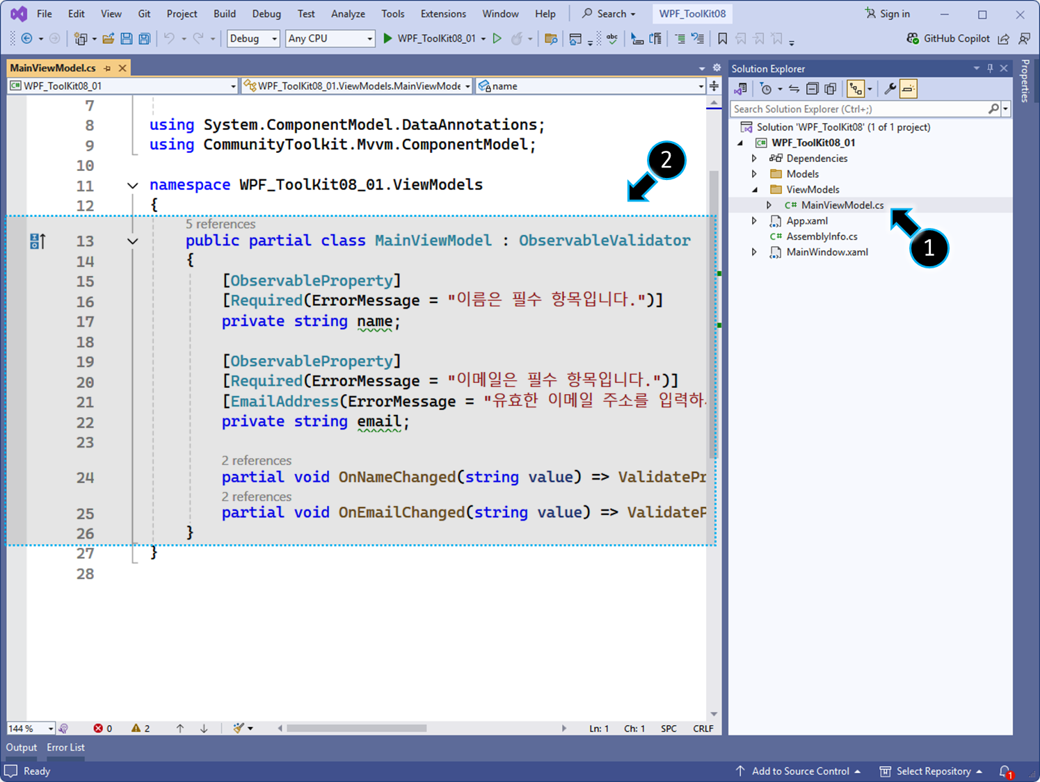 관련 어노테이션: [ObservableProperty], [Required], [MinLength], [MaxLength], [EmailAddress] 등