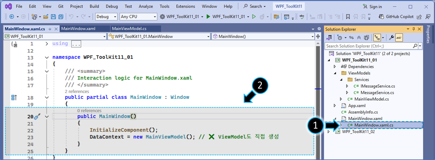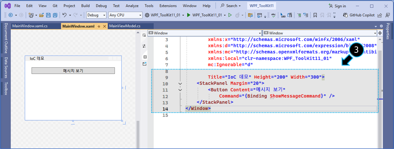 - Service, ViewModel, App.xaml.cs, MainWindow.xaml을 모두 작성한다.