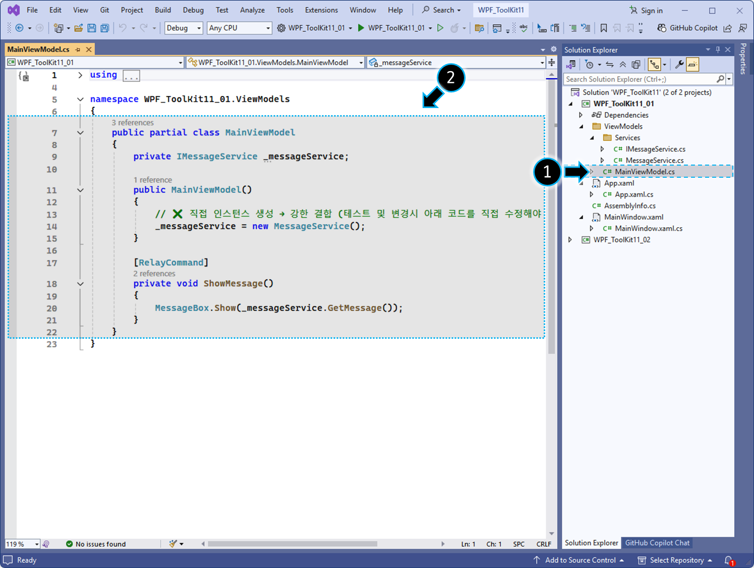 - (참고) 이 예는 IoC 없이 ViewModel 내부에서 서비스 객체를 직접 생성하는 방식을 설명하며,