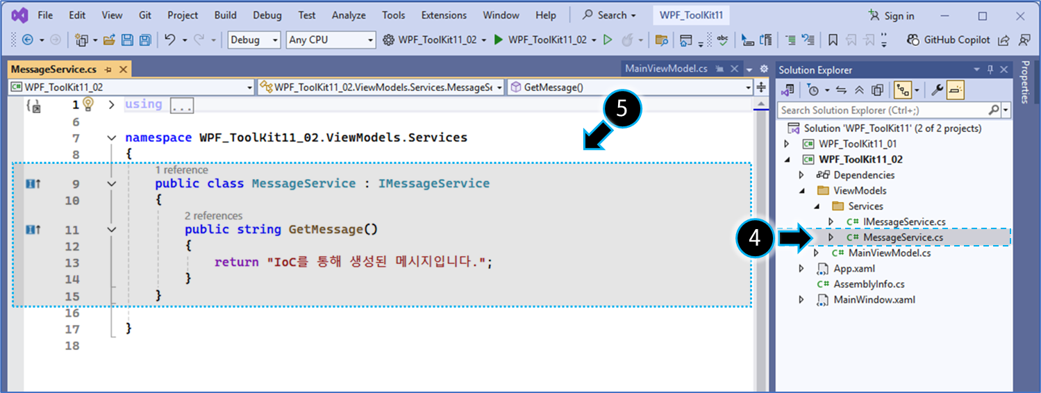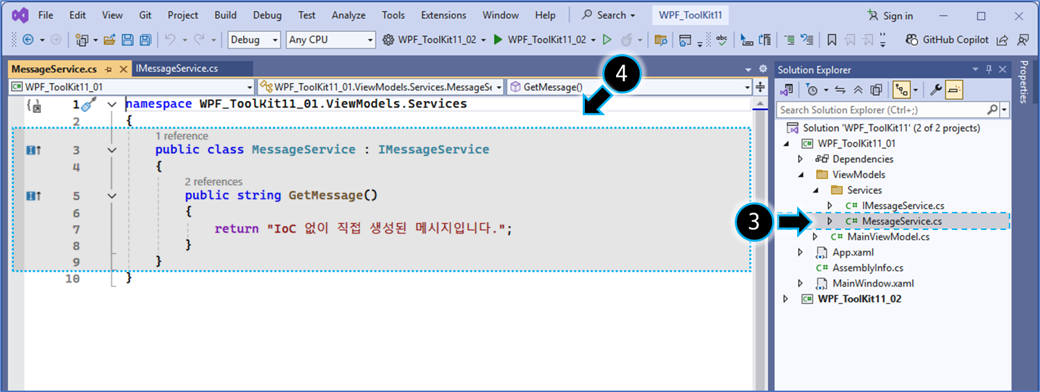 - (참고) 이 예제는, 위 IoC 없이 ViewModel 내부에서 서비스 객체를 직접 생성하는 방식과 비교를 목적으로 합니다.