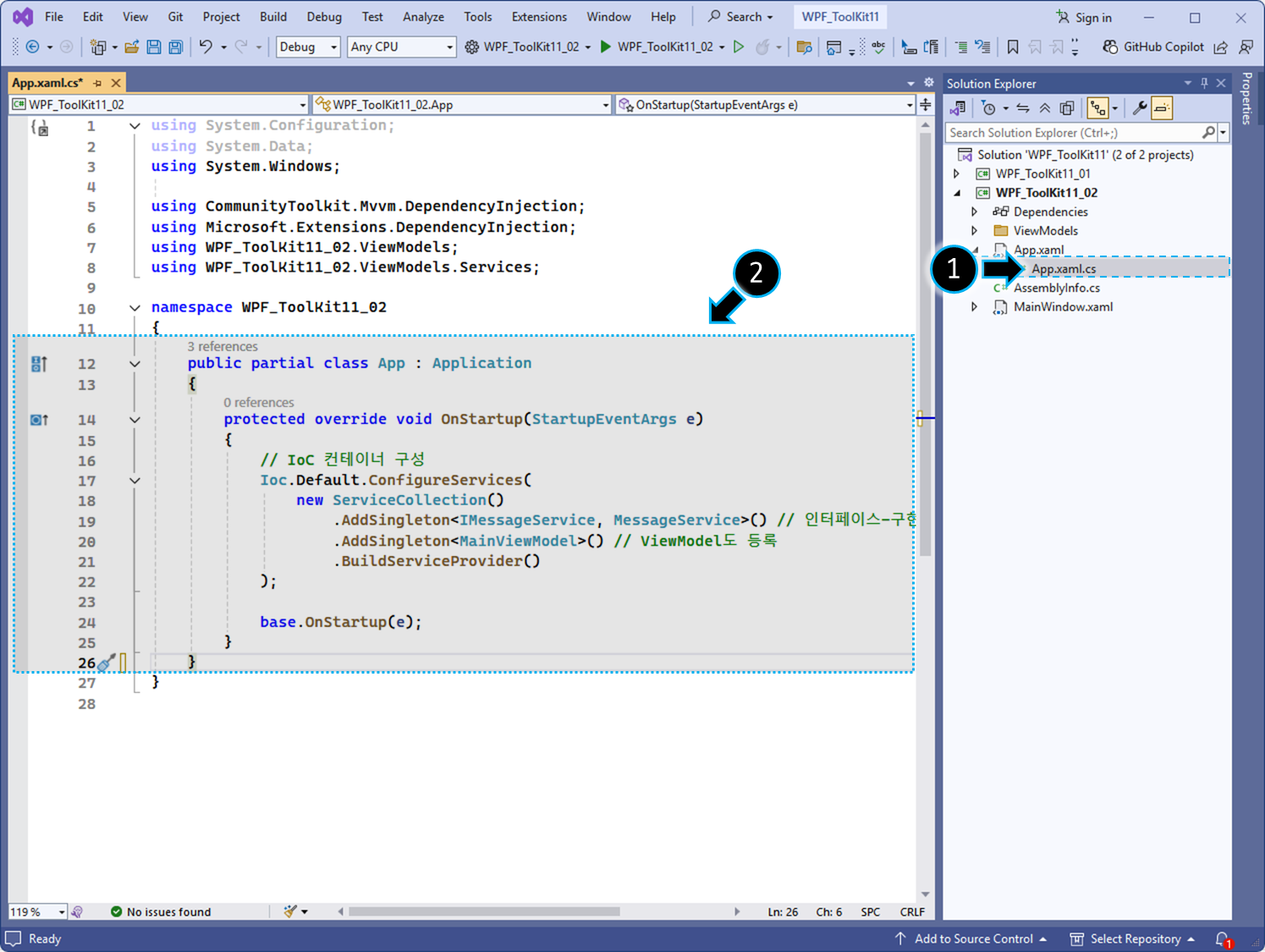 // CommunityToolkit.Mvvm 패키지의 Ioc.Default를 활용하여 의존성 주입(DI)을 구성합니다.