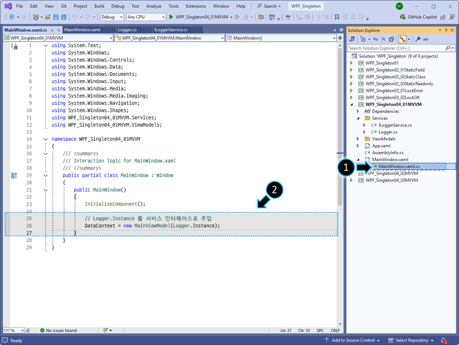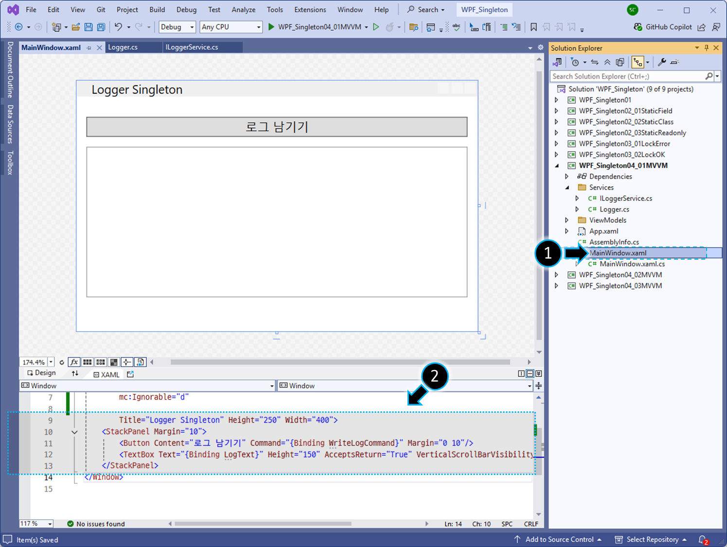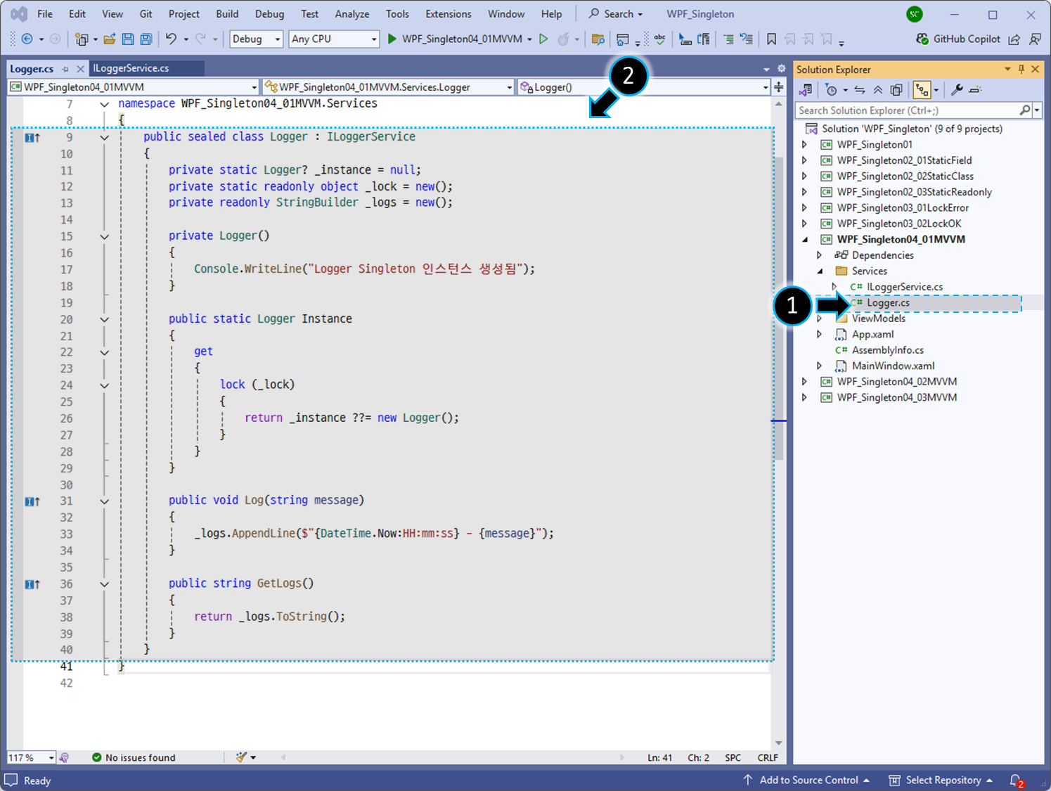 - MVVM에서 Logger.Instance를 직접 참조하지 않고, 인터페이스 기반으로 느슨한 결합을 유지합니다.