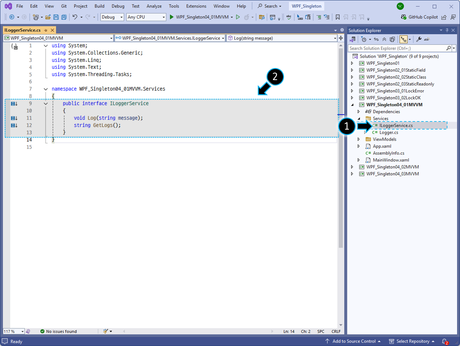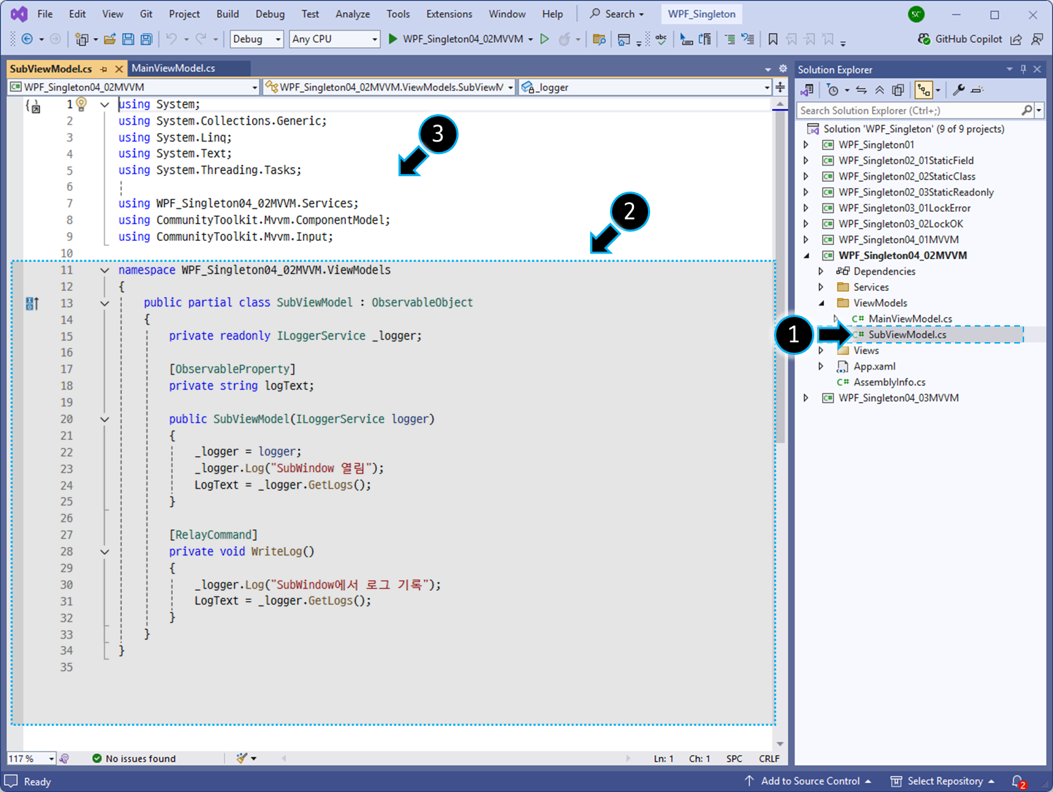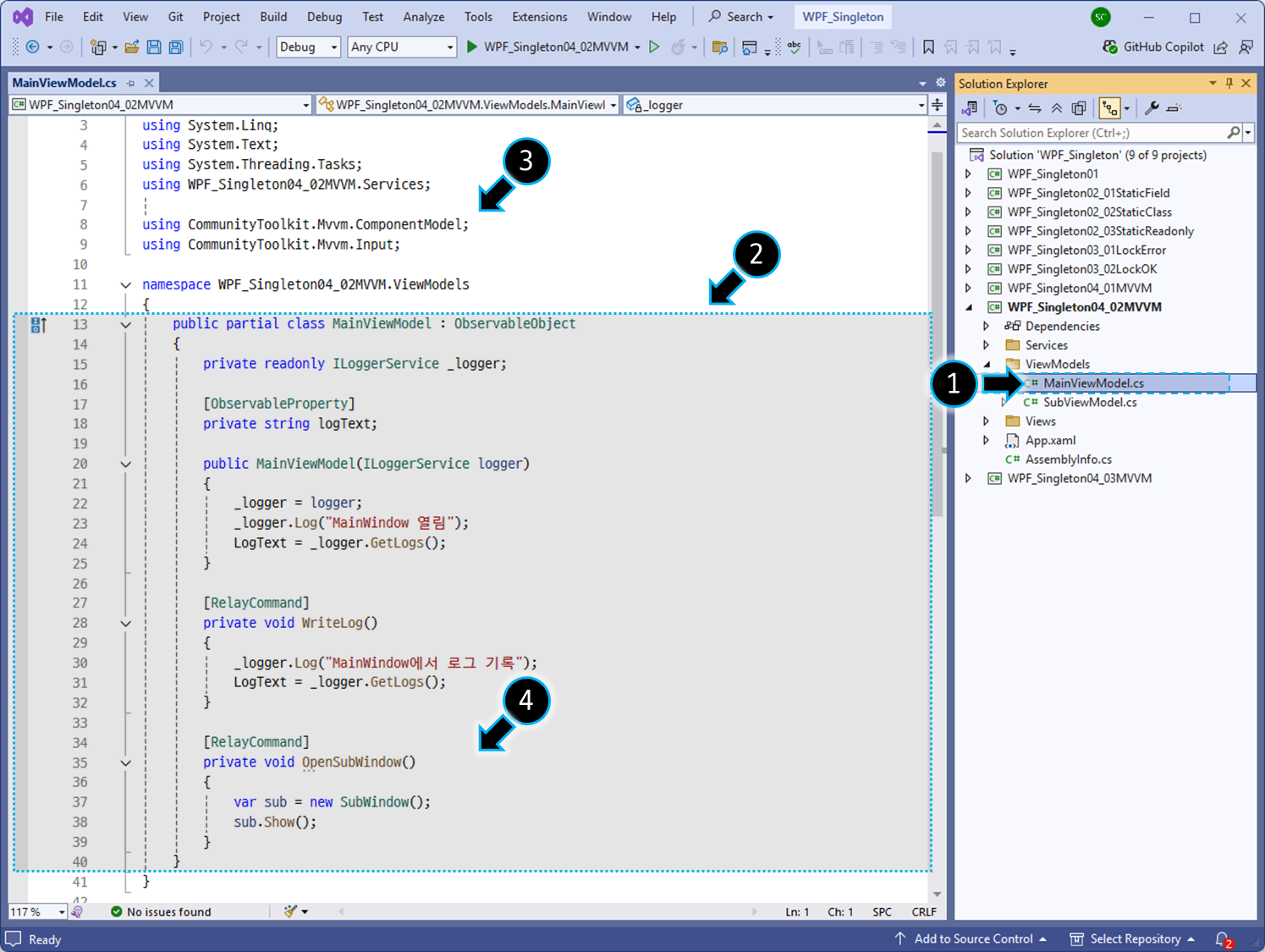 - MVVM에서 Logger.Instance를 직접 참조하지 않고, 인터페이스 기반으로 느슨한 결합을 유지합니다.