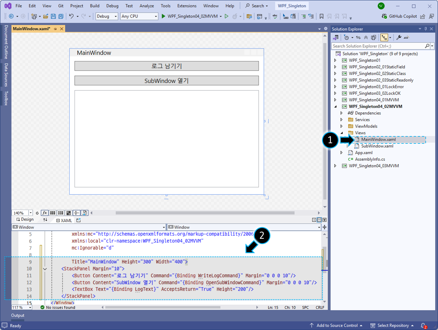 <Button Content="로그 남기기" Command="{Binding WriteLogCommand}" Margin="0 0 0 10"/>