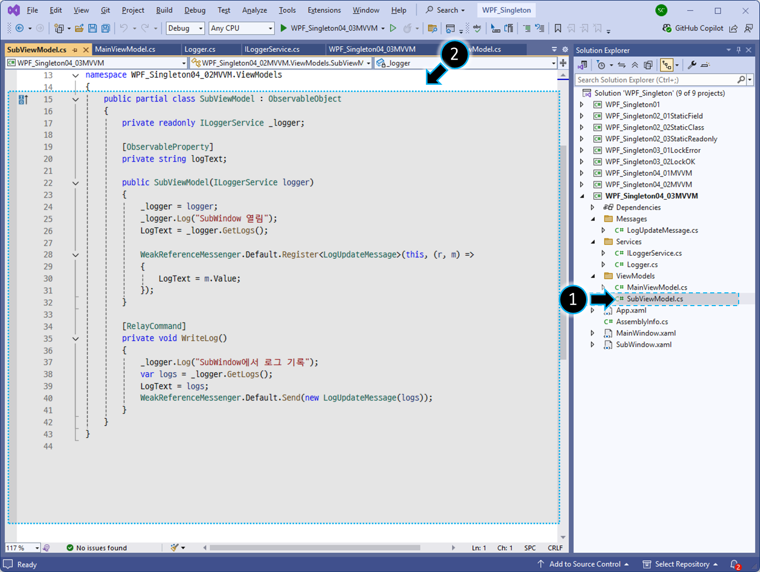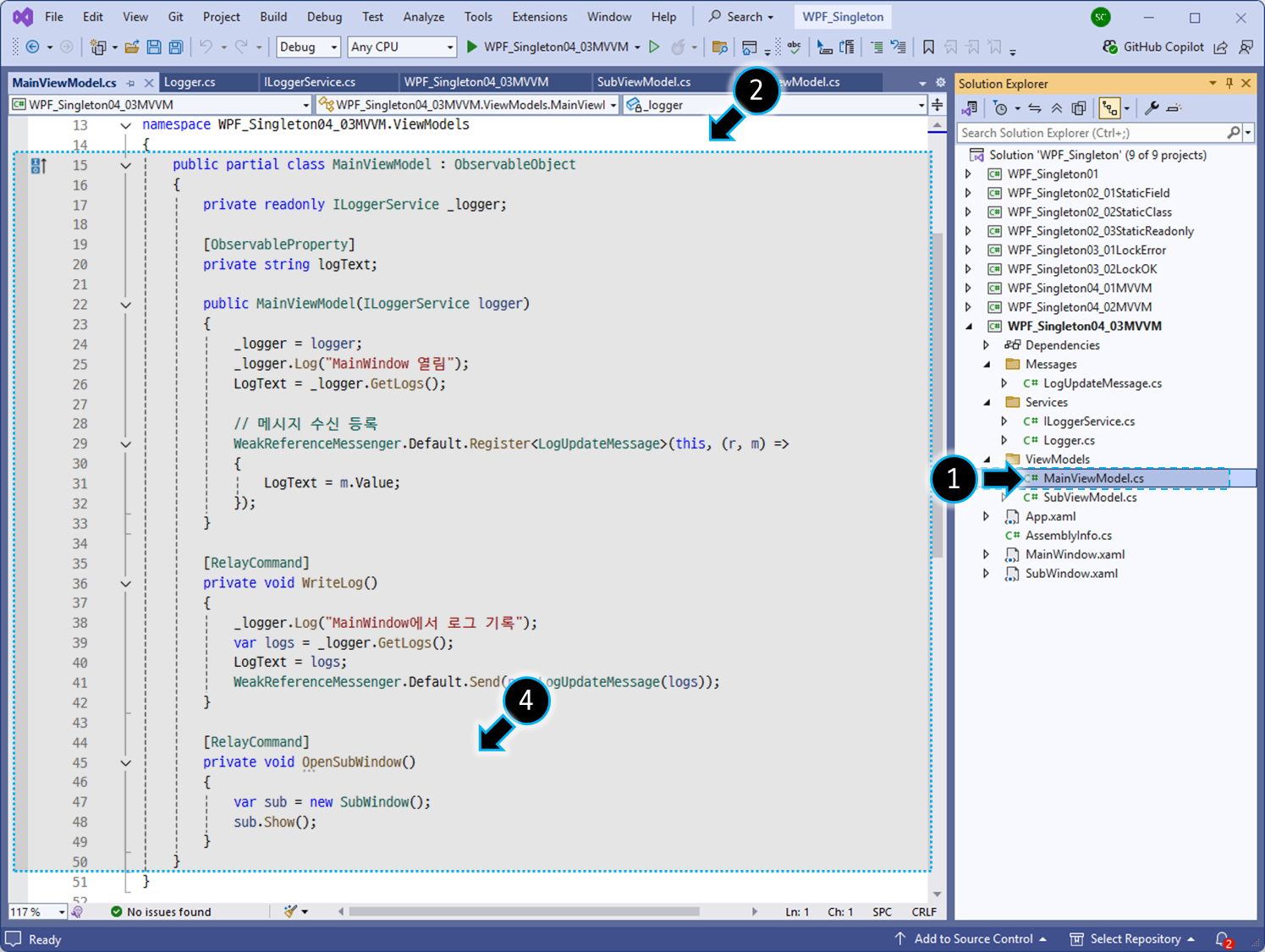 - MVVM에서 Logger.Instance를 직접 참조하지 않고, 인터페이스 기반으로 느슨한 결합을 유지합니다.