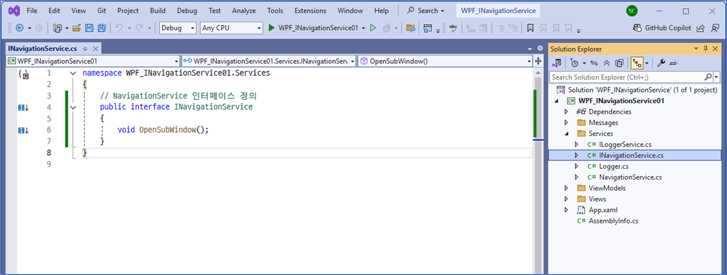 • INavigationService를 정의하고 NavigationService에서 SubWindow 열기 기능 구현